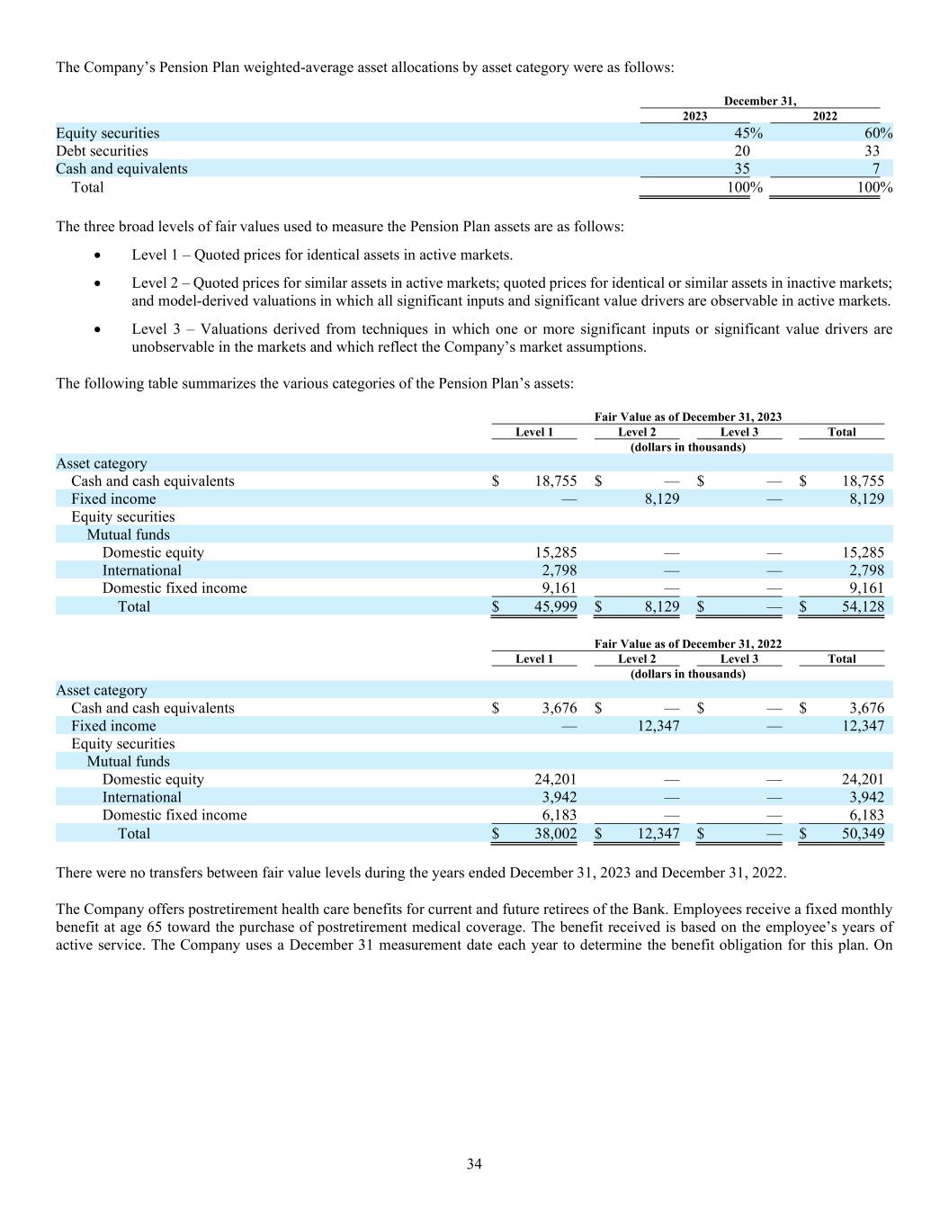 34 The Company’s Pension Plan weighted-average asset allocations by asset category were as follows: December 31, 2023 2022 Equity securities 45% 60% Debt securities 20 33 Cash and equivalents 35 7 Total 100% 100% The three broad levels of fair values used to measure the Pension Plan assets are as follows:  Level 1 – Quoted prices for identical assets in active markets.  Level 2 – Quoted prices for similar assets in active markets; quoted prices for identical or similar assets in inactive markets; and model-derived valuations in which all significant inputs and significant value drivers are observable in active markets.  Level 3 – Valuations derived from techniques in which one or more significant inputs or significant value drivers are unobservable in the markets and which reflect the Company’s market assumptions. The following table summarizes the various categories of the Pension Plan’s assets: Fair Value as of December 31, 2023 Level 1 Level 2 Level 3 Total (dollars in thousands) Asset category Cash and cash equivalents $ 18,755 $ — $ — $ 18,755 Fixed income — 8,129 — 8,129 Equity securities Mutual funds Domestic equity 15,285 — — 15,285 International 2,798 — — 2,798 Domestic fixed income 9,161 — — 9,161 Total $ 45,999 $ 8,129 $ — $ 54,128 Fair Value as of December 31, 2022 Level 1 Level 2 Level 3 Total (dollars in thousands) Asset category Cash and cash equivalents $ 3,676 $ — $ — $ 3,676 Fixed income — 12,347 — 12,347 Equity securities Mutual funds Domestic equity 24,201 — — 24,201 International 3,942 — — 3,942 Domestic fixed income 6,183 — — 6,183 Total $ 38,002 $ 12,347 $ — $ 50,349 There were no transfers between fair value levels during the years ended December 31, 2023 and December 31, 2022. The Company offers postretirement health care benefits for current and future retirees of the Bank. Employees receive a fixed monthly benefit at age 65 toward the purchase of postretirement medical coverage. The benefit received is based on the employee’s years of active service. The Company uses a December 31 measurement date each year to determine the benefit obligation for this plan. On