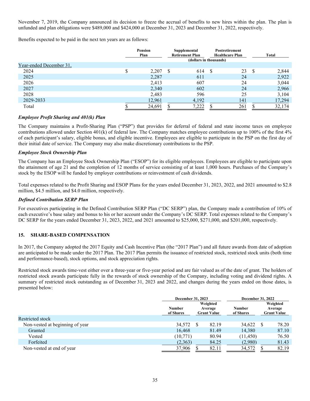 35 November 7, 2019, the Company announced its decision to freeze the accrual of benefits to new hires within the plan. The plan is unfunded and plan obligations were $489,000 and $424,000 at December 31, 2023 and December 31, 2022, respectively. Benefits expected to be paid in the next ten years are as follows: Pension Plan Supplemental Retirement Plan Postretirement Healthcare Plan Total (dollars in thousands) Year-ended December 31, 2024 $ 2,207 $ 614 $ 23 $ 2,844 2025 2,287 611 24 2,922 2026 2,413 607 24 3,044 2027 2,340 602 24 2,966 2028 2,483 596 25 3,104 2029-2033 12,961 4,192 141 17,294 Total $ 24,691 $ 7,222 $ 261 $ 32,174 Employee Profit Sharing and 401(k) Plan The Company maintains a Profit-Sharing Plan (“PSP”) that provides for deferral of federal and state income taxes on employee contributions allowed under Section 401(k) of federal law. The Company matches employee contributions up to 100% of the first 4% of each participant’s salary, eligible bonus, and eligible incentive. Employees are eligible to participate in the PSP on the first day of their initial date of service. The Company may also make discretionary contributions to the PSP. Employee Stock Ownership Plan The Company has an Employee Stock Ownership Plan (“ESOP”) for its eligible employees. Employees are eligible to participate upon the attainment of age 21 and the completion of 12 months of service consisting of at least 1,000 hours. Purchases of the Company’s stock by the ESOP will be funded by employer contributions or reinvestment of cash dividends. Total expenses related to the Profit Sharing and ESOP Plans for the years ended December 31, 2023, 2022, and 2021 amounted to $2.8 million, $4.5 million, and $4.0 million, respectively. Defined Contribution SERP Plan For executives participating in the Defined Contribution SERP Plan (“DC SERP”) plan, the Company made a contribution of 10% of each executive’s base salary and bonus to his or her account under the Company’s DC SERP. Total expenses related to the Company’s DC SERP for the years ended December 31, 2023, 2022, and 2021 amounted to $25,000, $271,000, and $201,000, respectively. 15. SHARE-BASED COMPENSATION In 2017, the Company adopted the 2017 Equity and Cash Incentive Plan (the “2017 Plan”) and all future awards from date of adoption are anticipated to be made under the 2017 Plan. The 2017 Plan permits the issuance of restricted stock, restricted stock units (both time and performance-based), stock options, and stock appreciation rights. Restricted stock awards time-vest either over a three-year or five-year period and are fair valued as of the date of grant. The holders of restricted stock awards participate fully in the rewards of stock ownership of the Company, including voting and dividend rights. A summary of restricted stock outstanding as of December 31, 2023 and 2022, and changes during the years ended on those dates, is presented below: December 31, 2023 December 31, 2022 Number of Shares Weighted Average Grant Value Number of Shares Weighted Average Grant Value Restricted stock Non-vested at beginning of year 34,572 $ 82.19 34,622 $ 78.20 Granted 16,468 81.49 14,380 87.10 Vested (10,771) 80.94 (11,450) 76.50 Forfeited (2,363) 84.25 (2,980) 81.43 Non-vested at end of year 37,906 $ 82.11 34,572 $ 82.19