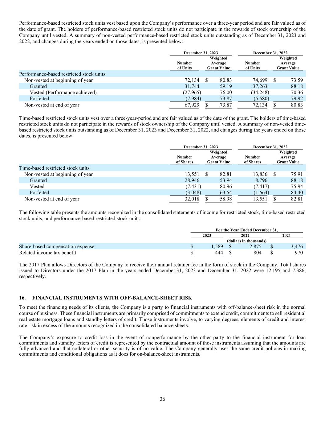 36 Performance-based restricted stock units vest based upon the Company’s performance over a three-year period and are fair valued as of the date of grant. The holders of performance-based restricted stock units do not participate in the rewards of stock ownership of the Company until vested. A summary of non-vested performance-based restricted stock units outstanding as of December 31, 2023 and 2022, and changes during the years ended on those dates, is presented below: December 31, 2023 December 31, 2022 Number of Units Weighted Average Grant Value Number of Units Weighted Average Grant Value Performance-based restricted stock units Non-vested at beginning of year 72,134 $ 80.83 74,699 $ 73.59 Granted 31,744 59.19 37,263 88.18 Vested (Performance achieved) (27,965) 76.00 (34,248) 70.36 Forfeited (7,984) 73.87 (5,580) 79.92 Non-vested at end of year 67,929 $ 73.87 72,134 $ 80.83 Time-based restricted stock units vest over a three-year-period and are fair valued as of the date of the grant. The holders of time-based restricted stock units do not participate in the rewards of stock ownership of the Company until vested. A summary of non-vested time- based restricted stock units outstanding as of December 31, 2023 and December 31, 2022, and changes during the years ended on those dates, is presented below: December 31, 2023 December 31, 2022 Number of Shares Weighted Average Grant Value Number of Shares Weighted Average Grant Value Time-based restricted stock units Non-vested at beginning of year 13,551 $ 82.81 13,836 $ 75.91 Granted 28,946 53.94 8,796 88.18 Vested (7,431) 80.96 (7,417) 75.94 Forfeited (3,048) 63.54 (1,664) 84.40 Non-vested at end of year 32,018 $ 58.98 13,551 $ 82.81 The following table presents the amounts recognized in the consolidated statements of income for restricted stock, time-based restricted stock units, and performance-based restricted stock units: For the Year Ended December 31, 2023 2022 2021 (dollars in thousands) Share-based compensation expense $ 1,589 $ 2,875 $ 3,476 Related income tax benefit $ 444 $ 804 $ 970 The 2017 Plan allows Directors of the Company to receive their annual retainer fee in the form of stock in the Company. Total shares issued to Directors under the 2017 Plan in the years ended December 31, 2023 and December 31, 2022 were 12,195 and 7,386, respectively. 16. FINANCIAL INSTRUMENTS WITH OFF-BALANCE-SHEET RISK To meet the financing needs of its clients, the Company is a party to financial instruments with off-balance-sheet risk in the normal course of business. These financial instruments are primarily comprised of commitments to extend credit, commitments to sell residential real estate mortgage loans and standby letters of credit. Those instruments involve, to varying degrees, elements of credit and interest rate risk in excess of the amounts recognized in the consolidated balance sheets. The Company’s exposure to credit loss in the event of nonperformance by the other party to the financial instrument for loan commitments and standby letters of credit is represented by the contractual amount of those instruments assuming that the amounts are fully advanced and that collateral or other security is of no value. The Company generally uses the same credit policies in making commitments and conditional obligations as it does for on-balance-sheet instruments.