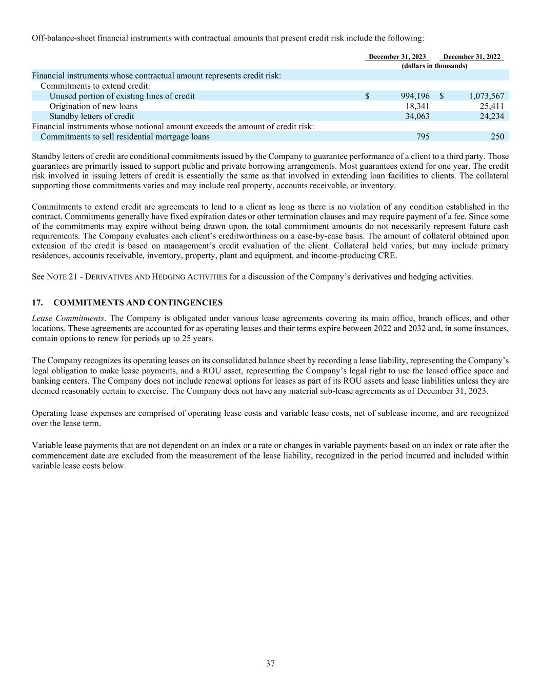37 Off-balance-sheet financial instruments with contractual amounts that present credit risk include the following: December 31, 2023 December 31, 2022 (dollars in thousands) Financial instruments whose contractual amount represents credit risk: Commitments to extend credit: Unused portion of existing lines of credit $ 994,196 $ 1,073,567 Origination of new loans 18,341 25,411 Standby letters of credit 34,063 24,234 Financial instruments whose notional amount exceeds the amount of credit risk: Commitments to sell residential mortgage loans 795 250 Standby letters of credit are conditional commitments issued by the Company to guarantee performance of a client to a third party. Those guarantees are primarily issued to support public and private borrowing arrangements. Most guarantees extend for one year. The credit risk involved in issuing letters of credit is essentially the same as that involved in extending loan facilities to clients. The collateral supporting those commitments varies and may include real property, accounts receivable, or inventory. Commitments to extend credit are agreements to lend to a client as long as there is no violation of any condition established in the contract. Commitments generally have fixed expiration dates or other termination clauses and may require payment of a fee. Since some of the commitments may expire without being drawn upon, the total commitment amounts do not necessarily represent future cash requirements. The Company evaluates each client’s creditworthiness on a case-by-case basis. The amount of collateral obtained upon extension of the credit is based on management’s credit evaluation of the client. Collateral held varies, but may include primary residences, accounts receivable, inventory, property, plant and equipment, and income-producing CRE. See NOTE 21 - DERIVATIVES AND HEDGING ACTIVITIES for a discussion of the Company’s derivatives and hedging activities. 17. COMMITMENTS AND CONTINGENCIES Lease Commitments. The Company is obligated under various lease agreements covering its main office, branch offices, and other locations. These agreements are accounted for as operating leases and their terms expire between 2022 and 2032 and, in some instances, contain options to renew for periods up to 25 years. The Company recognizes its operating leases on its consolidated balance sheet by recording a lease liability, representing the Company’s legal obligation to make lease payments, and a ROU asset, representing the Company’s legal right to use the leased office space and banking centers. The Company does not include renewal options for leases as part of its ROU assets and lease liabilities unless they are deemed reasonably certain to exercise. The Company does not have any material sub-lease agreements as of December 31, 2023. Operating lease expenses are comprised of operating lease costs and variable lease costs, net of sublease income, and are recognized over the lease term. Variable lease payments that are not dependent on an index or a rate or changes in variable payments based on an index or rate after the commencement date are excluded from the measurement of the lease liability, recognized in the period incurred and included within variable lease costs below.