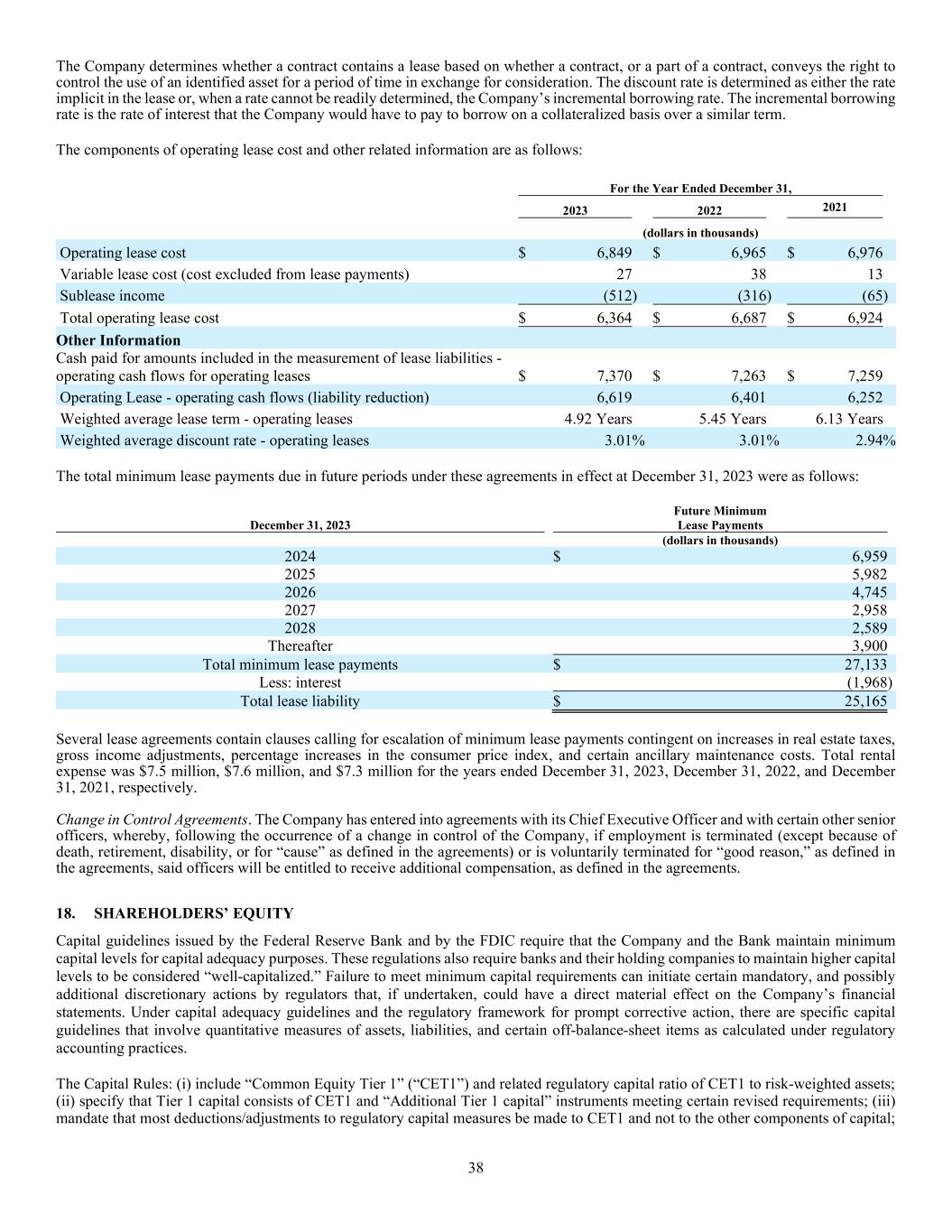 38 The Company determines whether a contract contains a lease based on whether a contract, or a part of a contract, conveys the right to control the use of an identified asset for a period of time in exchange for consideration. The discount rate is determined as either the rate implicit in the lease or, when a rate cannot be readily determined, the Company’s incremental borrowing rate. The incremental borrowing rate is the rate of interest that the Company would have to pay to borrow on a collateralized basis over a similar term. The components of operating lease cost and other related information are as follows: For the Year Ended December 31, 2023 2022 2021 (dollars in thousands) Operating lease cost $ 6,849 $ 6,965 $ 6,976 Variable lease cost (cost excluded from lease payments) 27 38 13 Sublease income (512) (316) (65) Total operating lease cost $ 6,364 $ 6,687 $ 6,924 Other Information Cash paid for amounts included in the measurement of lease liabilities - operating cash flows for operating leases $ 7,370 $ 7,263 $ 7,259 Operating Lease - operating cash flows (liability reduction) 6,619 6,401 6,252 Weighted average lease term - operating leases 4.92 Years 5.45 Years 6.13 Years Weighted average discount rate - operating leases 3.01% 3.01% 2.94% The total minimum lease payments due in future periods under these agreements in effect at December 31, 2023 were as follows: Future Minimum December 31, 2023 Lease Payments (dollars in thousands) 2024 $ 6,959 2025 5,982 2026 4,745 2027 2,958 2028 2,589 Thereafter 3,900 Total minimum lease payments $ 27,133 Less: interest (1,968) Total lease liability $ 25,165 Several lease agreements contain clauses calling for escalation of minimum lease payments contingent on increases in real estate taxes, gross income adjustments, percentage increases in the consumer price index, and certain ancillary maintenance costs. Total rental expense was $7.5 million, $7.6 million, and $7.3 million for the years ended December 31, 2023, December 31, 2022, and December 31, 2021, respectively. Change in Control Agreements. The Company has entered into agreements with its Chief Executive Officer and with certain other senior officers, whereby, following the occurrence of a change in control of the Company, if employment is terminated (except because of death, retirement, disability, or for “cause” as defined in the agreements) or is voluntarily terminated for “good reason,” as defined in the agreements, said officers will be entitled to receive additional compensation, as defined in the agreements. 18. SHAREHOLDERS’ EQUITY Capital guidelines issued by the Federal Reserve Bank and by the FDIC require that the Company and the Bank maintain minimum capital levels for capital adequacy purposes. These regulations also require banks and their holding companies to maintain higher capital levels to be considered “well-capitalized.” Failure to meet minimum capital requirements can initiate certain mandatory, and possibly additional discretionary actions by regulators that, if undertaken, could have a direct material effect on the Company’s financial statements. Under capital adequacy guidelines and the regulatory framework for prompt corrective action, there are specific capital guidelines that involve quantitative measures of assets, liabilities, and certain off-balance-sheet items as calculated under regulatory accounting practices. The Capital Rules: (i) include “Common Equity Tier 1” (“CET1”) and related regulatory capital ratio of CET1 to risk-weighted assets; (ii) specify that Tier 1 capital consists of CET1 and “Additional Tier 1 capital” instruments meeting certain revised requirements; (iii) mandate that most deductions/adjustments to regulatory capital measures be made to CET1 and not to the other components of capital;
