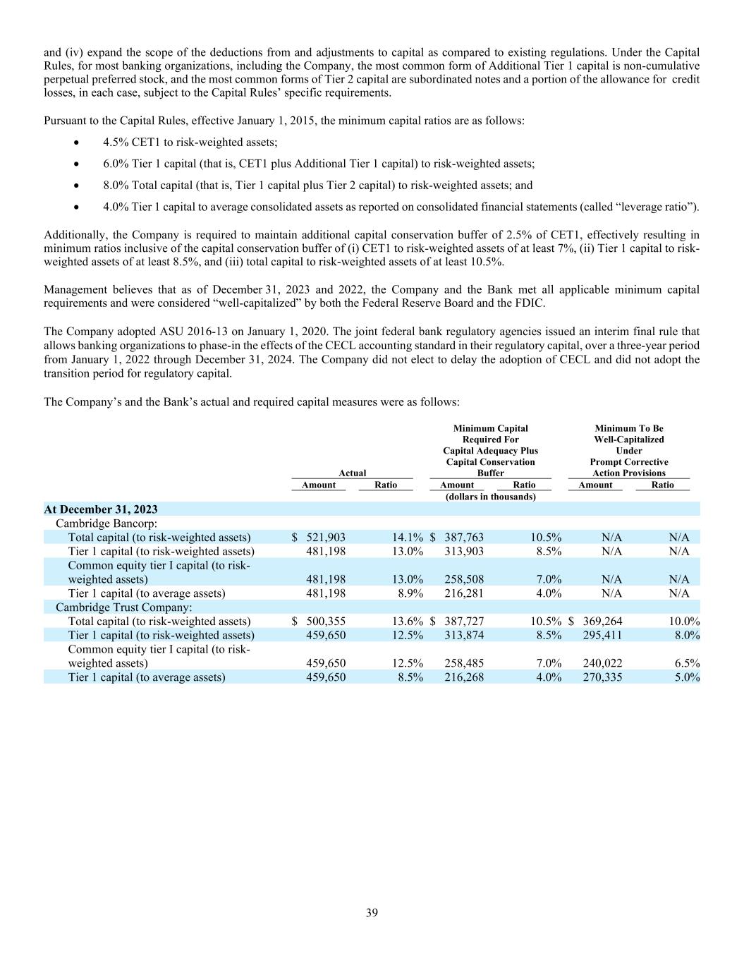 39 and (iv) expand the scope of the deductions from and adjustments to capital as compared to existing regulations. Under the Capital Rules, for most banking organizations, including the Company, the most common form of Additional Tier 1 capital is non-cumulative perpetual preferred stock, and the most common forms of Tier 2 capital are subordinated notes and a portion of the allowance for credit losses, in each case, subject to the Capital Rules’ specific requirements. Pursuant to the Capital Rules, effective January 1, 2015, the minimum capital ratios are as follows:  4.5% CET1 to risk-weighted assets;  6.0% Tier 1 capital (that is, CET1 plus Additional Tier 1 capital) to risk-weighted assets;  8.0% Total capital (that is, Tier 1 capital plus Tier 2 capital) to risk-weighted assets; and  4.0% Tier 1 capital to average consolidated assets as reported on consolidated financial statements (called “leverage ratio”). Additionally, the Company is required to maintain additional capital conservation buffer of 2.5% of CET1, effectively resulting in minimum ratios inclusive of the capital conservation buffer of (i) CET1 to risk-weighted assets of at least 7%, (ii) Tier 1 capital to risk- weighted assets of at least 8.5%, and (iii) total capital to risk-weighted assets of at least 10.5%. Management believes that as of December 31, 2023 and 2022, the Company and the Bank met all applicable minimum capital requirements and were considered “well-capitalized” by both the Federal Reserve Board and the FDIC. The Company adopted ASU 2016-13 on January 1, 2020. The joint federal bank regulatory agencies issued an interim final rule that allows banking organizations to phase-in the effects of the CECL accounting standard in their regulatory capital, over a three-year period from January 1, 2022 through December 31, 2024. The Company did not elect to delay the adoption of CECL and did not adopt the transition period for regulatory capital. The Company’s and the Bank’s actual and required capital measures were as follows: Actual Minimum Capital Required For Capital Adequacy Plus Capital Conservation Buffer Minimum To Be Well-Capitalized Under Prompt Corrective Action Provisions Amount Ratio Amount Ratio Amount Ratio (dollars in thousands) At December 31, 2023 Cambridge Bancorp: Total capital (to risk-weighted assets) $ 521,903 14.1% $ 387,763 10.5% N/A N/A Tier 1 capital (to risk-weighted assets) 481,198 13.0% 313,903 8.5% N/A N/A Common equity tier I capital (to risk- weighted assets) 481,198 13.0% 258,508 7.0% N/A N/A Tier 1 capital (to average assets) 481,198 8.9% 216,281 4.0% N/A N/A Cambridge Trust Company: Total capital (to risk-weighted assets) $ 500,355 13.6% $ 387,727 10.5% $ 369,264 10.0% Tier 1 capital (to risk-weighted assets) 459,650 12.5% 313,874 8.5% 295,411 8.0% Common equity tier I capital (to risk- weighted assets) 459,650 12.5% 258,485 7.0% 240,022 6.5% Tier 1 capital (to average assets) 459,650 8.5% 216,268 4.0% 270,335 5.0%