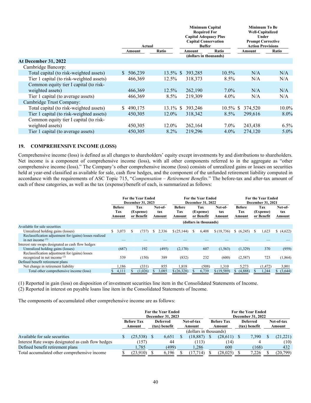 40 Actual Minimum Capital Required For Capital Adequacy Plus Capital Conservation Buffer Minimum To Be Well-Capitalized Under Prompt Corrective Action Provisions Amount Ratio Amount Ratio Amount Ratio (dollars in thousands) At December 31, 2022 Cambridge Bancorp: Total capital (to risk-weighted assets) $ 506,239 13.5% $ 393,285 10.5% N/A N/A Tier 1 capital (to risk-weighted assets) 466,369 12.5% 318,373 8.5% N/A N/A Common equity tier I capital (to risk- weighted assets) 466,369 12.5% 262,190 7.0% N/A N/A Tier 1 capital (to average assets) 466,369 8.5% 219,309 4.0% N/A N/A Cambridge Trust Company: Total capital (to risk-weighted assets) $ 490,175 13.1% $ 393,246 10.5% $ 374,520 10.0% Tier 1 capital (to risk-weighted assets) 450,305 12.0% 318,342 8.5% 299,616 8.0% Common equity tier I capital (to risk- weighted assets) 450,305 12.0% 262,164 7.0% 243,438 6.5% Tier 1 capital (to average assets) 450,305 8.2% 219,296 4.0% 274,120 5.0% 19. COMPREHENSIVE INCOME (LOSS) Comprehensive income (loss) is defined as all changes to shareholders’ equity except investments by and distributions to shareholders. Net income is a component of comprehensive income (loss), with all other components referred to in the aggregate as “other comprehensive income (loss).” The Company’s other comprehensive income (loss) consists of unrealized gains or losses on securities held at year-end classified as available for sale, cash flow hedges, and the component of the unfunded retirement liability computed in accordance with the requirements of ASC Topic 715, “Compensation – Retirement Benefits.” The before-tax and after-tax amount of each of these categories, as well as the tax (expense)/benefit of each, is summarized as follows: For the Year Ended December 31, 2023 For the Year Ended December 31, 2022 For the Year Ended December 31, 2021 Before Tax Amount Tax (Expense) or Benefit Net-of- tax Amount Before Tax Amount Tax (Expense) or Benefit Net-of- tax Amount Before Tax Amount Tax (Expense) or Benefit Net-of- tax Amount (dollars in thousands) Available for sale securities Unrealized holding gains (losses) $ 3,073 $ (737) $ 2,336 $ (25,144) $ 6,408 $ (18,736) $ (6,245) $ 1,623 $ (4,622) Reclassification adjustment for (gains) losses realized in net income (1) — — — — — — — — — Interest rate swaps designated as cash flow hedges Unrealized holding gains (losses) (687) 192 (495) (2,170) 607 (1,563) (1,329) 370 (959) Reclassification adjustment for (gains) losses recognized in net income (2) 539 (150) 389 (832) 232 (600) (2,587) 723 (1,864) Defined benefit retirement plans Net change in retirement liability 1,186 (331) 855 1,818 (508) 1,310 5,273 (1,472) 3,801 Total other comprehensive income (loss) $ 4,111 $ (1,026) $ 3,085 $ (26,328) $ 6,739 $ (19,589) $ (4,888) $ 1,244 $ (3,644) (1) Reported in gain (loss) on disposition of investment securities line item in the Consolidated Statements of Income. (2) Reported in interest on payable loans line item in the Consolidated Statements of Income. The components of accumulated other comprehensive income are as follows: For the Year Ended December 31, 2023 For the Year Ended December 31, 2022 Before Tax Amount Deferred (tax) benefit Net-of-tax Amount Before Tax Amount Deferred (tax) benefit Net-of-tax Amount (dollars in thousands) Available for sale securities $ (25,538) $ 6,651 $ (18,887) $ (28,611) $ 7,390 $ (21,221 ) Interest Rate swaps designated as cash flow hedges (157) 44 (113) (14) 4 (10 ) Defined benefit retirement plans 1,785 (499) 1,286 600 (168 ) 432 Total accumulated other comprehensive income $ (23,910) $ 6,196 $ (17,714) $ (28,025) $ 7,226 $ (20,799 )