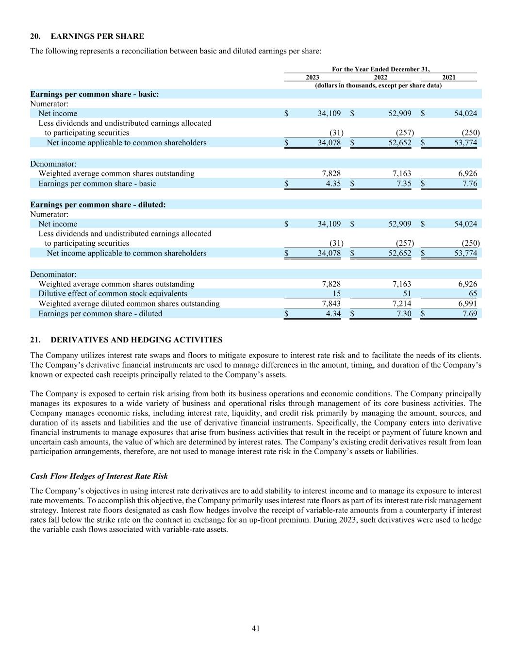 41 20. EARNINGS PER SHARE The following represents a reconciliation between basic and diluted earnings per share: For the Year Ended December 31, 2023 2022 2021 (dollars in thousands, except per share data) Earnings per common share - basic: Numerator: Net income $ 34,109 $ 52,909 $ 54,024 Less dividends and undistributed earnings allocated to participating securities (31) (257) (250) Net income applicable to common shareholders $ 34,078 $ 52,652 $ 53,774 Denominator: Weighted average common shares outstanding 7,828 7,163 6,926 Earnings per common share - basic $ 4.35 $ 7.35 $ 7.76 Earnings per common share - diluted: Numerator: Net income $ 34,109 $ 52,909 $ 54,024 Less dividends and undistributed earnings allocated to participating securities (31) (257) (250) Net income applicable to common shareholders $ 34,078 $ 52,652 $ 53,774 Denominator: Weighted average common shares outstanding 7,828 7,163 6,926 Dilutive effect of common stock equivalents 15 51 65 Weighted average diluted common shares outstanding 7,843 7,214 6,991 Earnings per common share - diluted $ 4.34 $ 7.30 $ 7.69 21. DERIVATIVES AND HEDGING ACTIVITIES The Company utilizes interest rate swaps and floors to mitigate exposure to interest rate risk and to facilitate the needs of its clients. The Company’s derivative financial instruments are used to manage differences in the amount, timing, and duration of the Company’s known or expected cash receipts principally related to the Company’s assets. The Company is exposed to certain risk arising from both its business operations and economic conditions. The Company principally manages its exposures to a wide variety of business and operational risks through management of its core business activities. The Company manages economic risks, including interest rate, liquidity, and credit risk primarily by managing the amount, sources, and duration of its assets and liabilities and the use of derivative financial instruments. Specifically, the Company enters into derivative financial instruments to manage exposures that arise from business activities that result in the receipt or payment of future known and uncertain cash amounts, the value of which are determined by interest rates. The Company’s existing credit derivatives result from loan participation arrangements, therefore, are not used to manage interest rate risk in the Company’s assets or liabilities. Cash Flow Hedges of Interest Rate Risk The Company’s objectives in using interest rate derivatives are to add stability to interest income and to manage its exposure to interest rate movements. To accomplish this objective, the Company primarily uses interest rate floors as part of its interest rate risk management strategy. Interest rate floors designated as cash flow hedges involve the receipt of variable-rate amounts from a counterparty if interest rates fall below the strike rate on the contract in exchange for an up-front premium. During 2023, such derivatives were used to hedge the variable cash flows associated with variable-rate assets.