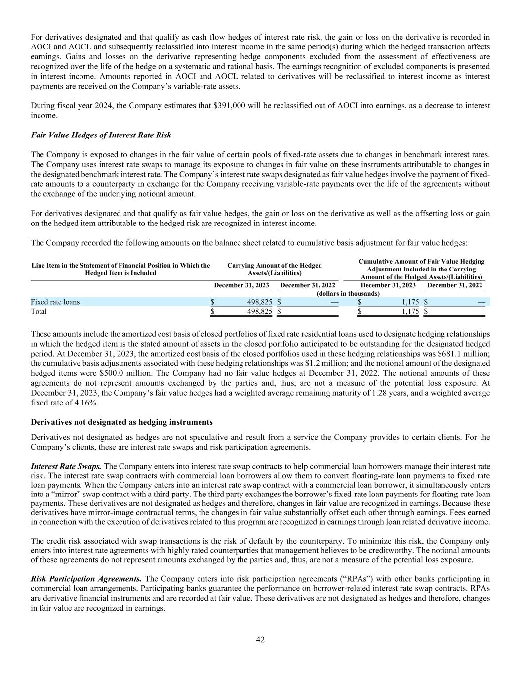 42 For derivatives designated and that qualify as cash flow hedges of interest rate risk, the gain or loss on the derivative is recorded in AOCI and AOCL and subsequently reclassified into interest income in the same period(s) during which the hedged transaction affects earnings. Gains and losses on the derivative representing hedge components excluded from the assessment of effectiveness are recognized over the life of the hedge on a systematic and rational basis. The earnings recognition of excluded components is presented in interest income. Amounts reported in AOCI and AOCL related to derivatives will be reclassified to interest income as interest payments are received on the Company’s variable-rate assets. During fiscal year 2024, the Company estimates that $391,000 will be reclassified out of AOCI into earnings, as a decrease to interest income. Fair Value Hedges of Interest Rate Risk The Company is exposed to changes in the fair value of certain pools of fixed-rate assets due to changes in benchmark interest rates. The Company uses interest rate swaps to manage its exposure to changes in fair value on these instruments attributable to changes in the designated benchmark interest rate. The Company’s interest rate swaps designated as fair value hedges involve the payment of fixed- rate amounts to a counterparty in exchange for the Company receiving variable-rate payments over the life of the agreements without the exchange of the underlying notional amount. For derivatives designated and that qualify as fair value hedges, the gain or loss on the derivative as well as the offsetting loss or gain on the hedged item attributable to the hedged risk are recognized in interest income. The Company recorded the following amounts on the balance sheet related to cumulative basis adjustment for fair value hedges: Line Item in the Statement of Financial Position in Which the Hedged Item is Included Carrying Amount of the Hedged Assets/(Liabilities) Cumulative Amount of Fair Value Hedging Adjustment Included in the Carrying Amount of the Hedged Assets/(Liabilities) December 31, 2023 December 31, 2022 December 31, 2023 December 31, 2022 (dollars in thousands) Fixed rate loans $ 498,825 $ — $ 1,175 $ — Total $ 498,825 $ — $ 1,175 $ — These amounts include the amortized cost basis of closed portfolios of fixed rate residential loans used to designate hedging relationships in which the hedged item is the stated amount of assets in the closed portfolio anticipated to be outstanding for the designated hedged period. At December 31, 2023, the amortized cost basis of the closed portfolios used in these hedging relationships was $681.1 million; the cumulative basis adjustments associated with these hedging relationships was $1.2 million; and the notional amount of the designated hedged items were $500.0 million. The Company had no fair value hedges at December 31, 2022. The notional amounts of these agreements do not represent amounts exchanged by the parties and, thus, are not a measure of the potential loss exposure. At December 31, 2023, the Company’s fair value hedges had a weighted average remaining maturity of 1.28 years, and a weighted average fixed rate of 4.16%. Derivatives not designated as hedging instruments Derivatives not designated as hedges are not speculative and result from a service the Company provides to certain clients. For the Company’s clients, these are interest rate swaps and risk participation agreements. Interest Rate Swaps. The Company enters into interest rate swap contracts to help commercial loan borrowers manage their interest rate risk. The interest rate swap contracts with commercial loan borrowers allow them to convert floating-rate loan payments to fixed rate loan payments. When the Company enters into an interest rate swap contract with a commercial loan borrower, it simultaneously enters into a “mirror” swap contract with a third party. The third party exchanges the borrower’s fixed-rate loan payments for floating-rate loan payments. These derivatives are not designated as hedges and therefore, changes in fair value are recognized in earnings. Because these derivatives have mirror-image contractual terms, the changes in fair value substantially offset each other through earnings. Fees earned in connection with the execution of derivatives related to this program are recognized in earnings through loan related derivative income. The credit risk associated with swap transactions is the risk of default by the counterparty. To minimize this risk, the Company only enters into interest rate agreements with highly rated counterparties that management believes to be creditworthy. The notional amounts of these agreements do not represent amounts exchanged by the parties and, thus, are not a measure of the potential loss exposure. Risk Participation Agreements. The Company enters into risk participation agreements (“RPAs”) with other banks participating in commercial loan arrangements. Participating banks guarantee the performance on borrower-related interest rate swap contracts. RPAs are derivative financial instruments and are recorded at fair value. These derivatives are not designated as hedges and therefore, changes in fair value are recognized in earnings.