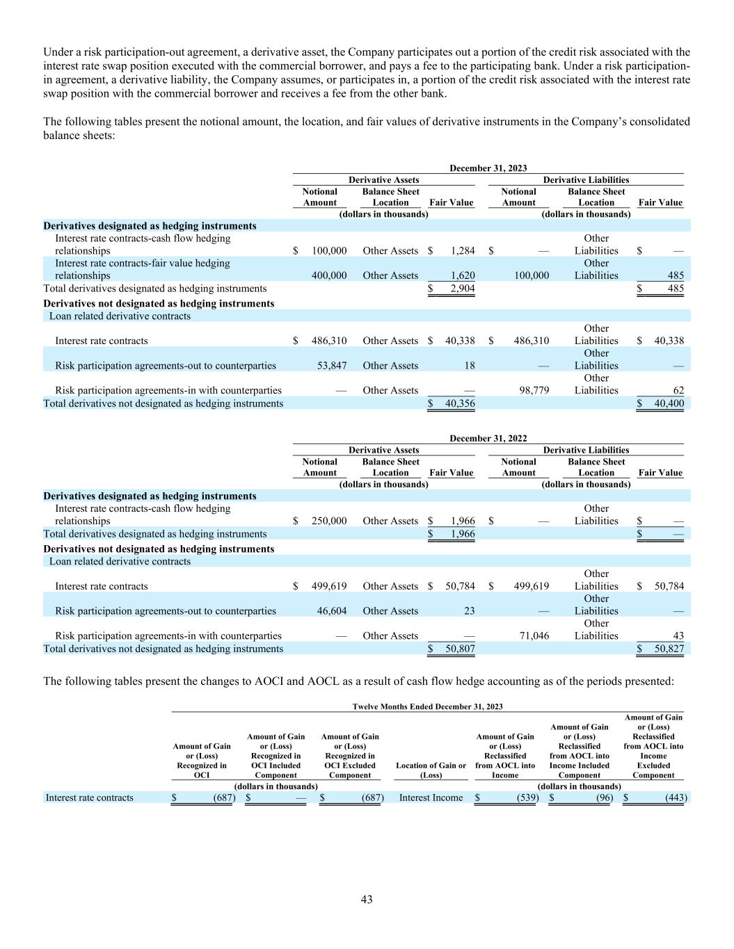 43 Under a risk participation-out agreement, a derivative asset, the Company participates out a portion of the credit risk associated with the interest rate swap position executed with the commercial borrower, and pays a fee to the participating bank. Under a risk participation- in agreement, a derivative liability, the Company assumes, or participates in, a portion of the credit risk associated with the interest rate swap position with the commercial borrower and receives a fee from the other bank. The following tables present the notional amount, the location, and fair values of derivative instruments in the Company’s consolidated balance sheets: December 31, 2023 Derivative Assets Derivative Liabilities Notional Amount Balance Sheet Location Fair Value Notional Amount Balance Sheet Location Fair Value (dollars in thousands) (dollars in thousands) Derivatives designated as hedging instruments Interest rate contracts-cash flow hedging relationships $ 100,000 Other Assets $ 1,284 $ — Other Liabilities $ — Interest rate contracts-fair value hedging relationships 400,000 Other Assets 1,620 100,000 Other Liabilities 485 Total derivatives designated as hedging instruments $ 2,904 $ 485 Derivatives not designated as hedging instruments Loan related derivative contracts Interest rate contracts $ 486,310 Other Assets $ 40,338 $ 486,310 Other Liabilities $ 40,338 Risk participation agreements-out to counterparties 53,847 Other Assets 18 — Other Liabilities — Risk participation agreements-in with counterparties — Other Assets — 98,779 Other Liabilities 62 Total derivatives not designated as hedging instruments $ 40,356 $ 40,400 December 31, 2022 Derivative Assets Derivative Liabilities Notional Amount Balance Sheet Location Fair Value Notional Amount Balance Sheet Location Fair Value (dollars in thousands) (dollars in thousands) Derivatives designated as hedging instruments Interest rate contracts-cash flow hedging relationships $ 250,000 Other Assets $ 1,966 $ — Other Liabilities $ — Total derivatives designated as hedging instruments $ 1,966 $ — Derivatives not designated as hedging instruments Loan related derivative contracts Interest rate contracts $ 499,619 Other Assets $ 50,784 $ 499,619 Other Liabilities $ 50,784 Risk participation agreements-out to counterparties 46,604 Other Assets 23 — Other Liabilities — Risk participation agreements-in with counterparties — Other Assets — 71,046 Other Liabilities 43 Total derivatives not designated as hedging instruments $ 50,807 $ 50,827 The following tables present the changes to AOCI and AOCL as a result of cash flow hedge accounting as of the periods presented: Twelve Months Ended December 31, 2023 Amount of Gain or (Loss) Recognized in OCI Amount of Gain or (Loss) Recognized in OCI Included Component Amount of Gain or (Loss) Recognized in OCI Excluded Component Location of Gain or (Loss) Amount of Gain or (Loss) Reclassified from AOCL into Income Amount of Gain or (Loss) Reclassified from AOCL into Income Included Component Amount of Gain or (Loss) Reclassified from AOCL into Income Excluded Component (dollars in thousands) (dollars in thousands) Interest rate contracts $ (687 ) $ — $ (687 ) Interest Income $ (539) $ (96) $ (443)
