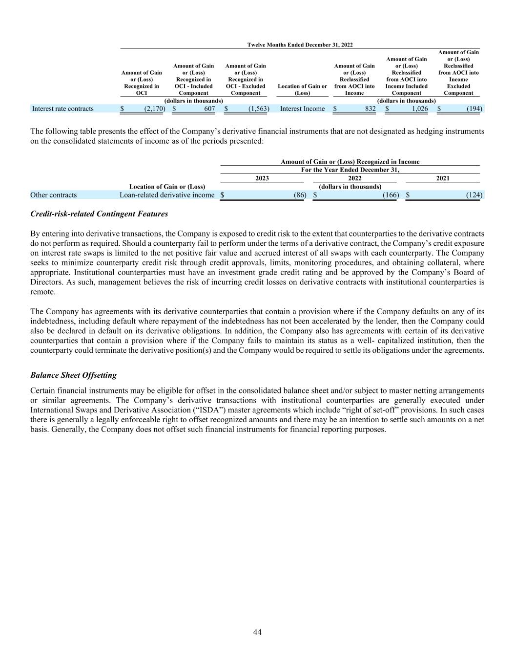 44 Twelve Months Ended December 31, 2022 Amount of Gain or (Loss) Recognized in OCI Amount of Gain or (Loss) Recognized in OCI - Included Component Amount of Gain or (Loss) Recognized in OCI - Excluded Component Location of Gain or (Loss) Amount of Gain or (Loss) Reclassified from AOCI into Income Amount of Gain or (Loss) Reclassified from AOCI into Income Included Component Amount of Gain or (Loss) Reclassified from AOCI into Income Excluded Component (dollars in thousands) (dollars in thousands) Interest rate contracts $ (2,170 ) $ 607 $ (1,563 ) Interest Income $ 832 $ 1,026 $ (194) The following table presents the effect of the Company’s derivative financial instruments that are not designated as hedging instruments on the consolidated statements of income as of the periods presented: Amount of Gain or (Loss) Recognized in Income For the Year Ended December 31, 2023 2022 2021 Location of Gain or (Loss) (dollars in thousands) Other contracts Loan-related derivative income $ (86) $ (166) $ (124) Credit-risk-related Contingent Features By entering into derivative transactions, the Company is exposed to credit risk to the extent that counterparties to the derivative contracts do not perform as required. Should a counterparty fail to perform under the terms of a derivative contract, the Company’s credit exposure on interest rate swaps is limited to the net positive fair value and accrued interest of all swaps with each counterparty. The Company seeks to minimize counterparty credit risk through credit approvals, limits, monitoring procedures, and obtaining collateral, where appropriate. Institutional counterparties must have an investment grade credit rating and be approved by the Company’s Board of Directors. As such, management believes the risk of incurring credit losses on derivative contracts with institutional counterparties is remote. The Company has agreements with its derivative counterparties that contain a provision where if the Company defaults on any of its indebtedness, including default where repayment of the indebtedness has not been accelerated by the lender, then the Company could also be declared in default on its derivative obligations. In addition, the Company also has agreements with certain of its derivative counterparties that contain a provision where if the Company fails to maintain its status as a well- capitalized institution, then the counterparty could terminate the derivative position(s) and the Company would be required to settle its obligations under the agreements. Balance Sheet Offsetting Certain financial instruments may be eligible for offset in the consolidated balance sheet and/or subject to master netting arrangements or similar agreements. The Company’s derivative transactions with institutional counterparties are generally executed under International Swaps and Derivative Association (“ISDA”) master agreements which include “right of set-off” provisions. In such cases there is generally a legally enforceable right to offset recognized amounts and there may be an intention to settle such amounts on a net basis. Generally, the Company does not offset such financial instruments for financial reporting purposes.
