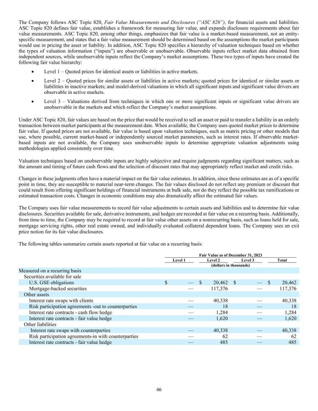 46 The Company follows ASC Topic 820, Fair Value Measurements and Disclosures (“ASC 820”), for financial assets and liabilities. ASC Topic 820 defines fair value, establishes a framework for measuring fair value, and expands disclosure requirements about fair value measurements. ASC Topic 820, among other things, emphasizes that fair value is a market-based measurement, not an entity- specific measurement, and states that a fair value measurement should be determined based on the assumptions the market participants would use in pricing the asset or liability. In addition, ASC Topic 820 specifies a hierarchy of valuation techniques based on whether the types of valuation information (“inputs”) are observable or unobservable. Observable inputs reflect market data obtained from independent sources, while unobservable inputs reflect the Company’s market assumptions. These two types of inputs have created the following fair value hierarchy:  Level 1 – Quoted prices for identical assets or liabilities in active markets.  Level 2 – Quoted prices for similar assets or liabilities in active markets; quoted prices for identical or similar assets or liabilities in inactive markets; and model-derived valuations in which all significant inputs and significant value drivers are observable in active markets.  Level 3 – Valuations derived from techniques in which one or more significant inputs or significant value drivers are unobservable in the markets and which reflect the Company’s market assumptions. Under ASC Topic 820, fair values are based on the price that would be received to sell an asset or paid to transfer a liability in an orderly transaction between market participants at the measurement date. When available, the Company uses quoted market prices to determine fair value. If quoted prices are not available, fair value is based upon valuation techniques, such as matrix pricing or other models that use, where possible, current market-based or independently sourced market parameters, such as interest rates. If observable market- based inputs are not available, the Company uses unobservable inputs to determine appropriate valuation adjustments using methodologies applied consistently over time. Valuation techniques based on unobservable inputs are highly subjective and require judgments regarding significant matters, such as the amount and timing of future cash flows and the selection of discount rates that may appropriately reflect market and credit risks. Changes in these judgments often have a material impact on the fair value estimates. In addition, since these estimates are as of a specific point in time, they are susceptible to material near-term changes. The fair values disclosed do not reflect any premium or discount that could result from offering significant holdings of financial instruments at bulk sale, nor do they reflect the possible tax ramifications or estimated transaction costs. Changes in economic conditions may also dramatically affect the estimated fair values. The Company uses fair value measurements to record fair value adjustments to certain assets and liabilities and to determine fair value disclosures. Securities available for sale, derivative instruments, and hedges are recorded at fair value on a recurring basis. Additionally, from time to time, the Company may be required to record at fair value other assets on a nonrecurring basis, such as loans held for sale, mortgage servicing rights, other real estate owned, and individually evaluated collateral dependent loans. The Company uses an exit price notion for its fair value disclosures. The following tables summarize certain assets reported at fair value on a recurring basis: Fair Value as of December 31, 2023 Level 1 Level 2 Level 3 Total (dollars in thousands) Measured on a recurring basis Securities available for sale U.S. GSE obligations $ — $ 20,462 $ — $ 20,462 Mortgage-backed securities — 117,376 — 117,376 Other assets Interest rate swaps with clients — 40,338 — 40,338 Risk participation agreements -out to counterparties — 18 — 18 Interest rate contracts - cash flow hedge — 1,284 — 1,284 Interest rate contracts - fair value hedge — 1,620 — 1,620 Other liabilities Interest rate swaps with counterparties — 40,338 — 40,338 Risk participation agreements-in with counterparties — 62 — 62 Interest rate contracts - fair value hedge — 485 — 485