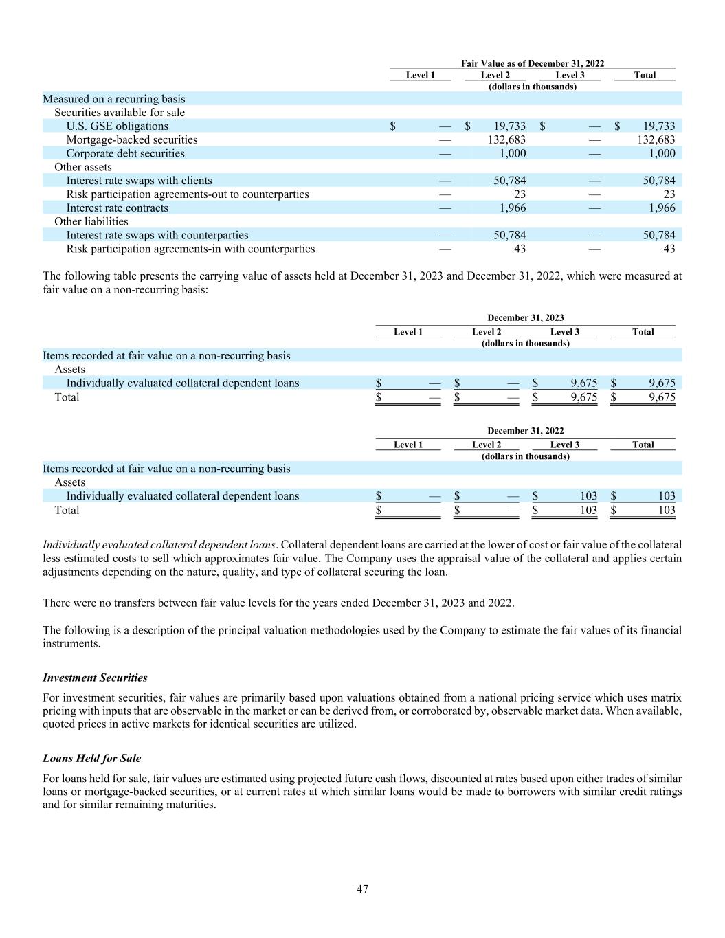 47 Fair Value as of December 31, 2022 Level 1 Level 2 Level 3 Total (dollars in thousands) Measured on a recurring basis Securities available for sale U.S. GSE obligations $ — $ 19,733 $ — $ 19,733 Mortgage-backed securities — 132,683 — 132,683 Corporate debt securities — 1,000 — 1,000 Other assets Interest rate swaps with clients — 50,784 — 50,784 Risk participation agreements-out to counterparties — 23 — 23 Interest rate contracts — 1,966 — 1,966 Other liabilities Interest rate swaps with counterparties — 50,784 — 50,784 Risk participation agreements-in with counterparties — 43 — 43 The following table presents the carrying value of assets held at December 31, 2023 and December 31, 2022, which were measured at fair value on a non-recurring basis: December 31, 2023 Level 1 Level 2 Level 3 Total (dollars in thousands) Items recorded at fair value on a non-recurring basis Assets Individually evaluated collateral dependent loans $ — $ — $ 9,675 $ 9,675 Total $ — $ — $ 9,675 $ 9,675 December 31, 2022 Level 1 Level 2 Level 3 Total (dollars in thousands) Items recorded at fair value on a non-recurring basis Assets Individually evaluated collateral dependent loans $ — $ — $ 103 $ 103 Total $ — $ — $ 103 $ 103 Individually evaluated collateral dependent loans. Collateral dependent loans are carried at the lower of cost or fair value of the collateral less estimated costs to sell which approximates fair value. The Company uses the appraisal value of the collateral and applies certain adjustments depending on the nature, quality, and type of collateral securing the loan. There were no transfers between fair value levels for the years ended December 31, 2023 and 2022. The following is a description of the principal valuation methodologies used by the Company to estimate the fair values of its financial instruments. Investment Securities For investment securities, fair values are primarily based upon valuations obtained from a national pricing service which uses matrix pricing with inputs that are observable in the market or can be derived from, or corroborated by, observable market data. When available, quoted prices in active markets for identical securities are utilized. Loans Held for Sale For loans held for sale, fair values are estimated using projected future cash flows, discounted at rates based upon either trades of similar loans or mortgage-backed securities, or at current rates at which similar loans would be made to borrowers with similar credit ratings and for similar remaining maturities.