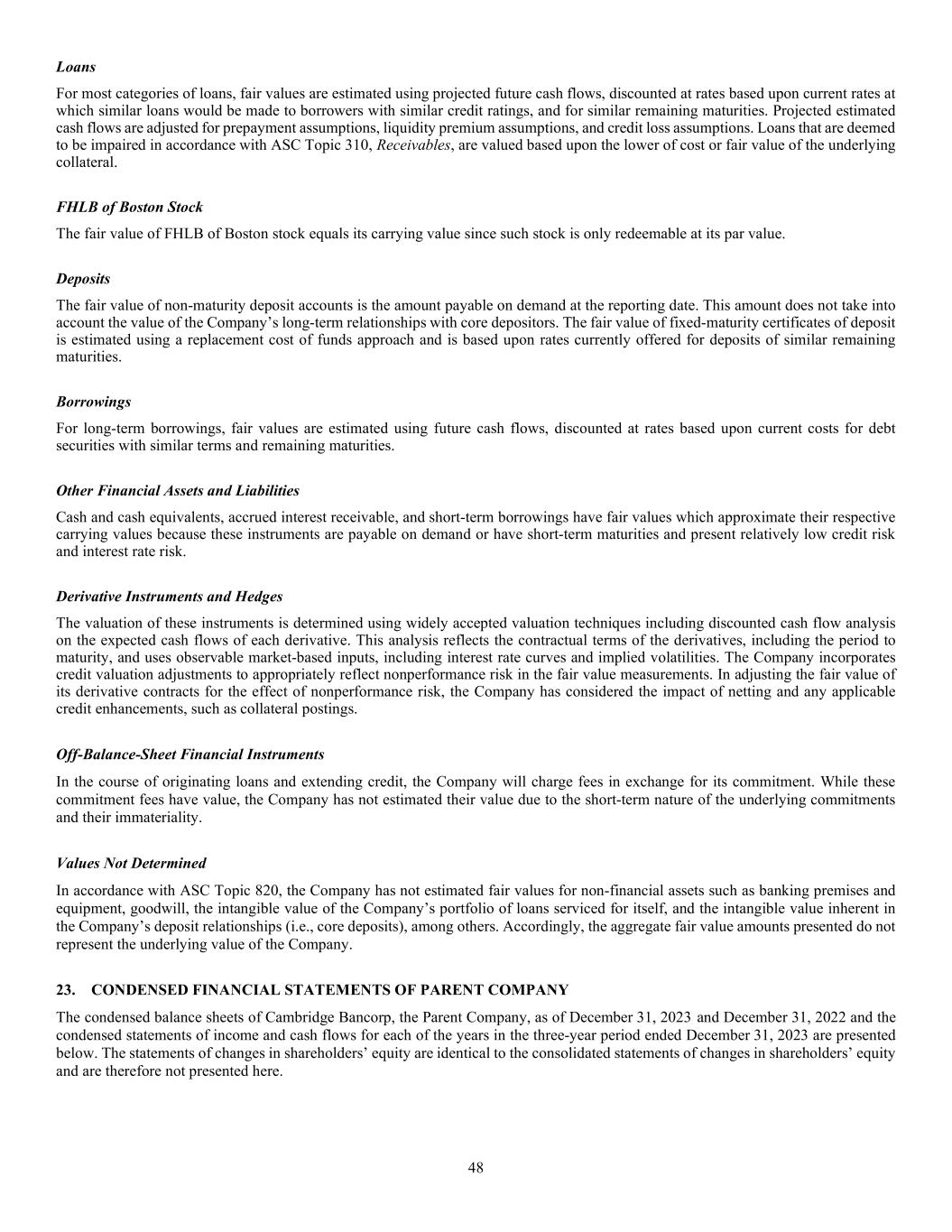 48 Loans For most categories of loans, fair values are estimated using projected future cash flows, discounted at rates based upon current rates at which similar loans would be made to borrowers with similar credit ratings, and for similar remaining maturities. Projected estimated cash flows are adjusted for prepayment assumptions, liquidity premium assumptions, and credit loss assumptions. Loans that are deemed to be impaired in accordance with ASC Topic 310, Receivables, are valued based upon the lower of cost or fair value of the underlying collateral. FHLB of Boston Stock The fair value of FHLB of Boston stock equals its carrying value since such stock is only redeemable at its par value. Deposits The fair value of non-maturity deposit accounts is the amount payable on demand at the reporting date. This amount does not take into account the value of the Company’s long-term relationships with core depositors. The fair value of fixed-maturity certificates of deposit is estimated using a replacement cost of funds approach and is based upon rates currently offered for deposits of similar remaining maturities. Borrowings For long-term borrowings, fair values are estimated using future cash flows, discounted at rates based upon current costs for debt securities with similar terms and remaining maturities. Other Financial Assets and Liabilities Cash and cash equivalents, accrued interest receivable, and short-term borrowings have fair values which approximate their respective carrying values because these instruments are payable on demand or have short-term maturities and present relatively low credit risk and interest rate risk. Derivative Instruments and Hedges The valuation of these instruments is determined using widely accepted valuation techniques including discounted cash flow analysis on the expected cash flows of each derivative. This analysis reflects the contractual terms of the derivatives, including the period to maturity, and uses observable market-based inputs, including interest rate curves and implied volatilities. The Company incorporates credit valuation adjustments to appropriately reflect nonperformance risk in the fair value measurements. In adjusting the fair value of its derivative contracts for the effect of nonperformance risk, the Company has considered the impact of netting and any applicable credit enhancements, such as collateral postings. Off-Balance-Sheet Financial Instruments In the course of originating loans and extending credit, the Company will charge fees in exchange for its commitment. While these commitment fees have value, the Company has not estimated their value due to the short-term nature of the underlying commitments and their immateriality. Values Not Determined In accordance with ASC Topic 820, the Company has not estimated fair values for non-financial assets such as banking premises and equipment, goodwill, the intangible value of the Company’s portfolio of loans serviced for itself, and the intangible value inherent in the Company’s deposit relationships (i.e., core deposits), among others. Accordingly, the aggregate fair value amounts presented do not represent the underlying value of the Company. 23. CONDENSED FINANCIAL STATEMENTS OF PARENT COMPANY The condensed balance sheets of Cambridge Bancorp, the Parent Company, as of December 31, 2023 and December 31, 2022 and the condensed statements of income and cash flows for each of the years in the three-year period ended December 31, 2023 are presented below. The statements of changes in shareholders’ equity are identical to the consolidated statements of changes in shareholders’ equity and are therefore not presented here.