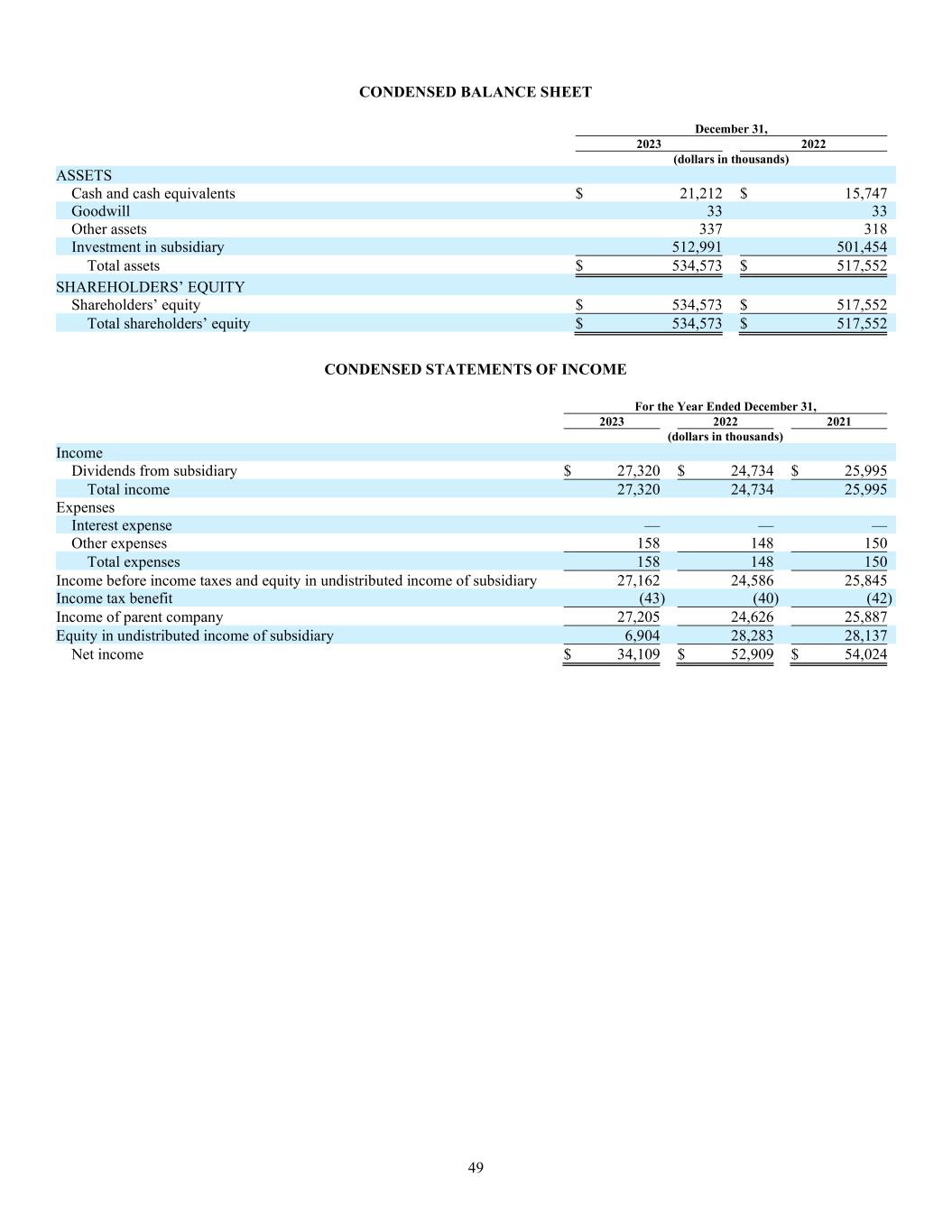 49 CONDENSED BALANCE SHEET December 31, 2023 2022 (dollars in thousands) ASSETS Cash and cash equivalents $ 21,212 $ 15,747 Goodwill 33 33 Other assets 337 318 Investment in subsidiary 512,991 501,454 Total assets $ 534,573 $ 517,552 SHAREHOLDERS’ EQUITY Shareholders’ equity $ 534,573 $ 517,552 Total shareholders’ equity $ 534,573 $ 517,552 CONDENSED STATEMENTS OF INCOME For the Year Ended December 31, 2023 2022 2021 (dollars in thousands) Income Dividends from subsidiary $ 27,320 $ 24,734 $ 25,995 Total income 27,320 24,734 25,995 Expenses Interest expense — — — Other expenses 158 148 150 Total expenses 158 148 150 Income before income taxes and equity in undistributed income of subsidiary 27,162 24,586 25,845 Income tax benefit (43) (40) (42) Income of parent company 27,205 24,626 25,887 Equity in undistributed income of subsidiary 6,904 28,283 28,137 Net income $ 34,109 $ 52,909 $ 54,024