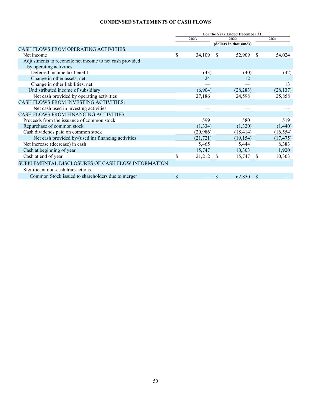 50 CONDENSED STATEMENTS OF CASH FLOWS For the Year Ended December 31, 2023 2022 2021 (dollars in thousands) CASH FLOWS FROM OPERATING ACTIVITIES: Net income $ 34,109 $ 52,909 $ 54,024 Adjustments to reconcile net income to net cash provided by operating activities Deferred income tax benefit (43) (40) (42) Change in other assets, net 24 12 — Change in other liabilities, net — — 13 Undistributed income of subsidiary (6,904) (28,283) (28,137) Net cash provided by operating activities 27,186 24,598 25,858 CASH FLOWS FROM INVESTING ACTIVITIES: Net cash used in investing activities — — — CASH FLOWS FROM FINANCING ACTIVITIES: Proceeds from the issuance of common stock 599 580 519 Repurchase of common stock (1,334) (1,320) (1,440) Cash dividends paid on common stock (20,986) (18,414) (16,554) Net cash provided by/(used in) financing activities (21,721) (19,154) (17,475) Net increase (decrease) in cash 5,465 5,444 8,383 Cash at beginning of year 15,747 10,303 1,920 Cash at end of year $ 21,212 $ 15,747 $ 10,303 SUPPLEMENTAL DISCLOSURES OF CASH FLOW INFORMATION: Significant non-cash transactions Common Stock issued to shareholders due to merger $ — $ 62,850 $ —