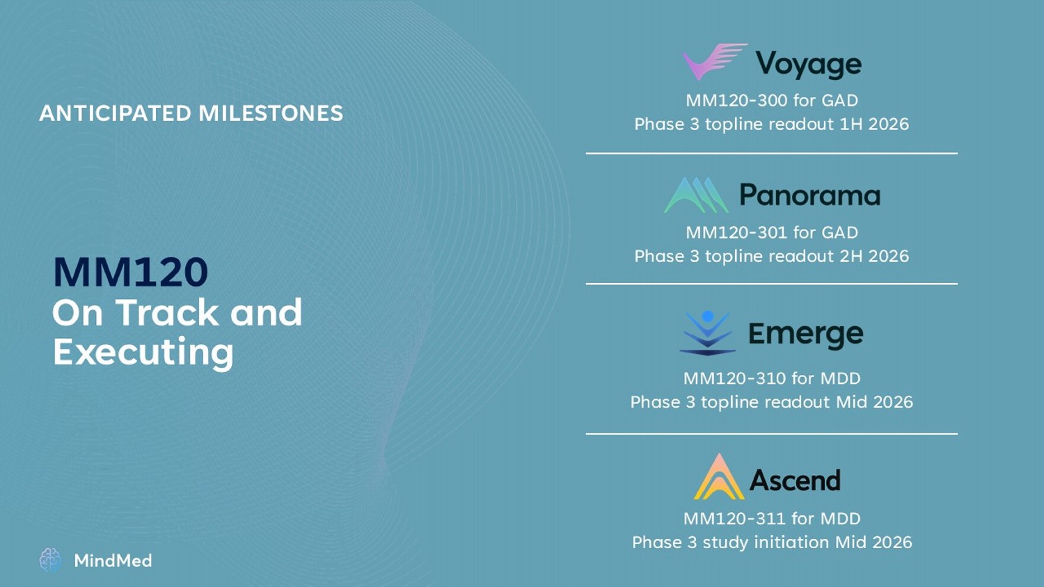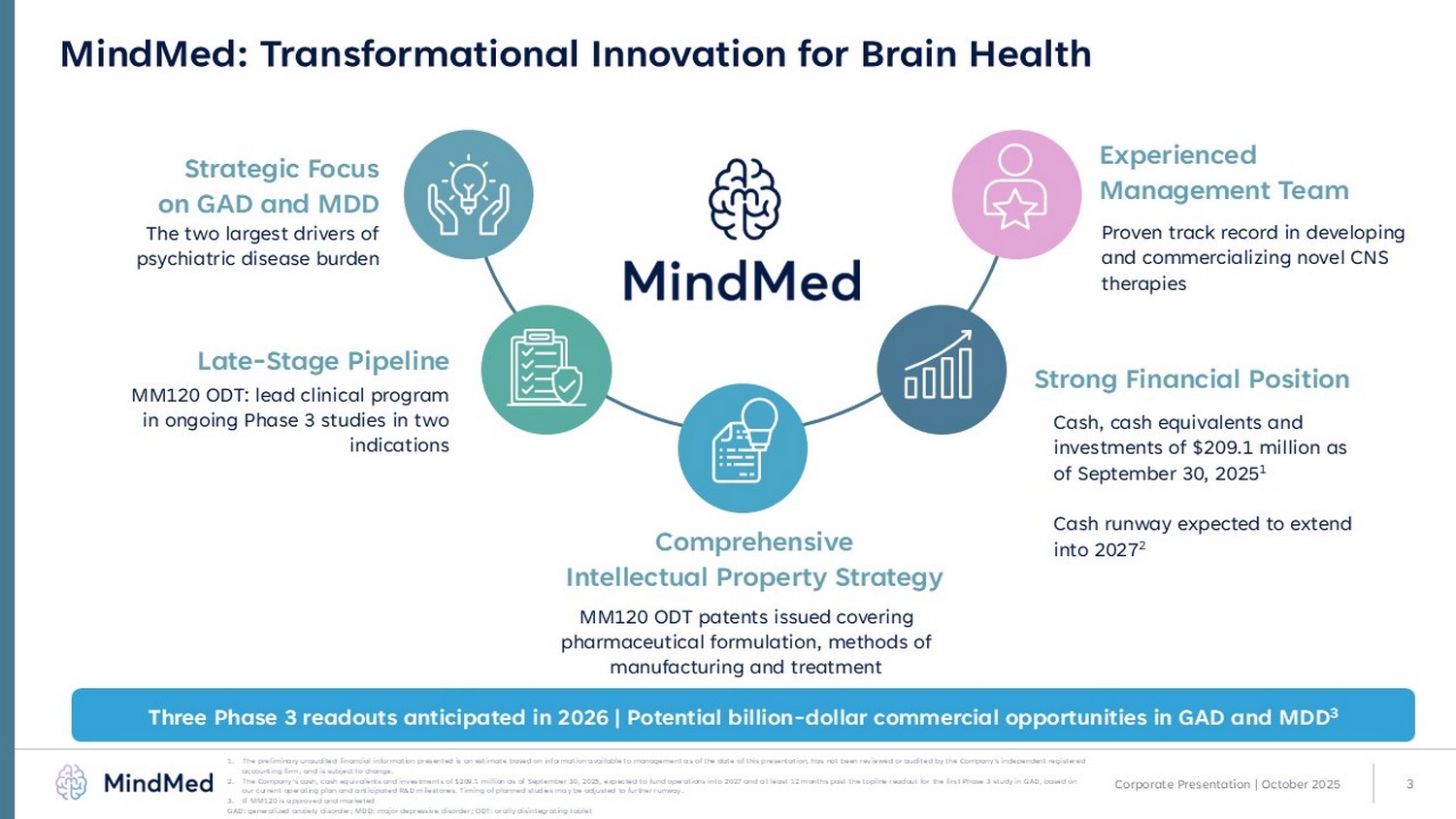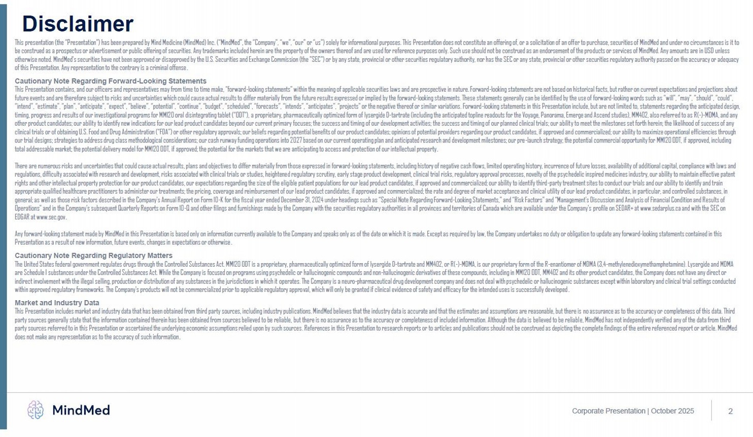 2 This presentation (the “Presentation”) has been prepared by Mind Medicine (MindMed) Inc. (“MindMed”, the “Company”, “we”, “ou r” or “us") solely for informational purposes. This Presentation does not constitute an offering of, or a solicitation of an offer to purchase, securities of MindMed and under no circumstances is it to be construe d a s a prospectus or advertisement or public offering of securities. Any trademarks included herein are the property of the owners thereof and are used for reference purposes only. Such use should not be construed as a n e ndorsement of the products or services of MindMed. Any amounts are in USD unless otherwise noted. MindMed’s securities have not been approved or disapproved by the U.S. Securities and Exchange Commission (the "SEC") or by any state, pr ovincial or other securities regulatory authority, nor has the SEC or any state, provincial or other securities regulatory authority passed on the accuracy or adequacy of this Presenta tio n. Any representation to the contrary is a criminal offense . Cautionary Note Regarding Forward - Looking Statements This Presentation contains, and our officers and representatives may from time to time make, “forward - looking statements” within the meaning of applicable securities laws and are prospective in nature. Forward - looking statements are not based on historical facts, but rather on current expectations and projections about future events and are therefore subject to risks and uncertainties which could cause actual results to differ materially from the future results expressed or implied by the forward - looking statements. These statements generally can be identified by the use of forward - looking words such as “will”, “may", “should”, “could”, “intend”, “estimate”, “plan”, “anticipate”, “expect”, “believe”, “potential”, “continue”, “budget”, “scheduled”, “fo rec asts”, “intends”, “anticipates”, “projects” or the negative thereof or similar variations. Forward - looking statements in this Presentation include, but are not limited to, statements regarding the anticipated design, timing, pr ogress and results of our investigational programs for MM120 oral disintegrating tablet (“ODT”), a proprietary, pharmaceutically optimized form of lysergide D - tartrate (including the anticipated topline readouts for the Voyage, Panorama, Emerge and Ascend studies), MM402, also referr ed to as R( - ) - MDMA, and any other product candidates; our ability to identify new indications for our lead product candidates beyond our cu rre nt primary focuses; the success and timing of our development activities; the success and timing of our planned clinical trials; our ability to meet the milestones set forth herein; the likelihood of success of any clinical trials or of obtaining U.S. Food and Drug Administration (“FDA”) or other regulatory approvals; our beliefs regarding potential benefits of our product candidates; opinions of potential providers regarding our pro duct candidates, if approved and commercialized; our ability to maximize operational efficiencies through our trial designs; strategies to address drug class methodological considerations; our cash runway fundi ng operations into 2027 based on our current operating plan and anticipated research and development milestones; our pre - launch strategy; the potential commercial opportunity for MM120 ODT, if approved, including tota l addressable market; the potential delivery model for MM120 ODT, if approved; the potential for the markets that we are anticipating to access and protection of our intellectual property . There are numerous risks and uncertainties that could cause actual results, plans and objectives to differ materially from th ose expressed in forward - looking statements, including history of negative cash flows, limited operating history, incurrence of future losses, availability of additional capital, compliance with laws and regulati ons , difficulty associated with research and development, risks associated with clinical trials or studies, heightened regulatory scrutiny, early stage product development, clinical trial risks, regulatory approval processes , n ovelty of the psychedelic inspired medicines industry, our ability to maintain effective patent rights and other intellectual property protection for our product candidates, our expectations regarding the size of t he eligible patient populations for our lead product candidates, if approved and commercialized; our ability to identify third - party treatment sites to conduct our trials and our ability to identify and train appropriate qualified healthcare practitioners to administer our treatments; the pricing, coverage and reimbursement of our lead product candidates, if approved and commercialized; the rate and degree of market acce pta nce and clinical utility of our lead product candidates, in particular, and controlled substances, in general; as well as those risk factors described in the Company's Annual Report on Form 10 - K for the fiscal year ended December 31, 2024 under headings such as “Special Note Regarding Forward - Looking Statements,” and “Risk Factors” and “Management's Discussion and Analysis of Financial Condition and Results of Opera tio ns” and in the Company’s subsequent Quarterly Reports on Form 10 - Q and other filings and furnishings made by the Company with the securities regulatory authorities in all provinces and territories of Ca nad a which are available under the Company's profile on SEDAR+ at www.sedarplus.ca and with the SEC on EDGAR at www.sec.gov . Any forward - looking statement made by MindMed in this Presentation is based only on information currently available to the Compa ny and speaks only as of the date on which it is made. Except as required by law, the Company undertakes no duty or obligation to update any forward - looking stateme