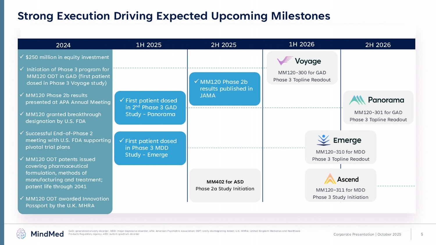 4 MM120 On Track and Executing ANTICIPATED MILESTONES MM120 - 300 for GAD Phase 3 topline readout 1H 2026 MM120 - 301 for GAD Phase 3 topline readout 2H 2026 MM120 - 310 for MDD Phase 3 topline readout Mid 2026 MM120 - 311 for MDD Phase 3 study initiation Mid 2026