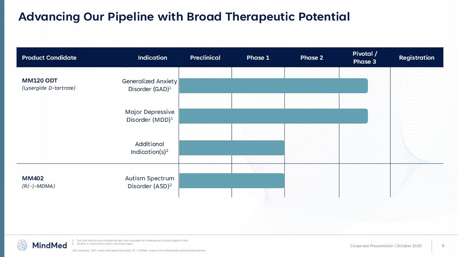 5 2024 1H 2025 2H 2025 1H 2026 2H 2026 MM120 - 310 for MDD Phase 3 Topline Readout MM120 - 301 for GAD Phase 3 Topline Readout x $250 million in equity investment x Initiation of Phase 3 program for MM120 ODT in GAD (first patient dosed in Phase 3 Voyage study) x MM120 Phase 2b results presented at APA Annual Meeting x MM120 granted breakthrough designation by U.S. FDA x Successful End - of - Phase 2 meeting with U.S. FDA supporting pivotal trial plans x MM120 ODT patents issued covering pharmaceutical formulation, methods of manufacturing and treatment; patent life through 2041 x MM120 ODT awarded Innovation Passport by the U.K. MHRA Corporate Presentation | October 2025 Strong Execution Driving Expected Upcoming Milestones GAD: generalized anxiety disorder; MDD: major depressive disorder; APA: American Psychiatric Association; ODT: orally disinte gra ting tablet; U.K. MHRA: United Kingdom Medicines and Healthcare Products Regulatory Agency, ASD: autism spectrum disorder x First patient dosed in 2 nd Phase 3 GAD Study - Panorama x First patient dosed in Phase 3 MDD Study - Emerge MM120 - 300 for GAD Phase 3 Topline Readout x MM120 Phase 2b results published in JAMA MM402 for ASD Phase 2a Study Initiation MM120 - 311 for MDD Phase 3 Study Initiation