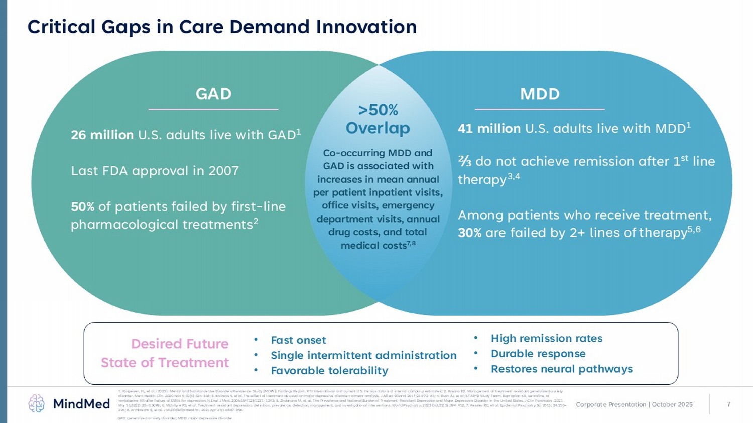 6 Advancing Our Pipeline with Broad Therapeutic Potential 1. Full trial details and clinicaltrials.gov links available at mindmed.co /clinical - digital - trials/ 2. Studies in exploration and/or planning stage. LSD: lysergide ; ODT: orally disintegrating tablet; R( - ) - MDMA: rectus - 3,4 - methylenedioxymethamphetamine Corporate Presentation | October 2025 Registration Pivotal / Phase 3 Phase 2 Phase 1 Preclinical Indication Product Candidate Generalized Anxiety Disorder (GAD) 1 MM120 ODT ( Lysergide D - tartrate) Major Depressive Disorder (MDD) 1 Additional Indication(s) 2 Autism Spectrum Disorder (ASD) 2 MM402 (R( - ) - MDMA)