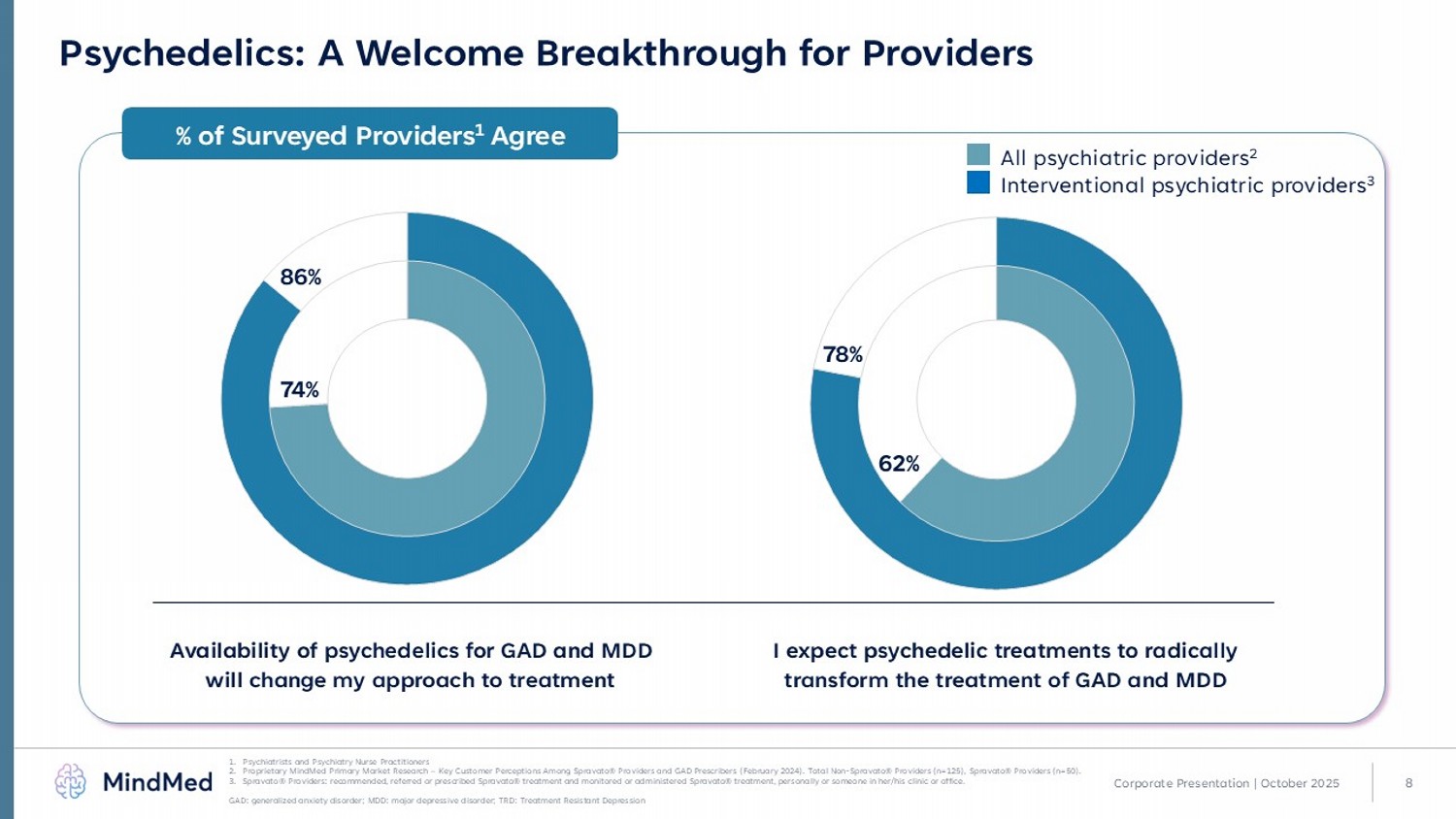 7 Corporate Presentation | October 2025 Critical Gaps in Care Demand Innovation • Fast onset • Single intermittent administration • Favorable tolerability 26 million U.S. adults live with GAD 1 Last FDA approval in 2007 50% of patients failed by first - line pharmacological treatments 2 Co - occurring MDD and GAD is associated with increases in mean annual per patient inpatient visits, office visits, emergency department visits, annual drug costs, and total medical costs 7,8 41 million U.S. adults live with MDD 1 ⅔ do not achieve remission after 1 st line therapy 3,4 Among patients who receive treatment, 30% are failed by 2+ lines of therapy 5,6 MDD > 50 % Overlap GAD • High remission rates • Durable response • Restores neural pathways Desired Future State of Treatment GAD: generalized anxiety disorder; MDD: major depressive disorder 1. Ringeisen, H., et al. (2023). Mental and Substance Use Disorders Prevalence Study (MDPS): Findings Report. RTI Internation al and current U.S. Census data and internal company estimates; 2. Ansara ED. Management of treatment - resistant generalized anxiety disorder. Ment Health Clin. 2020 Nov 5;10(6):326 - 334; 3. Kolovos S, et al. The effect of treatment as usual on major depressive disorder: a meta - analysis. J Affect Disord . 2017;210:72 - 81; 4. Rush AJ, et al; STAR*D Study Team. Bupropion - SR, sertraline, or venlafaxine - XR after failure of SSRIs for depression. N Engl J Med. 2006;354(12):1231 - 1242; 5. Zhdanava M, et al. The Prevalence and National Burden of Treatment - Resistant Depression and Major Depressive Disorder in the United Stat es. J Clin Psychiatry. 2021 Mar 16;82(2):20m13699; 6. McIntyre RS, et al. Treatment - resistant depression: definition, prevalence, detection, management, and investigational interventions. World Psychiatry. 2023 Oct;22(3):394 - 412; 7. Kessler RC, et al. Epidemiol Psychiatry Sci 2015; 2 4:210 – 226; 8. Armbrecht E, et al. J Multidiscip Healthc . 2021 Apr 23;14:887 - 896.