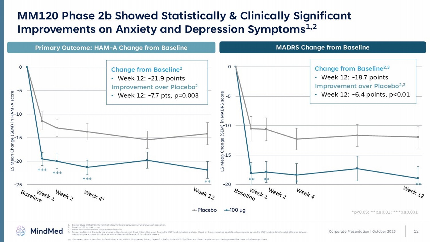 11 MM120 Phase 2b Efficacy and Durability Support GAD Phase 3 Trial Plans 1,3 1. Study MMED008 internal study documents and calculations. Comparisons to standard of care/other drug classes based on histo ric al comparison not head - to - head comparison trial; 2. HAM - A scores based on ANCOVA LS Mean. in Study MMED008. Effect size based on post hoc calculation using LS Mean change between group and pooled sta nda rd deviation of week 12 HAM - A scores between groups; 3. Based on 100 µg dose group; 4. RB Hidalgo, J Psychopharmacol . 2007 Nov;21(8):864 - 72; 5. p - values not calculated for remission rates between groups. Cohen’s d: a standardized effect size measuring the difference between two group means; CGI - S: Clinical Global Impressions – Sev erity; GAD: generalized anxiety disorder; HAM - A: Hamilton Anxiety Rating Scale Maximum effect size d=0.81 more than double the standard of care 1,2,3 0 0.2 0.4 0.6 0.8 0.38 0.36 0.17 0.81 Comparative Effect Sizes in GAD Rapid and durable response after single administration 3 Rapid Response & Remission Durable Standalone Drug Effect Limited Adverse Event (AE) Burden 1.8 - point reduction in CGI - S within 24 hours (p<0.0001) 21.9 - point improvement on the HAM - A at Week 12 (p=0.003) 48% of participants in remission at Week 12 5 Favorable tolerability with most AEs on dosing day Observed drug effect without accompanying psychotherapy Cohen’s d Corporate Presentation | October 2025 0/p Ž ObdMWBOlWbO s 4 tplWodbO Ž MM120 100 µg 2