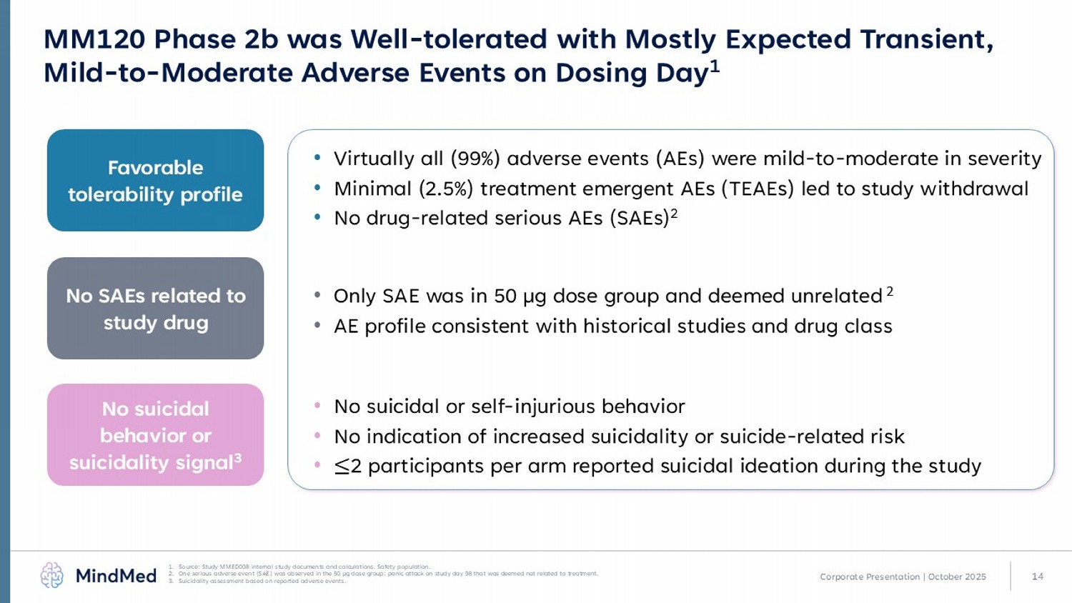 13 MM120 Phase 2b Produced Profound Changes in GAD Severity 1 1. Source: Study MMED008 internal study documents and calculations. Full analysis set population. 2. Response is a 50% or greater improvement on HAM - A score; Remission is a HAM - A score of ≤ 7; p - values not calculated. μ g: microgram; HAM - A: Hamilton Anxiety Rating Scale 21 48 Placebo 100 µg % Remitters 31 65 0 10 20 30 40 50 60 70 Placebo 100 µg Percent of Participants Meeting Criteria at Week 12 % Responders HAM - A Response and Remission at Week 12 2 Median HAM - A Through Week 12 HAM - A Severity & Clinical Symptoms Very Severe Symptoms are incapacitating Moderate (15 - 23) Symptoms are more frequent, with moderate distress or limited interference with usual activities Mild (8 - 14) Symptoms are infrequent, with no impairment and no more than mild distress Remission ( ≤ 7) Symptoms are absent, insignificant, or clearly due to causes other than anxiety 0 10 20 30 100 µg Placebo Corporate Presentation | October 2025 Severe ( ≥ 24) Symptoms are severe and persistent or result in severe distress or marked impairment in functioning