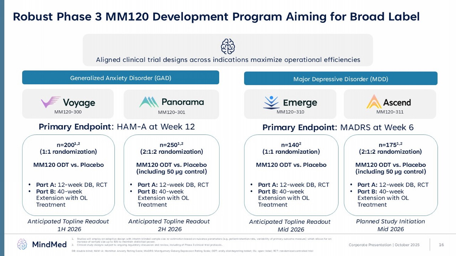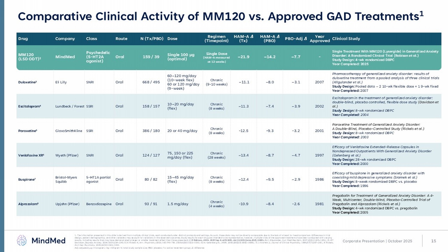 15 Corporate Presentation | October 2025 Comparative Clinical Activity of MM120 vs. Approved GAD Treatments 1 1. The information presented in this slide is derived from multiple clinical trials, each conducted under distinct protocols and settings. As such, these data may not be directly comparable due to the lack of a head - to - head comparison. Differences in trial design, patient demographics, and other variables may account for variations in the observed outcomes. Study results for each dr ug are intended to be representative, however, multiple trials of the approved treatments have been conducted with varying results, including results that may have demonstrated a larger or smaller treatment effect than those presented; 2) R Robison, JAMA. 2025 Sep 4; e2513481. doi:10.1001/jama.2025.13481.; 3. C Allgulander, Curr Med Res Opin. 2007;23(6):1245 – 1252.; 4) JRT Davidson, Depress Anxiety. 2004;19(4):234 – 240; 5) K Rickels K, Am J Psychiatry 2003; 160:749 - 756. 2005;62(9):1022 – 1030 .; 6) AJ Gelenberg AJ, JAMA. 2000;283(23):3082 – 3088.; 7) JJ Sramek JJ, Journal of Clinical Psychiatry. 1996;57(7):287 – 291.; K Rickels, Arch Gen Psychiatry. 2005;62(9):1022 – 1030. Adj: adjusted; µg: microgram; mg: milligram N: total study sample size; PBO: placebo; Tx: active treatment group; ߂ : difference Clinical Study Year Approved PBO - Adj ߂ HAM - A ߂ ( PBO) HAM - A ߂ ( Tx) Regimen (Timepoint) Dose N (Tx/PBO) Route Class Company Drug Single Treatment With MM120 (Lysergide) in Generalized Anxiety Disorder: A Randomized Clinical Trial (Robison et al.) Study Design: 4 - wk randomized DBPC Year Completed: 2025 - – 7.7 – 14.2 – 21.9 Single Dose (HAM - A measured at 12 weeks) Single 100 µg (optimal) 159 / 39 Oral Psychedelic (5 - HT2A agonist) MindMed MM120 (LSD ODT) 2 Pharmacotherapy of generalized anxiety disorder: results of duloxetine treatment from a pooled analysis of three clinical trials (Allgulander et al.) Study Design: Pooled data – 2 10 - wk flexible dose + 1 9 - wk fixed Year Completed: 2007 2007 – 3.1 – 8.0 – 11.1 Chronic (9 - 10 weeks) 60 – 120 mg/day (10 - week flex) 60 or 120 mg/day (9 - week) 668 / 495 Oral SNRI Eli Lilly Duloxetine 3 Escitalopram in the treatment of generalized anxiety disorder: double - blind, placebo controlled, flexible dose study (Davidson et al.) Study Design: 8 - wk randomized DBPC Year Completed: 2004 2002 – 3.9 – 7.4 – 11.3 Chronic (8 weeks) 10 – 20 mg/day (flex) 158 / 157 Oral SSRI Lundbeck / Forest Escitalopram 4 Paroxetine Treatment of Generalized Anxiety Disorder: A Double - Blind, Placebo - Controlled Study (Rickels et al.) Study Design: 8 - wk randomized DBPC Year Completed: 2003 2001 - 3.2 - 9.3 - 12.5 Chronic (8 weeks) 20 or 40 mg/day 386 / 180 Oral SSRI GlaxoSmithKline Paroxetine 5 Efficacy of Venlafaxine Extended - Release Capsules in Nondepressed Outpatients With Generalized Anxiety Disorder (Gelenberg et al.) Study Design: 28 - wk randomized DBPC Year Completed: 2000 1997 – 4.7 – 8.7 – 13.4 Chronic (28 weeks) 75, 150 or 225 mg/day (flex) 124 / 127 Oral SNRI Wyeth (Pfizer) Venlafaxine XR 6 Efficacy of buspirone in generalized anxiety disorder with coexisting mild depressive symptoms ( Sramek et al. ) Study Design: 8 - week randomized DBPC vs. placebo Year Completed: 1996 1986 – 2.9 – 9.5 – 12.4 Chronic (8 weeks) 15 – 45 mg/day (flex) 80 / 82 Oral 5 - HT1A partial agonist Bristol - Myers Squibb Buspirone 7 Pregabalin for Treatment of Generalized Anxiety Disorder: A 4 - Week, Multicenter, Double - blind, Placebo - Controlled Trial of Pregabalin and Alprazolam (Rickels et al.) Study Design: 4 - wk randomized DBPC vs. pregabalin Year Completed: 2005 1981 - 2.6 – 8.4 - 10.9 Chronic (4 weeks) 1.5 mg/day 93 / 91 Oral Benzodiazepine Upjohn (Pfizer) Alprazolam 8