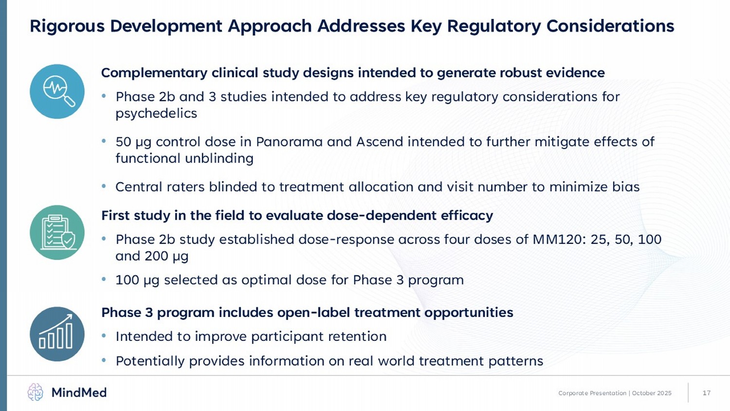 16 MM120 - 310 Robust Phase 3 MM120 Development Program Aiming for Broad Label 1. Studies will employ an adaptive design with interim blinded sample size re - estimation based on nuisance parameters (e.g. patient retention rate, variability of primary outcome measure) which allows for an increase of sample size up to 50% to maintain statistical power. 2. Clinical study designs subject to ongoing regulatory discussion and review, including of Phase 3 clinical trial protocols. DB: double blind; HAM - A: Hamilton Anxiety Rating Scale; MADRS: Montgomery - Åsberg Depression Rating Scale; ODT: orally disintegrating tablet; OL: open - label; RCT: randomized controlled trial MM120 - 300 MM120 - 301 Aligned clinical trial designs across indications maximize operational efficiencies Generalized Anxiety Disorder (GAD) Major Depressive Disorder (MDD) n=200 1,2 (1 :1 randomization) MM120 ODT vs. Placebo • Part A: 12 - week DB, RCT • Part B: 40 - week Extension with OL Treatment n=250 1,2 (2:1:2 randomization) MM120 ODT vs. Placebo (including 50 µg control) • Part A: 12 - week DB, RCT • Part B: 40 - week Extension with OL Treatment n=140 2 (1:1 randomization) MM120 ODT vs. Placebo • Part A: 12 - week DB, RCT • Part B: 40 - week Extension with OL Treatment Anticipated Topline Readout 1H 2026 Anticipated Topline Readout 2H 2026 Anticipated Topline Readout Mid 2026 n=175 1,2 (2:1:2 randomization) MM120 ODT vs. Placebo (including 50 µg control) • Part A: 12 - week DB, RCT • Part B: 40 - week Extension with OL Treatment Primary Endpoint : HAM - A at Week 12 Primary Endpoint : MADRS at Week 6 Corporate Presentation | October 2025 Planned Study Initiation Mid 2026 MM120 - 311