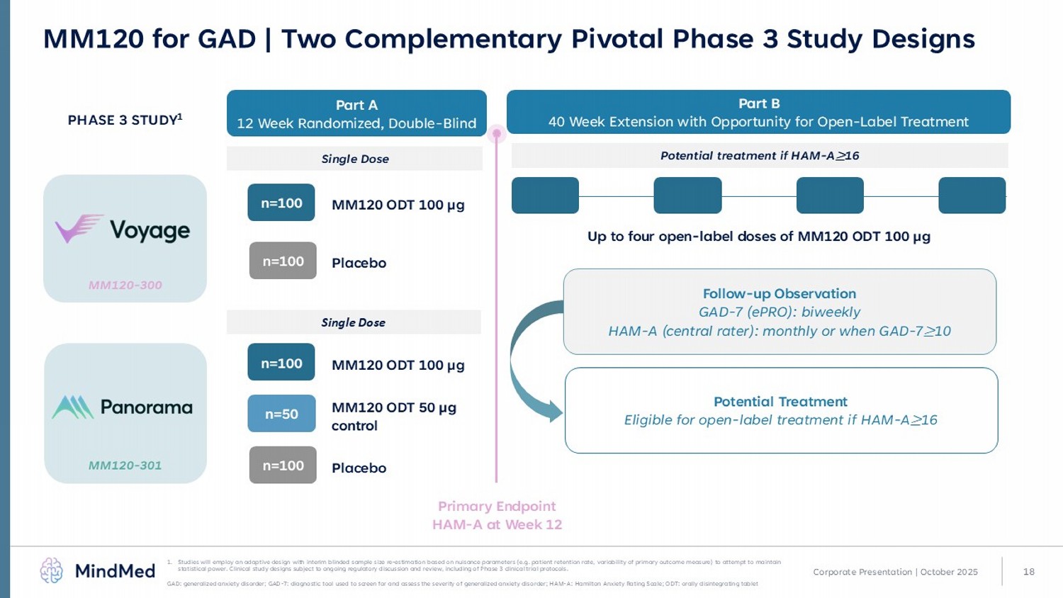 17 Rigorous Development Approach Addresses Key Regulatory Considerations Complementary clinical study designs intended to generate robust evidence • Phase 2b and 3 studies intended to address key regulatory considerations for psychedelics • 50 µg control dose in Panorama and Ascend intended to further mitigate effects of functional unblinding • Central raters blinded to treatment allocation and visit number to minimize bias First study in the field to evaluate dose - dependent efficacy • Phase 2b study established dose - response across four doses of MM120: 25, 50, 100 and 200 µg • 100 µg selected as optimal dose for Phase 3 program Phase 3 program includes open - label treatment opportunities • Intended to improve participant retention • Potentially provides information on real world treatment patterns Corporate Presentation | October 2025