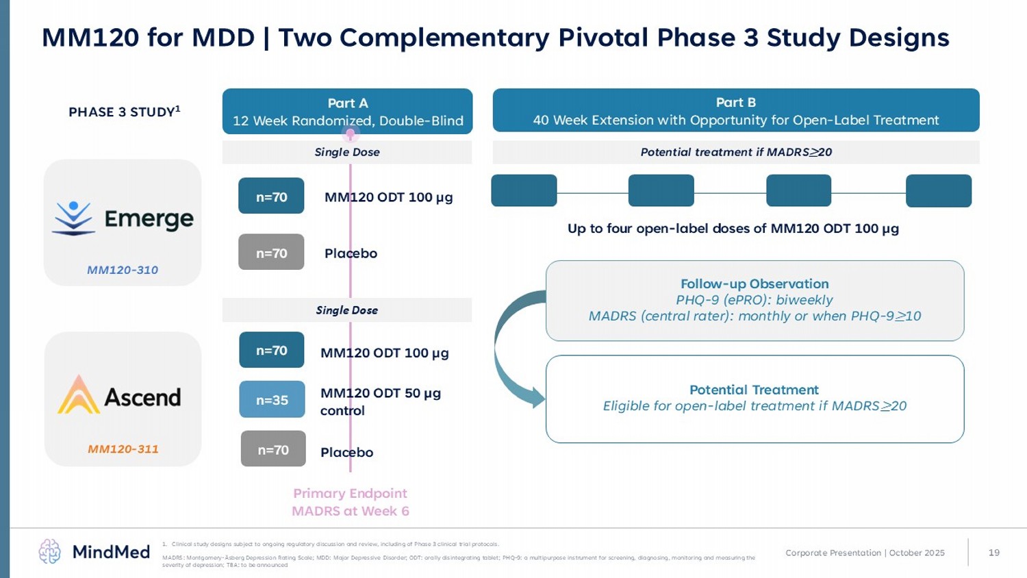 18 MM120 - 301 MM120 - 300 MM120 for GAD | Two Complementary Pivotal Phase 3 Study Designs 1. Studies will employ an adaptive design with interim blinded sample size re - estimation based on nuisance parameters (e.g. patient retention rate, variability of primary outcome measure) to attempt to maintain statistical power. Clinical study designs subject to ongoing regulatory discussion and review, including of Phase 3 clinical tri al protocols. GAD: generalized anxiety disorder; GAD - 7: diagnostic tool used to screen for and assess the severity of generalized anxiety diso rder; HAM - A: Hamilton Anxiety Rating Scale; ODT: orally disintegrating tablet MM120 ODT 1 00 µg n=100 Placebo n=100 Part A 12 Week Randomized, Double - Blind Part B 40 Week Extension with Opportunity for Open - Label Treatment MM120 ODT 1 00 µg n=100 Placebo n=100 MM120 ODT 50 µg control n=50 PHASE 3 STUDY 1 Single Dose Potential treatment if HAM - A ≥ 16 Primary Endpoint HAM - A at Week 12 Up to four open - label doses of MM120 ODT 1 00 µg Single Dose Follow - up Observation GAD - 7 (ePRO): biweekly HAM - A (central rater): monthly or when GAD - 7 ≥ 10 Potential Treatment Eligible for open - label treatment if HAM - A ≥ 16 Corporate Presentation | October 2025