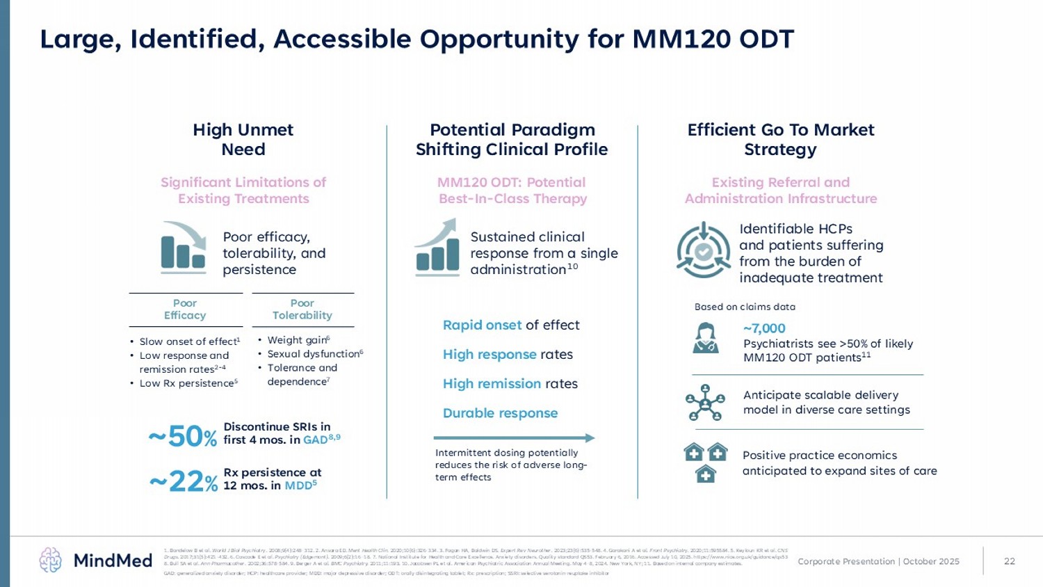 22 Large, Identified, Accessible Opportunity for MM120 ODT High Unmet Need Potential Paradigm Shifting Clinical Profile Efficient Go To Market Strategy Significant Limitations of Existing Treatments MM120 ODT: Potential Best - In - Class Therapy Existing Referral and Administration Infrastructure Sustained clinical response from a single administration 10 Identifiable HCPs and patients suffering from the burden of inadequate treatment Poor efficacy, tolerability, and persistence ~50 % Discontinue SRIs in first 4 mos. in GAD 8,9 Rapid onset of effect High response rates High remission rates Durable response Intermittent dosing potentially reduces the risk of adverse long - term effects • Slow onset of effect 1 • Low response and remission rates 2 - 4 • Low Rx persistence 5 • Weight gain 6 • Sexual dysfunction 6 • Tolerance and dependence 7 Poor Tolerability Poor Efficacy ~ 7,000 Psychiatrists see >50% of likely MM120 ODT patients 11 ~22 % Rx persistence at 12 mos. in MDD 5 Based on claims data Corporate Presentation | October 2025 1. Bandelow B et al. World J Biol Psychiatry . 2008;9(4):248 - 312. 2. Ansara ED. Ment Health Clin . 2020;10(6):326 - 334. 3. Fagan HA, Baldwin DS. Expert Rev Neurother . 2023;23(6):535 - 548. 4. Garakani A et al. Front Psychiatry . 2020;11:595584. 5. Keyloun KR et al. CNS Drugs. 2017;31(5):421 - 432. 6. Cascade E et al. Psychiatry (Edgemont) . 2009;6(2):16 - 18. 7. National Institute for Health and Care Excellence. Anxiety disorders. Quality standard QS53. February 6, 2 016. Accessed July 10, 2025. https:// www.nice.org.uk /guidance/qs53 8. Bull SA et al. Ann Pharmacother . 2002;36:578 - 584. 9. Berger A et al. BMC Psychiatry . 2011;11:193. 10. Jacobsen PL et al. American Psychiatric Association Annual Meeting. May 4 - 8, 2024. New York, NY; 11. Based on internal company estimates. GAD: generalized anxiety disorder; HCP: healthcare provider; MDD: major depressive disorder; ODT: orally disintegrating table t; Rx: prescription; SSRI: selective serotonin - reuptake inhibitor ​ Anticipate scalable delivery model in diverse care settings Positive practice economics anticipated to expand sites of care