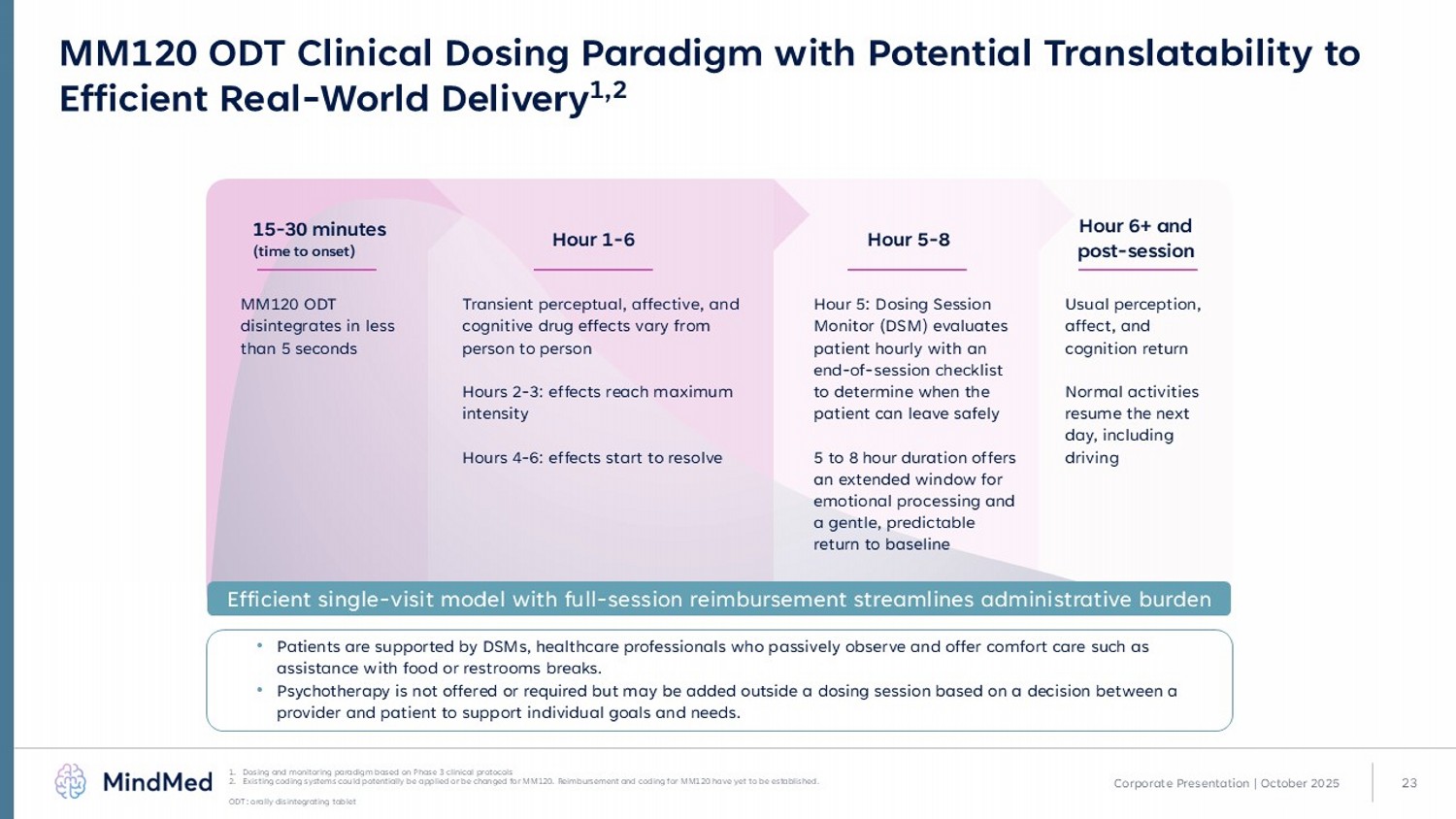 23 MM120 ODT Clinical Dosing Paradigm with Potential Translatability to Efficient Real - World Delivery 1,2 • Patients are supported by DSMs, healthcare professionals who passively observe and offer comfort care such as assistance with food or restrooms breaks. • Psychotherapy is not offered or required but may be added outside a dosing session based on a decision between a provider and patient to support individual goals and needs. Usual perception, affect, and cognition return Normal activities resume the next day, including driving Transient perceptual, affective, and cognitive drug effects vary from person to person Hours 2 - 3: effects reach maximum intensity Hours 4 - 6: effects start to resolve MM120 ODT disintegrates in less than 5 seconds Hour 5: Dosing Session Monitor (DSM) evaluates patient hourly with an end - of - session checklist to determine when the patient can leave safely 5 to 8 hour duration offers an extended window for emotional processing and a gentle, predictable return to baseline Efficient single - visit model with full - session reimbursement streamlines administrative burden Corporate Presentation | October 2025 1. Dosing and monitoring paradigm based on Phase 3 clinical protocols 2. Existing coding systems could potentially be applied or be changed for MM120. Reimbursement and coding for MM120 have yet to be established. ODT: orally disintegrating tablet Hour 6+ and post - session Hour 1 - 6 15 - 30 minutes (time to onset) Hour 5 - 8