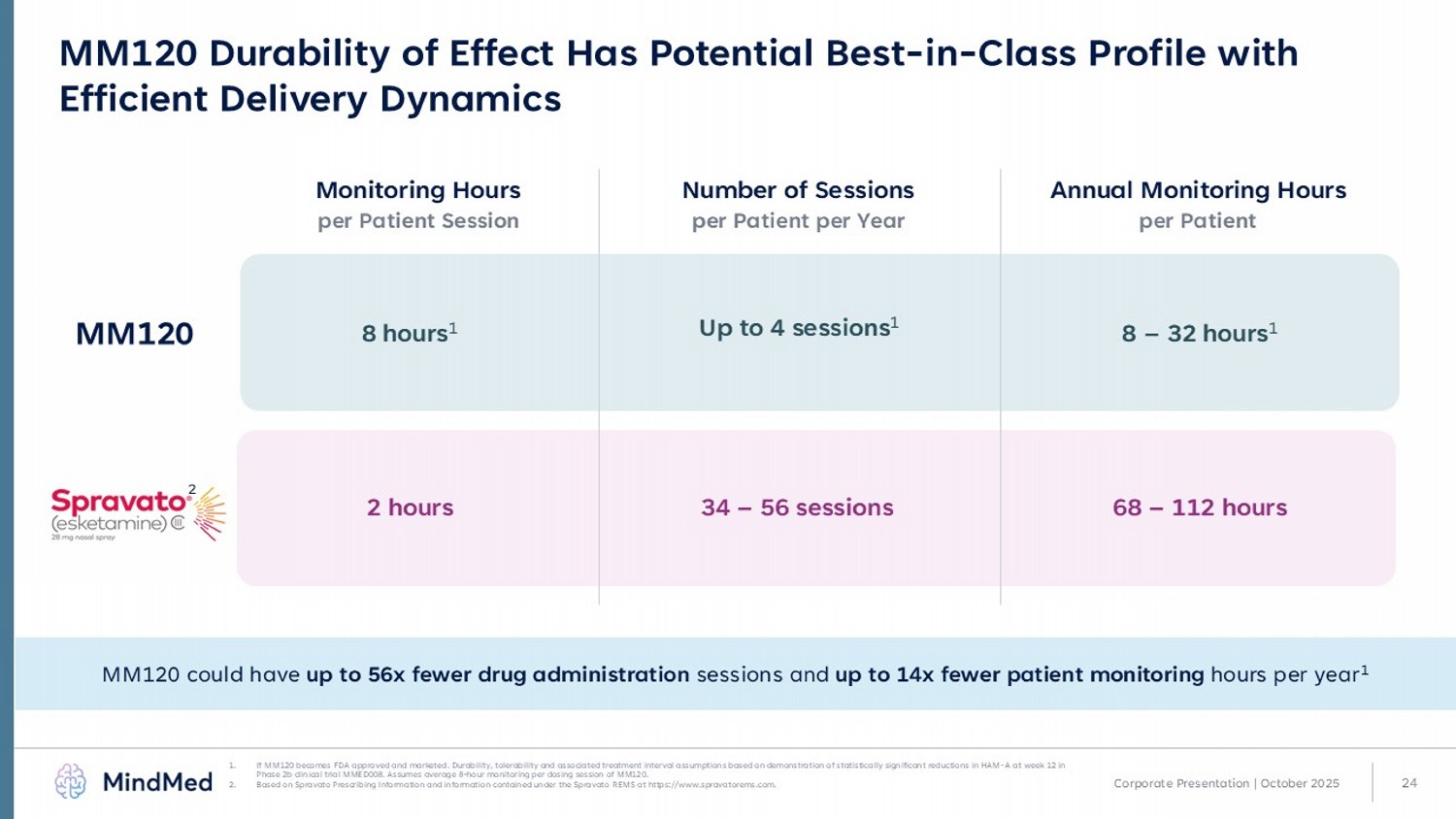 24 1. If MM120 becomes FDA approved and marketed. Durability, tolerability and associated treatment interval assumptions based on d emo nstration of statistically significant reductions in HAM - A at week 12 in Phase 2b clinical trial MMED008. Assumes average 8 - hour monitoring per dosing session of MM120. 2. Based on Spravato Prescribing Information and information contained under the Spravato REMS at https:// www.spravatorems.com . MM120 could have up to 56x fewer drug administration sessions and up to 14x fewer patient monitoring hours per year 1 MM120 Durability of Effect Has Potential Best - in - Class Profile with Efficient Delivery Dynamics Monitoring Hours per Patient Session Number of Sessions per Patient per Year Annual Monitoring Hours per Patient MM120 8 hours 1 2 hours Up to 4 sessions 1 34 – 56 sessions 8 – 32 hours 1 68 – 112 hours 2 Corporate Presentation | October 2025