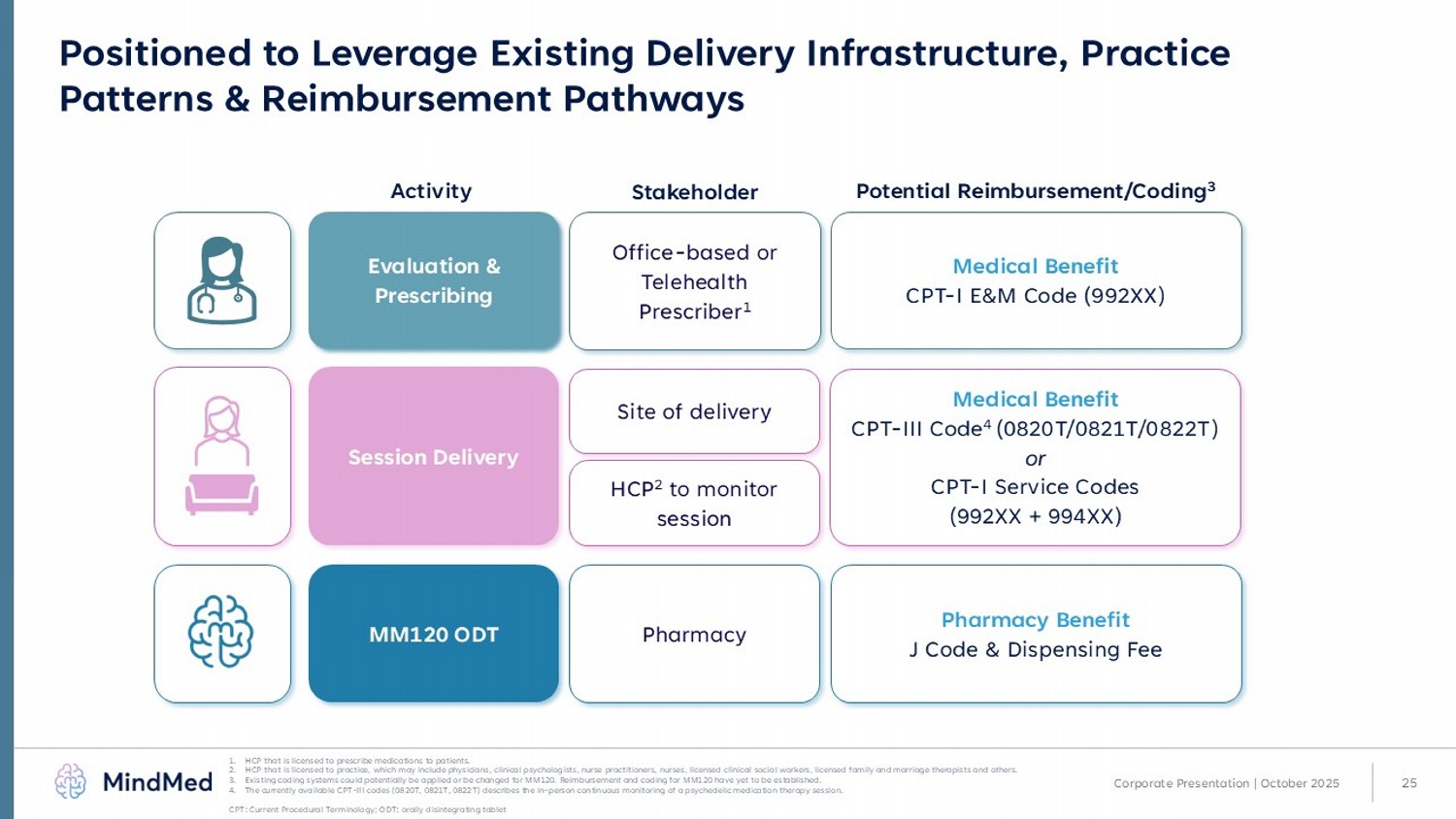25 Corporate Presentation | October 2025 Positioned to Leverage Existing Delivery Infrastructure, Practice Patterns & Reimbursement Pathways 1. HCP that is licensed to prescribe medications to patients. 2. HCP that is licensed to practice, which may include physicians, clinical psychologists, nurse practitioners, nurses, licensed cl inical social workers, licensed family and marriage therapists and others. 3. Existing coding systems could potentially be applied or be changed for MM120. Reimbursement and coding for MM120 have yet to be established. 4. The currently available CPT - III codes (0820T, 0821T, 0822T) describes the in - person continuous monitoring of a psychedelic medic ation therapy session. CPT: Current Procedural Terminology; ODT: orally disintegrating tablet Office - based or Telehealth Prescriber 1 Evaluation & Prescribing Pharmacy MM120 ODT Site of delivery Session Delivery Activity Medical Benefit CPT - I E &M Code (992XX) Pharmacy Benefit J Code & Dispensing Fee Medical Benefit CPT - III Code 4 (0820T /0821T/0822T) or CPT - I Service Codes ( 992XX + 994XX) Stakeholder Potential Reimbursement/Coding 3 HCP 2 to monitor session