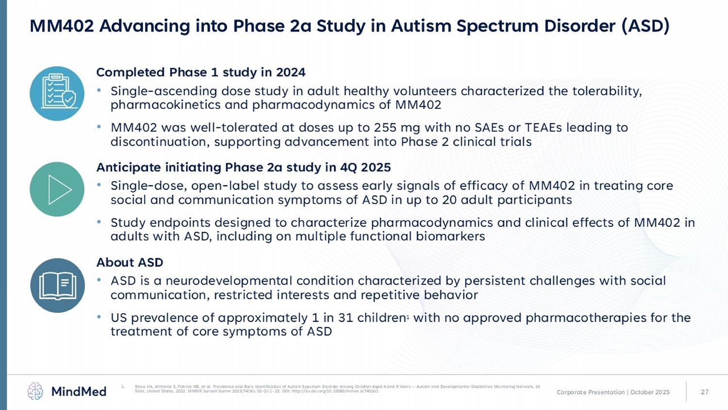 27 MM402 Advancing into Phase 2a Study in Autism Spectrum Disorder (ASD) Completed Phase 1 study in 2024 • Single - ascending dose study in adult healthy volunteers characterized the tolerability, pharmacokinetics and pharmacodynamics of MM402 • MM402 was well - tolerated at doses up to 255 mg with no SAEs or TEAEs leading to discontinuation, supporting advancement into Phase 2 clinical trials Anticipate initiating Phase 2a study in 4Q 2025 • Single - dose, open - label study to assess early signals of efficacy of MM402 in treating core social and communication symptoms of ASD in up to 20 adult participants • Study endpoints designed to characterize pharmacodynamics and clinical effects of MM402 in adults with ASD, including on multiple functional biomarkers About ASD • ASD is a neurodevelopmental condition characterized by persistent challenges with social communication, restricted interests and repetitive behavior • US prevalence of approximately 1 in 31 children 1 with no approved pharmacotherapies for the treatment of core symptoms of ASD Corporate Presentation | October 2025 1. Shaw KA, Williams S, Patrick ME, et al. Prevalence and Early Identification of Autism Spectrum Disorder Among Children Aged 4 an d 8 Years — Autism and Developmental Disabilities Monitoring Network, 16 Sites, United States, 2022. MMWR Surveill Summ 2025;74(No. SS - 2):1 – 22. DOI: http:// dx.doi.org /10.15585/mmwr.ss7402a1