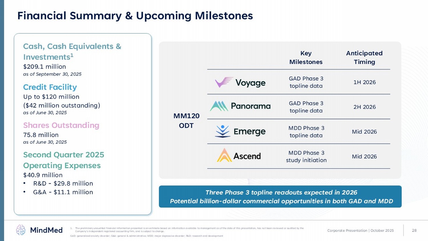 28 x $250 million in equity investment x Initiation of Phase 3 program for MM120 ODT in GAD (first patient dosed in Phase 3 Voyage study) x MM120 Phase 2b results presented at APA Annual Meeting x MM120 granted breakthrough designation by U.S. FDA x Successful end - of - phase 2 meeting with U.S. FDA supporting pivotal trial plans x MM120 ODT patent issued covering pharmaceutical formulation, methods of manufacturing and treatment; patent life through 2041 x MM120 ODT awarded Innovation Passport by the U.K. MHRA Financial Summary & Upcoming Milestones Corporate Presentation | October 2025 Anticipated Timing Key Milestones 1H 2026 GAD Phase 3 topline data 2H 2026 GAD Phase 3 topline data Mid 2026 MDD Phase 3 topline data Mid 2026 MDD Phase 3 study initiation Three Phase 3 topline readouts expected in 2026 Potential billion - dollar commercial opportunities in both GAD and MDD Cash, Cash Equivalents & Investments 1 $209.1 million a s of September 30, 2025 Credit Facility Up to $120 million ($42 million outstanding) a s of June 30, 2025 Shares Outstanding 75.8 million a s of June 30, 2025 Second Quarter 2025 Operating Expenses $ 40.9 million • R&D - $ 29.8 million • G&A - $ 11.1 million MM120 ODT 1. The preliminary unaudited financial information presented is an estimate based on information available to management as of the date of this presentation, has not been reviewed or audited by the Company's independent registered accounting firm, and is subject to change. GAD: generalized anxiety disorder; G&A: general & administrative; MDD: major depressive disorder; R&D: research and developme nt ​
