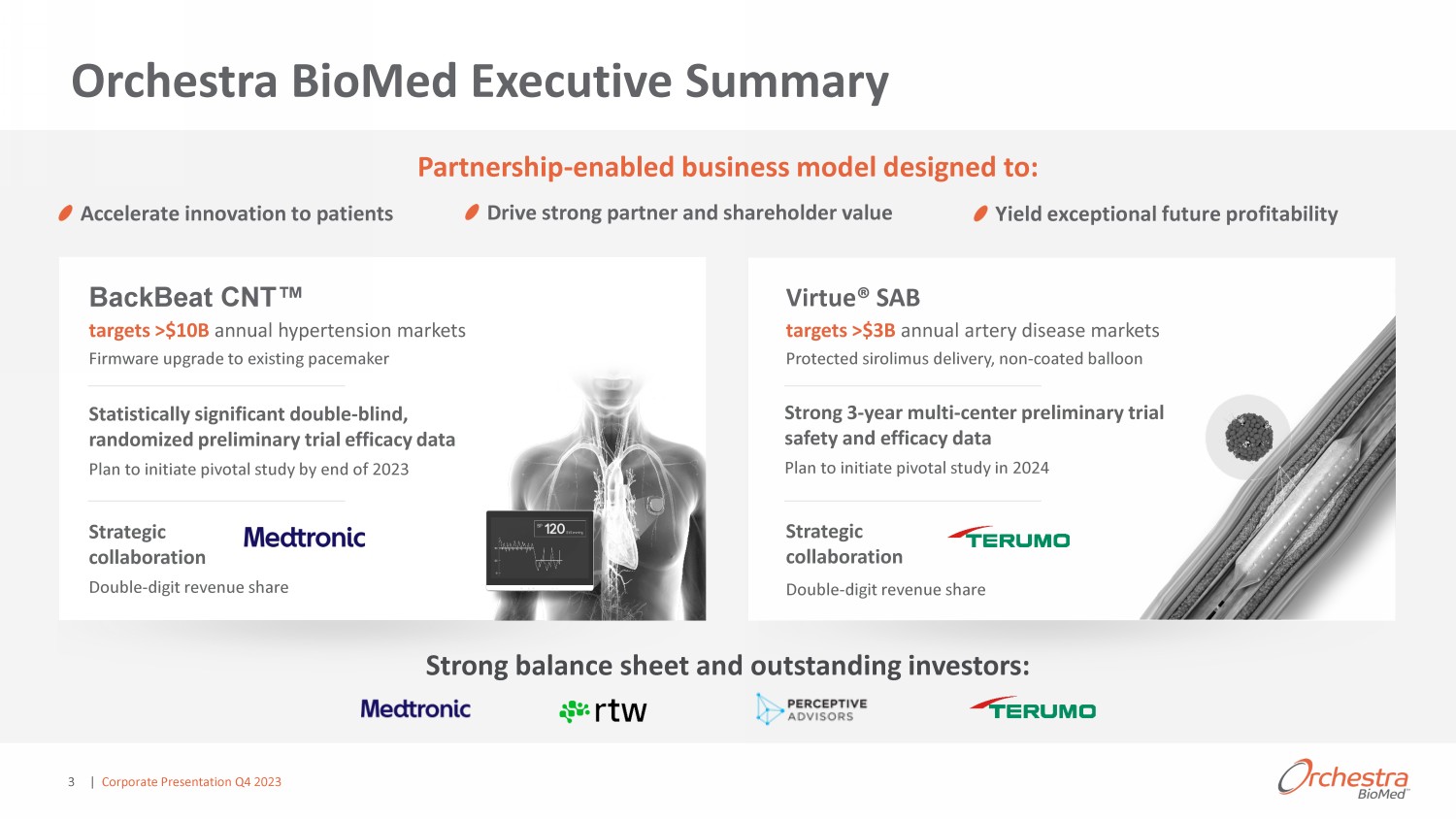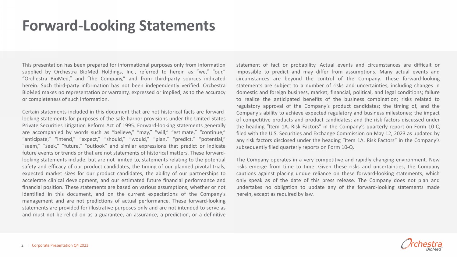| Corporate Presentation Q4 2023 2 Forward - Looking Statements This presentation has been prepared for informational purposes only from information supplied by Orchestra BioMed Holdings, Inc . , referred to herein as “we,” “our,” “Orchestra BioMed,” and “the Company,” and from third - party sources indicated herein . Such third - party information has not been independently verified . Orchestra BioMed makes no representation or warranty, expressed or implied, as to the accuracy or completeness of such information . Certain statements included in this document that are not historical facts are forward - looking statements for purposes of the safe harbor provisions under the United States Private Securities Litigation Reform Act of 1995 . Forward - looking statements generally are accompanied by words such as “believe,” “may,” “will,” “estimate,” “continue,” “anticipate,” “intend,” “expect,” “should,” “would,” “plan,” “predict,” “potential,” “seem,” “seek,” “future,” “outlook” and similar expressions that predict or indicate future events or trends or that are not statements of historical matters . These forward - looking statements include, but are not limited to, statements relating to the potential safety and efficacy of our product candidates, the timing of our planned pivotal trials, expected market sizes for our product candidates, the ability of our partnerships to accelerate clinical development, and our estimated future financial performance and financial position . These statements are based on various assumptions, whether or not identified in this document, and on the current expectations of the Company’s management and are not predictions of actual performance . These forward - looking statements are provided for illustrative purposes only and are not intended to serve as and must not be relied on as a guarantee, an assurance, a prediction, or a definitive statement of fact or probability . Actual events and circumstances are difficult or impossible to predict and may differ from assumptions . Many actual events and circumstances are beyond the control of the Company . These forward - looking statements are subject to a number of risks and uncertainties, including changes in domestic and foreign business, market, financial, political, and legal conditions ; failure to realize the anticipated benefits of the business combination ; risks related to regulatory approval of the Company’s product candidates ; the timing of, and the Company’s ability to achieve expected regulatory and business milestones ; the impact of competitive products and product candidates ; and the risk factors discussed under the heading “Item 1 A . Risk Factors” in the Company’s quarterly report on Form 10 - Q filed with the U . S . Securities and Exchange Commission on May 12 , 2023 as updated by any risk factors disclosed under the heading “Item 1 A . Risk Factors” in the Company’s subsequently filed quarterly reports on Form 10 - Q . The Company operates in a very competitive and rapidly changing environment . New risks emerge from time to time . Given these risks and uncertainties, the Company cautions against placing undue reliance on these forward - looking statements, which only speak as of the date of this press release . The Company does not plan and undertakes no obligation to update any of the forward - looking statements made herein, except as required by law .