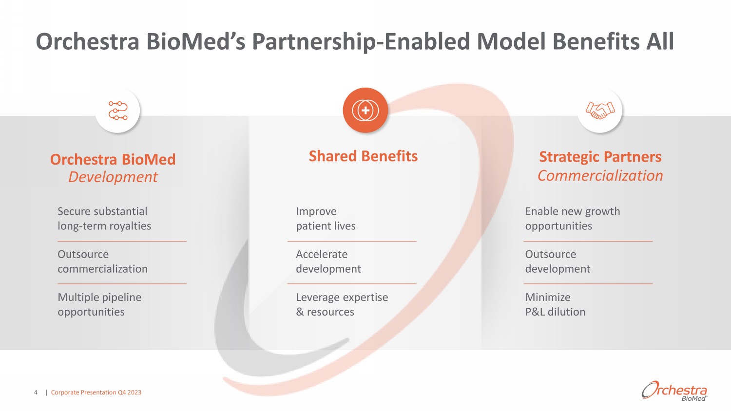 Orchestra BioMed Executive Summary Strong balance sheet and outstanding investors: Strong 3 - year multi - center preliminary trial safety and efficacy data Plan to initiate pivotal study in 2024 Strategic collaboration Double - digit revenue share Virtue® SAB targets >$3B annual artery disease markets Protected sirolimus delivery, non - coated balloon Partnership - enabled business model designed to: Accelerate innovation to patients Drive strong partner and shareholder value Yield exceptional future profitability Statistically significant double - blind, randomized preliminary trial efficacy data Plan to initiate pivotal study by end of 2023 Strategic collaboration Double - digit revenue share ƚ Ed Ρ ƚ ƌŐ ƚƐ хΨ ϭϬ ŶŶƵ ů ŚLJƉ ƌƚ ŶƐŝŽŶ ŵ ƌ ƚƐ &ŝƌŵǁ ƌ ƵƉŐƌ Ě ƚŽ džŝƐƚŝŶŐ Ɖ ŵ ƌ | Corporate Presentation Q4 2023 3