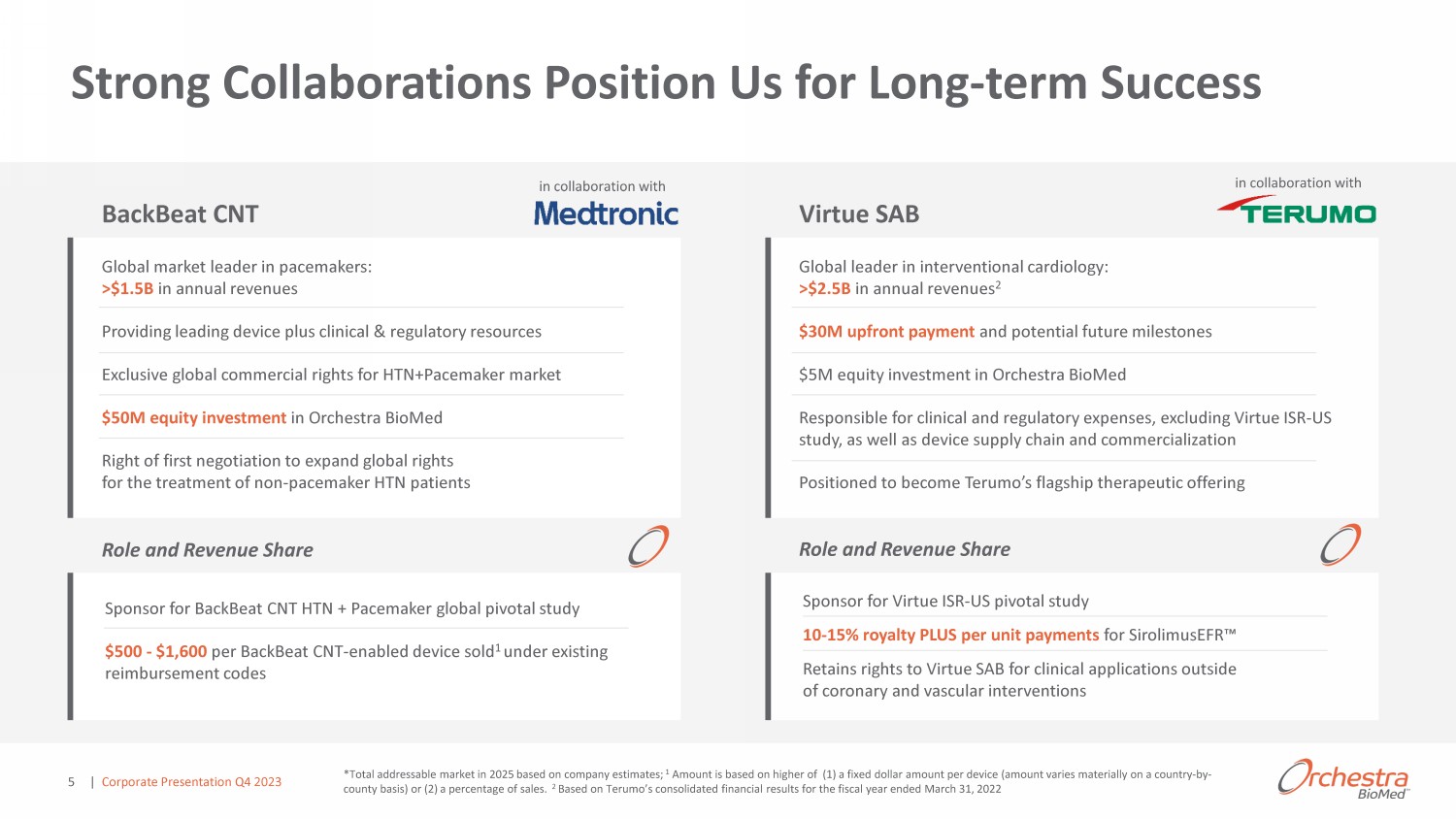 Orchestra BioMed Development Commercialization Strategic Partners Shared Benefits ^ Ƶƌ ƐƵďƐƚ Ŷƚŝ ů ůŽŶŐ Ͳ ƚ ƌŵ ƌŽLJ ůƚŝ Ɛ KƵƚƐŽƵƌ Žŵŵ ƌ ŝ ůŝnj ƚŝŽŶ DƵůƚŝƉů ƉŝƉ ůŝŶ ŽƉƉŽƌƚƵŶŝƚŝ Ɛ Improve patient lives Accelerate development Leverage expertise & resources Enable new growth opportunities Outsource development Minimize P&L dilution Orchestra BioMed’s Partnership - Enabled Model Benefits All | Corporate Presentation Q4 2023 4