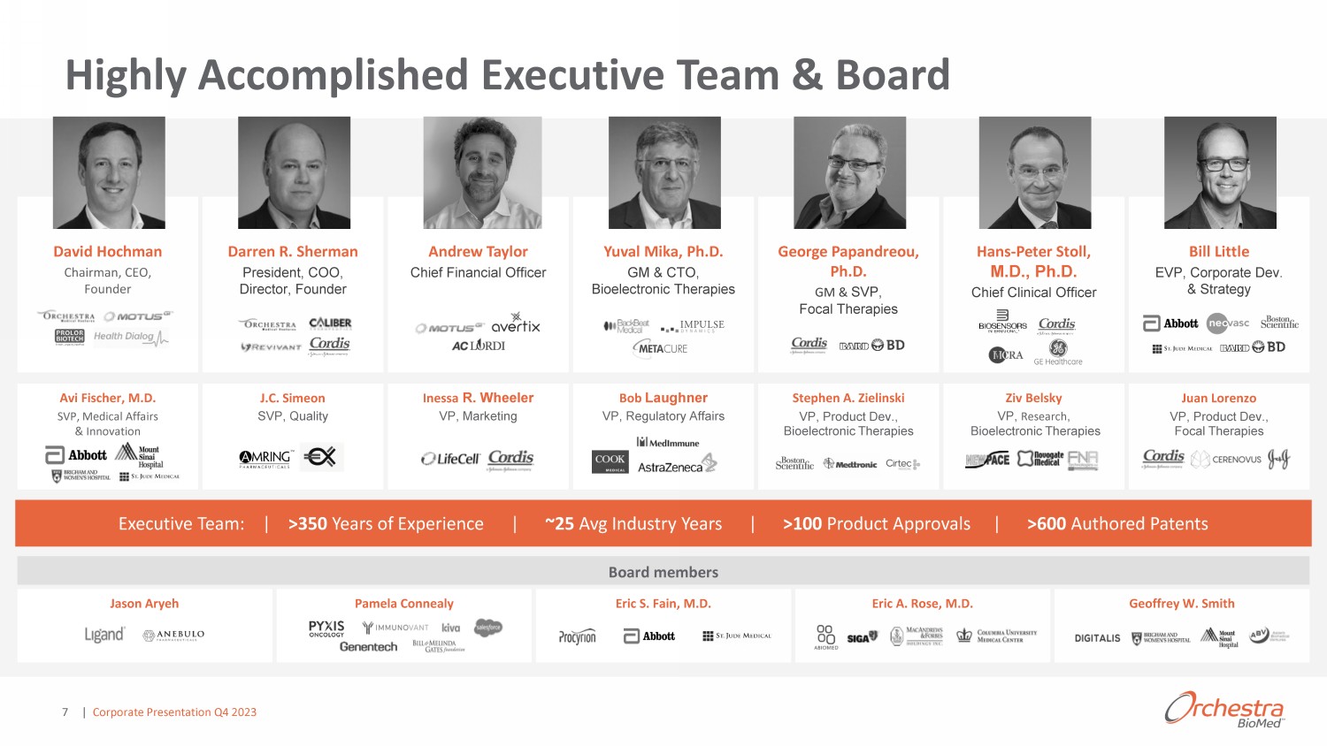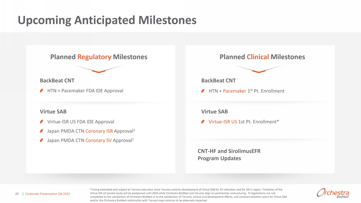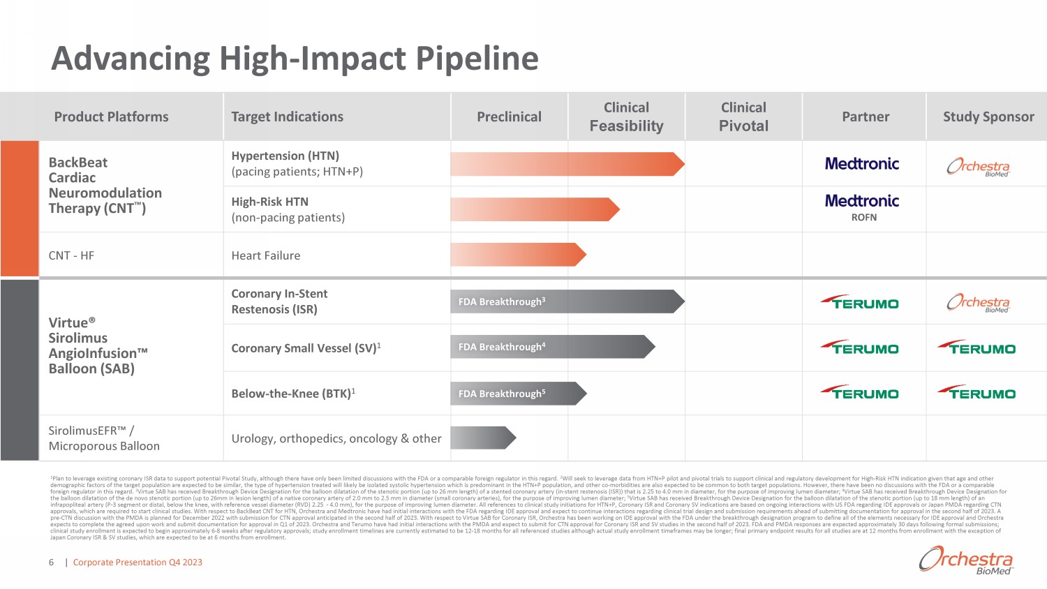 Advancing High - Impact Pipeline 1 Plan to leverage existing coronary ISR data to support potential Pivotal Study, although there have only been limited discussions with the FDA or a comparable foreign regulator in this regard. 2 Will seek to leverage data from HTN+P pilot and pivotal trials to support clinical and regulatory development for High - Risk HTN indication given that age and other demographic factors of the target population are expected to be similar, the type of hypertension treated will likely be isol ate d systolic hypertension which is predominant in the HTN+P population, and other co - morbidities are also expected to be common to both target populations. However, there have been no discussions with the FDA or a comparable foreign regulator in this regard. 3 Virtue SAB has received Breakthrough Device Designation for the balloon dilatation of the stenotic portion (up to 26 mm length) of a stented coronary artery (in - stent restenosis (ISR)) that is 2.25 to 4.0 mm in diameter, for the purpose of improving lumen diameter; 4 Virtue SAB has received Breakthrough Device Designation for the balloon dilatation of the de novo stenotic portion (up to 26mm in lesion length) of a native coronary artery of 2.0 mm to 2.5 mm in diameter (sm all coronary arteries), for the purpose of improving lumen diameter; 5 Virtue SAB has received Breakthrough Device Designation for the balloon dilatation of the stenotic portion (up to 18 mm length) of an infrapopliteal artery (P - 3 segment or distal, below the knee, with reference vessel diameter (RVD) 2.25 - 4.0 mm), for the purpose of improvi ng lumen diameter. All references to clinical study initiations for HTN+P, Coronary ISR and Coronary SV indications are based on ongoing interac tio ns with US FDA regarding IDE approvals or Japan PMDA regarding CTN approvals, which are required to start clinical studies. With respect to BackBeat CNT for HTN, Orchestra and Medtronic have had initial interactions with the FDA regarding IDE approval and expect to continue i nteractions regarding clinical trial design and submission requirements ahead of submitting documentation for approval in the se cond half of 2023. A pre - CTN discussion with the PMDA is planned for December 2022 with submission for CTN approval anticipated in the second half of 2023. With respect to Virtue SAB for Coronary ISR, Orchestra has been working on IDE approval with the FDA under the breakthr ou gh designation program to define all of the elements necessary for IDE approval and Orchestra expects to complete the agreed upon work and submit documentation for approval in Q1 of 2023. Orchestra and Terumo have had i nit ial interactions with the PMDA and expect to submit for CTN approval for Coronary ISR and SV studies in the second half of 20 23. FDA and PMDA responses are expected approximately 30 days following formal submissions; clinical study enrollment is expected to begin approximately 6 - 8 weeks after regulatory approvals; study enrollment timelines ar e currently estimated to be 12 - 18 months for all referenced studies although actual study enrollment timeframes may be longer; f inal primary endpoint results for all studies are at 12 months from enrollment with the exception of Japan Coronary ISR & SV studies, which are expected to be at 6 months from enrollment. Product Platforms Target Indications Preclinical Clinical Feasibility Clinical Pivotal Partner Study Sponsor BackBeat Cardiac Neuromodulation Therapy (CNT Ρ ) Hypertension (HTN) (pacing patients; HTN+P) High - Risk HTN (non - pacing patients) ROFN CNT - HF Heart Failure Virtue® Sirolimus AngioInfusion Ρ Balloon (SAB) Coronary In - Stent Restenosis (ISR) ŽƌŽŶ ƌLJ ^ŵ ůů s ƐƐ ů ;^sͿ ϭ Below - the - Knee (BTK) 1 SirolimusEFR Ρ / Microporous Balloon Urology, orthopedics, oncology & other FDA Breakthrough 3 FDA Breakthrough 4 FDA Breakthrough | Corporate Presentation Q4 2023 6