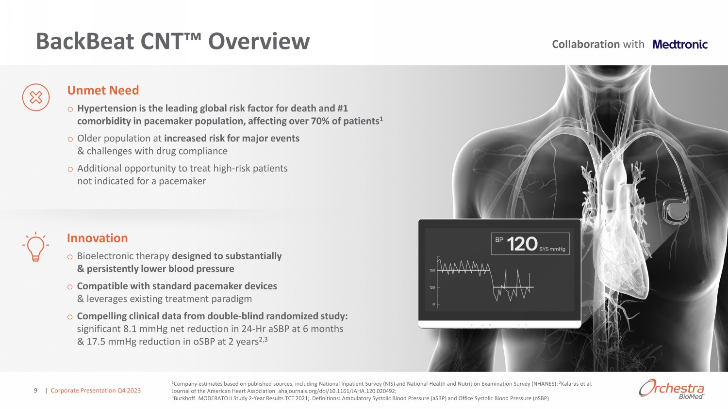 BackBeat CNT Ρ Overview 1 Company estimates based on published sources, including National Inpatient Survey (NIS) and National Health and Nutrition Exa min ation Survey (NHANES); 2 Kalaras et al. Journal of the American Heart Association. ahajournals.org/ doi /10.1161/JAHA.120.020492; 3 Burkhoff. MODERATO II Study 2 - Year Results TCT 2021;. Definitions: Ambulatory Systolic Blood Pressure ( aSBP ) and Office Systolic Blood Pressure ( oSBP ) o Hypertension is the leading global risk factor for death and #1 comorbidity in pacemaker population, affecting over 70% of patients 1 o Older population at increased risk for major events & challenges with drug compliance o Additional opportunity to treat high - risk patients not indicated for a pacemaker Unmet Need o Bioelectronic therapy designed to substantially & persistently lower blood pressure o Compatible with standard pacemaker devices & leverages existing treatment paradigm o Compelling clinical data from double - blind randomized study: significant 8.1 mmHg net reduction in 24 - Hr aSBP at 6 months & 17.5 mmHg reduction in oSBP at 2 years 2,3 Innovation Collaboration with | Corporate Presentation Q4 2023 9