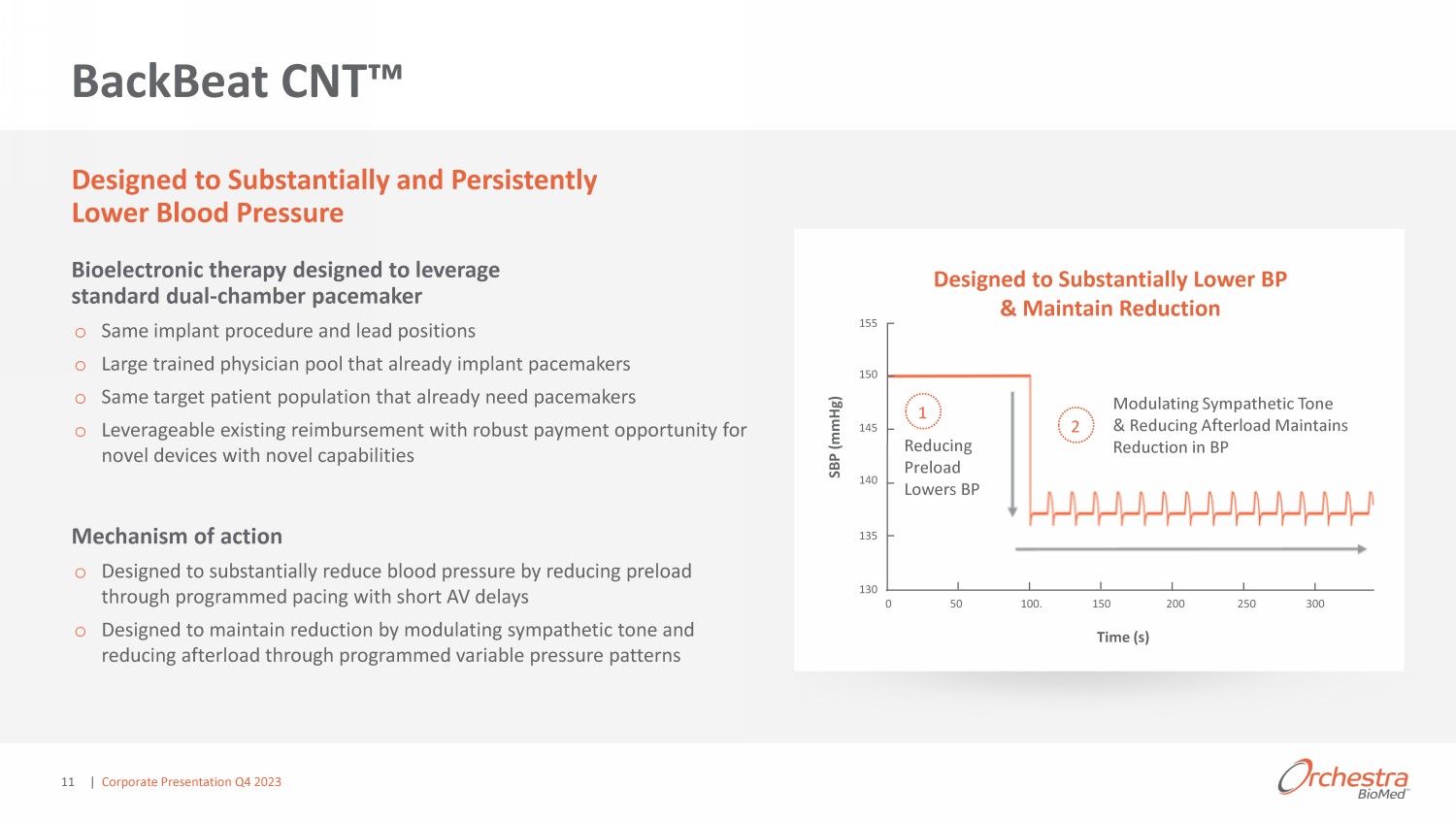 BackBeat CNT Ρ Designed to Substantially and Persistently Lower Blood Pressure Bioelectronic therapy designed to leverage standard dual - chamber pacemaker o Same implant procedure and lead positions o Large trained physician pool that already implant pacemakers o Same target patient population that already need pacemakers o Leverageable existing reimbursement with robust payment opportunity for novel devices with novel capabilities Mechanism of action o Designed to substantially reduce blood pressure by reducing preload through programmed pacing with short AV delays o Designed to maintain reduction by modulating sympathetic tone and reducing afterload through programmed variable pressure patterns Designed to Substantially Lower BP & Maintain Reduction Reducing Preload Lowers BP Modulating Sympathetic Tone & Reducing Afterload Maintains Reduction in BP SBP (mmHg) Time (s) 155 0 50 100. 150 200 250 300 150 145 140 135 130 1 2 | Corporate Presentation Q4 2023 11