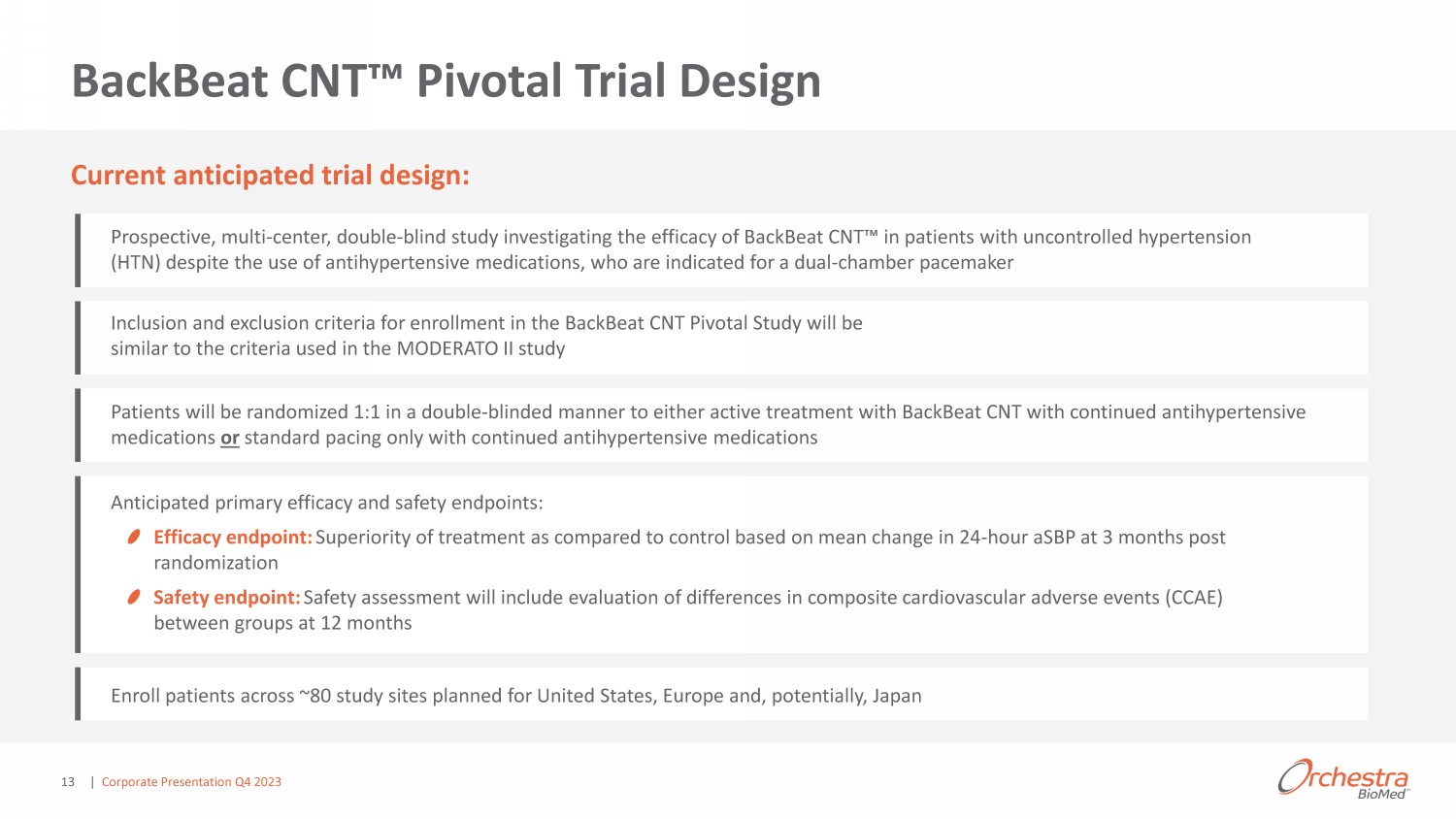 MODERATO II Double - Blind, Randomized Results 1 Kalaras et al. Journal of the American Heart Association. 2021;10:e020492 ahajournals.org/ doi /10.1161/JAHA.120.020492; 2 Burkhoff MODERATO II Study 2 - Year Results TCT 2021; 3 24 - Hr aSBP Control (n=19),1 control patient could not be measured despite repeat measurement (patient had extremely high blood pressure) ; D efinitions: Major Adverse Cardiac Events (MACE) included death, heart failure, clinically significant arrhythmias (i.e., persistent or increased atrial fibrillation, serious ventricular arr hyt hmias), myocardial infarction, stroke and renal failure in treatment group calculated per patient, Office Systolic Blood Pressure ( oSBP ), Ambulatory Systolic Blood Pressure ( aSBP ) 150 145 140 135 130 125 120 115 110 00:00 01:00 02:00 03:00 04:00 05:00 06:00 07:00 08:00 09:00 10:00 11:00 12:00 13:00 14:00 15:00 16:00 17:00 18:00 19:00 20:00 21:00 22:00 23:00 24 - Hr aSBP (mmHg) P < 0.01 for all times of day Pre - activation (n=26) 6 months (n=26) 6 Month Mean Pre - activation Mean Significant Reduction in aSBP 24 Hours a Day Significant Reduction in 24 - Hr aSBP and oSBP 1,2 6 Months 24 Months aSBP oSBP 6 Months 0 - 5 - 10 - 15 - 20 - 11.1 P < 0.001 - 12.4 P < 0.001 - 0.1 P = 0.94 - 17.5 P < 0.01 Δ - 12.3 p = 0.02 Δ - 8.1 p = 0.01 Δ in BP (mmHg) Control (n=20) 3 BackBeat CNT (n=26) - 3.1 P =0.17 ƚ Ed Ρ ƐŚŽǁ Ě Ŷ ŽƵƌ ŐŝŶŐ ƌ ƐƵůƚƐ ŝŶ DK Z dK //͕ ƉƌŽƐƉ ƚŝǀ ͕ ŵƵůƚŝ Ͳ Ŷƚ ƌ͕ ƌ ŶĚŽŵŝnj Ě͕ ; ƚ Ed н D Ěŝ ů dŚ ƌ ƉLJ ǀƐ͘ ŽŶƚŝŶƵ Ě D Ěŝ ů dŚ ƌ ƉLJͿ͕ ĚŽƵďů Ͳ ďůŝŶĚ͕ ƉŝůŽƚ ƐƚƵĚLJ ŽĨ Ɖ ŵ ƌ Ɖ ƚŝ ŶƚƐ ǁŝƚŚ Ɖ ƌƐŝƐƚ Ŷƚ ŚLJƉ ƌƚ ŶƐŝŽŶ - 11.1 mmHg in 24 - Hour aSBP at 6 months - 17.5 mmHg in oSBP at 2 years 0% MACE vs. 9.5% in control group at 6 months 85% of patients with reduction in aSBP | Corporate Presentation Q4 2023 12
