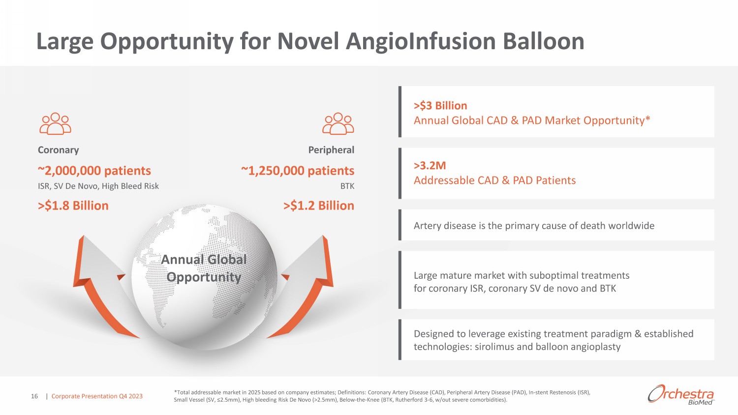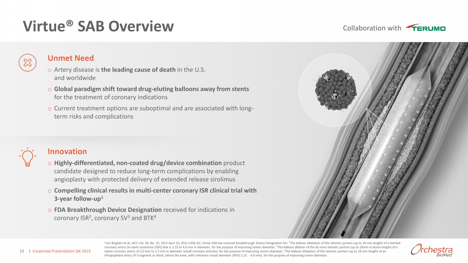 Virtue® SAB Overview 1 von Birgelen et al. JACC Vol. 59, No. 15, 2012 April 10, 2012:1350 – 61; Virtue SAB has received Breakthrough Device Designation for: 2 The balloon dilatation of the stenotic portion (up to 26 mm length) of a stented coronary artery (in - stent restenosis (ISR)) that is 2.25 to 4.0 mm in diameter, for the purpose of improving lumen diameter; 3 The balloon dilation of the de novo stenotic portion (up to 26mm in lesion length) of a native coronary artery of 2.0 mm to 2.5 mm in diameter (small coronary arteries), for the purpose of improving lumen diameter ; 4 The balloon dilatation of the stenotic portion (up to 18 mm length) of an infrapopliteal artery (P - 3 segment or distal, below the knee, with reference vessel diameter (RVD) 2.25 - 4.0 mm), for the purpose of improvi ng lumen diameter. o Artery disease is the leading cause of death in the U.S. and worldwide o Global paradigm shift toward drug - eluting balloons away from stents for the treatment of coronary indications o Current treatment options are suboptimal and are associated with long - term risks and complications Unmet Need o Highly - differentiated, non - coated drug/device combination product candidate designed to reduce long - term complications by enabling angioplasty with protected delivery of extended release sirolimus o Compelling clinical results in multi - center coronary ISR clinical trial with 3 - year follow - up 1 o FDA Breakthrough Device Designation received for indications in coronary ISR 2 , coronary SV 3 and BTK 4 /ŶŶŽǀ ƚŝŽŶ Collaboration with | Corporate Presentation Q4 2023 15