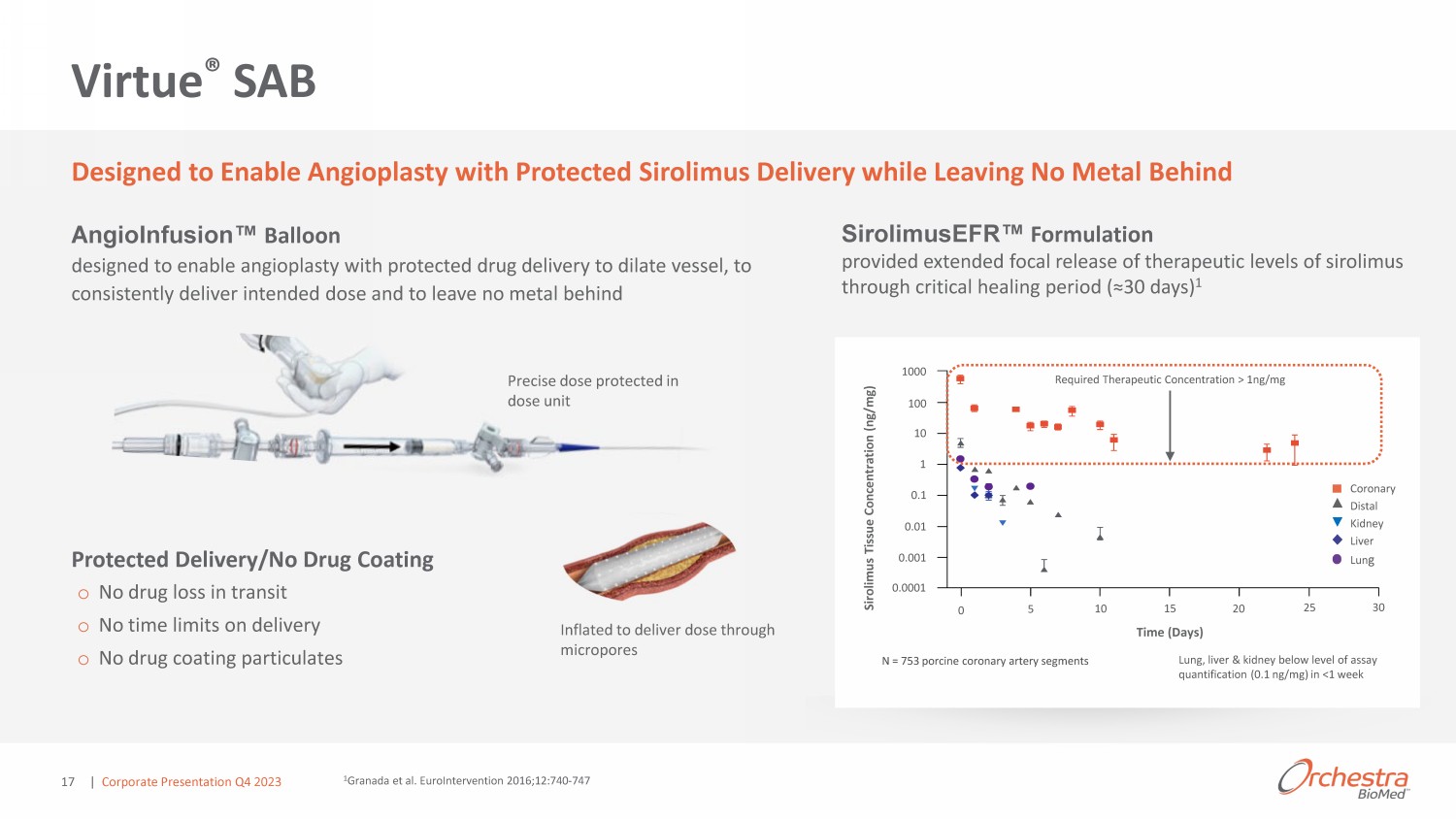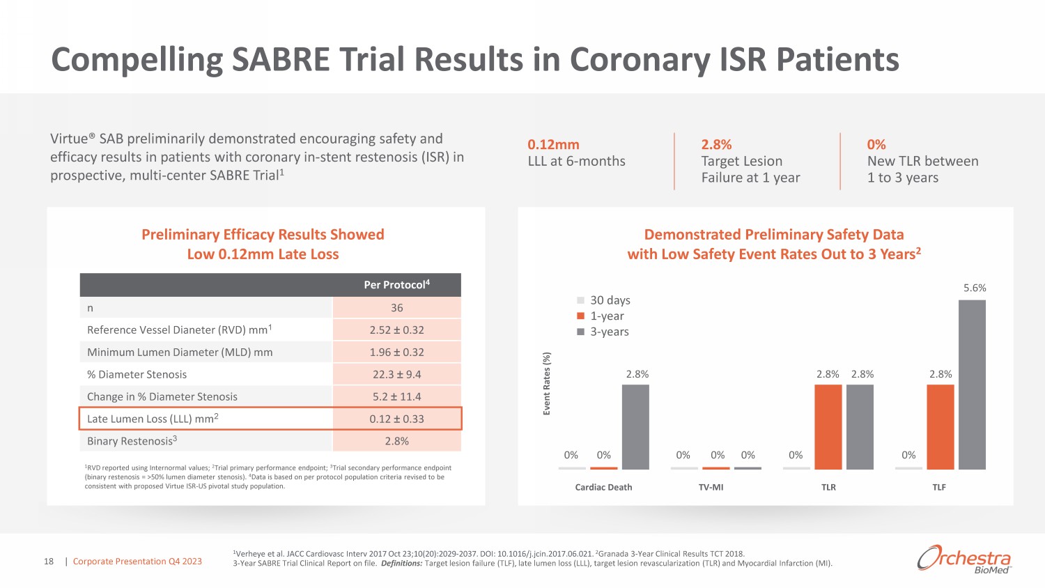 Virtue ® SAB Designed to Enable Angioplasty with Protected Sirolimus Delivery while Leaving No Metal Behind ŶŐŝŽ/ŶĨƵƐŝŽŶ Ρ ůůŽŽŶ Ě ƐŝŐŶ Ě ƚŽ Ŷ ďů ŶŐŝŽƉů ƐƚLJ ǁŝƚŚ ƉƌŽƚ ƚ Ě ĚƌƵŐ Ě ůŝǀ ƌLJ ƚŽ Ěŝů ƚ ǀ ƐƐ ů͕ ƚŽ ŽŶƐŝƐƚ ŶƚůLJ Ě ůŝǀ ƌ ŝŶƚ ŶĚ Ě ĚŽƐ ŶĚ ƚŽ ů ǀ ŶŽ ŵ ƚ ů ď ŚŝŶĚ 1000 100 10 1 0.1 0.01 0.001 Ϭ͘ϬϬϬϭ Required Therapeutic Concentration > 1ng/mg Lung, liver & kidney below level of assay quantification (0.1 ng/mg) in <1 week 0 5 10 15 20 Ϯϱ 30 Coronary Distal Kidney Liver Lun g Time (Days) N = 753 porcine coronary artery segments Sirolimus Tissue Concentration (ng/mg) ^ŝƌŽůŝŵƵƐ &Z Ρ &ŽƌŵƵů ƚŝŽŶ ƉƌŽǀŝĚ Ě džƚ ŶĚ Ě ĨŽ ů ƌ ů Ɛ ŽĨ ƚŚ ƌ Ɖ Ƶƚŝ ů ǀ ůƐ ŽĨ ƐŝƌŽůŝŵƵƐ ƚŚƌŽƵŐŚ ƌŝƚŝ ů Ś ůŝŶŐ Ɖ ƌŝŽĚ ; у ϯϬ Ě LJƐͿ ϭ Precise dose protected in dose unit WƌŽƚ ƚ Ě ůŝǀ ƌLJͬEŽ ƌƵŐ Ž ƚŝŶŐ o No drug loss in transit o No time limits on delivery o No drug coating particulates Inflated to deliver dose through micropores 1 Granada et al. EuroIntervention 2016;12:740 - 747 | Corporate Presentation Q4 2023 17