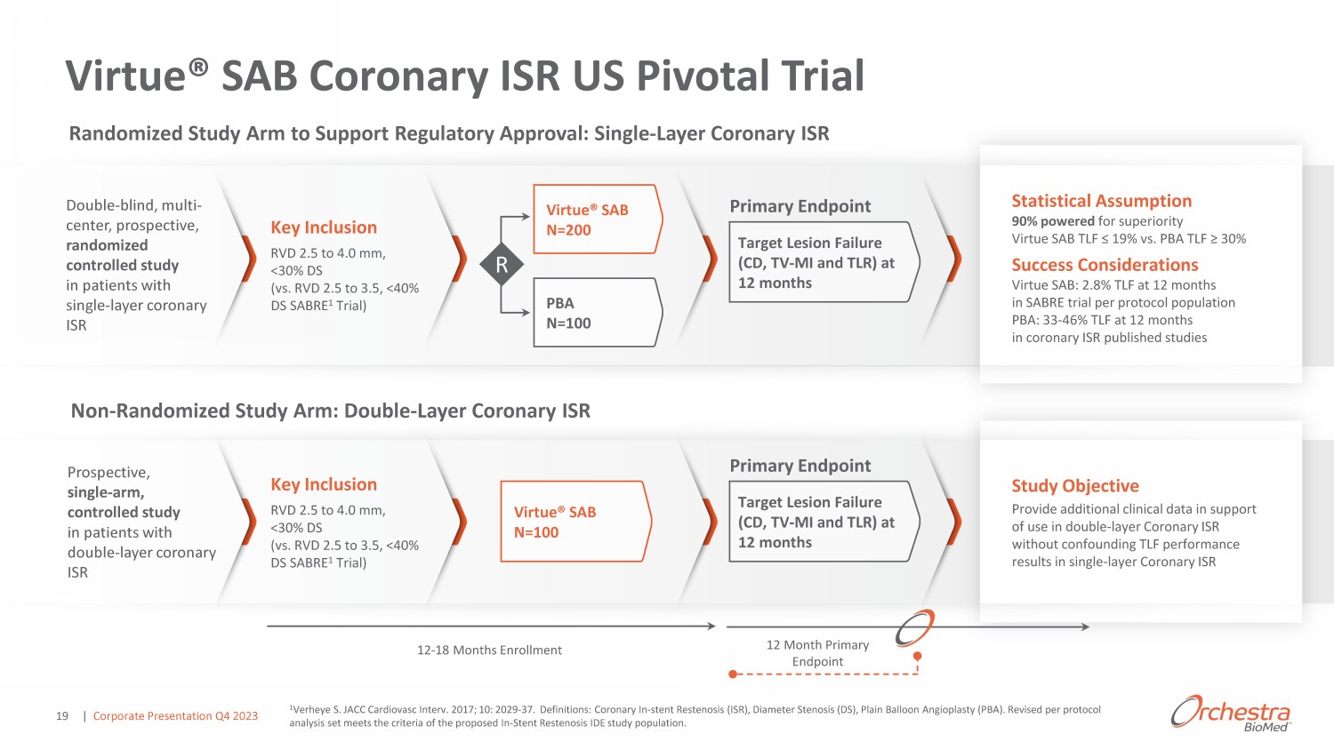 Compelling SABRE Trial Results in Coronary ISR Patients ϭ s ƌŚ LJ ƚ ů͘ : ƌĚŝŽǀ Ɛ /Ŷƚ ƌǀ ϮϬϭϳ K ƚ Ϯϯ ͖ ϭϬ ; ϮϬ Ϳ͗ ϮϬϮϵ Ͳ ϮϬϯϳ ͘ K/͗ ϭϬ͘ϭϬϭϲ ͬũ͘ũ ŝŶ͘ ϮϬϭϳ͘Ϭϲ͘ϬϮϭ ͘ Ϯ 'ƌ Ŷ Ě ϯ Ͳ z ƌ ůŝŶŝ ů Z ƐƵůƚƐ d d ϮϬϭϴ ͘ ϯ Ͳ z ƌ ^ Z dƌŝ ů ůŝŶŝ ů Z ƉŽƌƚ ŽŶ Ĩŝů ͘ ĨŝŶŝƚŝŽŶƐ͗ d ƌŐ ƚ ů ƐŝŽŶ Ĩ ŝůƵƌ ;d>&Ϳ͕ ů ƚ ůƵŵ Ŷ ůŽƐƐ ;>>>Ϳ͕ ƚ ƌŐ ƚ ů ƐŝŽŶ ƌ ǀ Ɛ Ƶů ƌŝnj ƚŝŽŶ ;d>ZͿ ŶĚ DLJŽ ƌĚŝ ů /ŶĨ ƌ ƚŝŽŶ ;D/Ϳ͘ Demonstrated Preliminary Safety Data with Low Safety Event Rates Out to 3 Years 2 Preliminary Efficacy Results Showed Low 0.12mm Late Loss Virtue® SAB preliminarily demonstrated encouraging safety and efficacy results in patients with coronary in - stent restenosis (ISR) in prospective, multi - center SABRE Trial 1 0.12mm LLL at 6 - months 2.8% Target Lesion Failure at 1 year Ϭ й E ǁ d>Z ď ƚǁ Ŷ ϭ ƚŽ ϯ LJ ƌƐ 5.6% Ϯ͘ϴ й 2.8% 2.8% 0% 0% 0% Ϭ й 0% Ϭ й 0% 2.8% Cardiac Death TV - MI TLR d>& Event Rates (%) ϯϬ Ě LJƐ ϭ Ͳ LJ ƌ ϯ Ͳ LJ ƌƐ Per Protocol 4 n 36 Reference Vessel Dianeter (RVD) mm 1 2.52 ц 0.32 Minimum Lumen Diameter (MLD) mm 1.96 ц 0.32 % Diameter Stenosis 22.3 ц 9.4 Change in % Diameter Stenosis 5.2 ц 11.4 Late Lumen Loss (LLL) mm 2 0.12 ц 0.33 Binary Restenosis 3 2.8% 1 RVD reported using Internormal values; 2 Trial primary performance endpoint; 3 Trial secondary performance endpoint (binary restenosis = >50% lumen diameter stenosis). 4 Data is based on per protocol population criteria revised to be consistent with proposed Virtue ISR - US pivotal study population. | Corporate Presentation Q4 2023 18