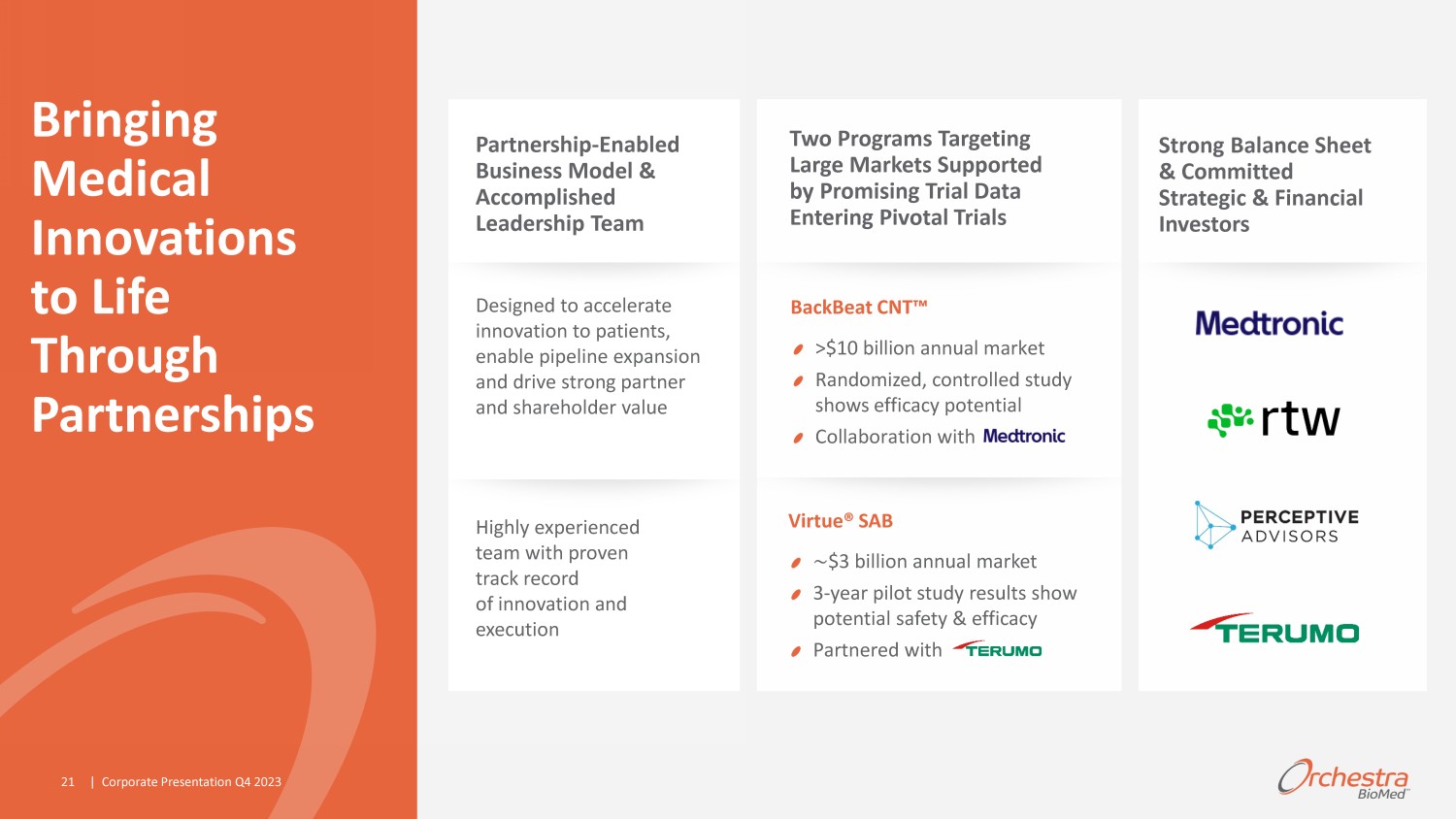 Upcoming Anticipated Milestones BackBeat CNT HTN + Pacemaker 1 st Pt. Enrollment Planned Regulatory Milestones Planned Clinical Milestones ƚ Ed ,dE н W ŵ ƌ & / ƉƉƌŽǀ ů Virtue SAB Virtue - ISR US FDA IDE Approval Japan PMDA CTN Coronary ISR Approval 1 Japan PMDA CTN Coronary SV Approval 1 ϭ dŝŵŝŶŐ Ɛƚŝŵ ƚ Ě ŶĚ ƐƵďũ ƚ ƚŽ d ƌƵŵŽ dž ƵƚŝŽŶ ƐŝŶ d ƌƵŵŽ ŽŶƚƌŽůƐ Ě ǀ ůŽƉŵ Ŷƚ ŽĨ sŝƌƚƵ ^ ĨŽƌ ^s ŝŶĚŝ ƚŝŽŶ ŶĚ ĨŽƌ /^ Z ŝ Ŷ : Ɖ Ŷ͖ Ύ/Ŷŝƚŝ ƚŝŽŶ ŽĨ ƚŚ sŝƌƚƵ /^Z Ͳ h^ ƉŝǀŽƚ ů ƐƚƵĚLJ ǁŝůů ď ƉŽƐƚƉŽŶ Ě ƵŶƚŝů ϮϬϮϰ ǁŚŝů Kƌ Ś Ɛƚƌ ŝŽD Ě ŶĚ d ƌƵŵŽ ůŝŐŶ ŽŶ Ɖ ƌƚŶ ƌƐŚŝƉ ƌ ƐƚƌƵ ƚƵƌŝŶŐ͘ /Ĩ Ŷ ŐŽƚŝ ƚŝŽŶƐ ƌ ŶŽƚ ŽŵƉů ƚ Ě ƚŽ ƚŚ Ɛ ƚŝƐĨ ƚŝŽŶ ŽĨ Kƌ Ś Ɛƚƌ ŝŽD Ě Žƌ ƚŽ ƚŚ Ɛ ƚŝƐĨ ƚŝŽŶ ŽĨ d ƌƵŵŽ͕ ůŝŶŝ ů ŶĚ Ě ǀ ůŽƉŵ Ŷƚ ĨĨŽƌƚƐ͕ ŶĚ Žŵ ŵ ƌ ŝ ůŝnj ƚŝŽŶ Ɖů ŶƐ ĨŽƌ sŝƌƚƵ ^ ŶĚͬŽƌ ƚŚ Kƌ Ś Ɛƚƌ ŝŽD Ě ƌ ů ƚŝŽŶƐŚŝƉ ǁŝƚŚ d ƌƵŵŽ ŵ LJ ŽŶƚŝŶƵ ƚŽ ď Ěǀ ƌƐ ůLJ ŝŵƉ ƚ Ě͘ Virtue SAB Virtue - ISR US 1st Pt. Enrollment* CNT - HF and SirolimusEFR Program Updates | Corporate Presentation Q4 2023 20