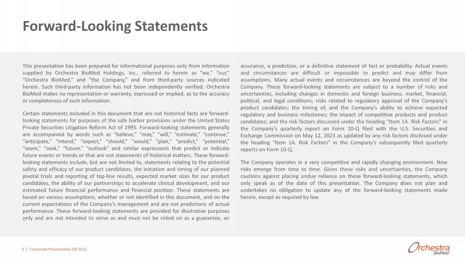 | Corporate Presentation Q4 2023 2 This presentation has been prepared for informational purposes only from information supplied by Orchestra BioMed Holdings, Inc . , referred to herein as “we,” “our,” “Orchestra BioMed,” and “the Company,” and from third - party sources indicated herein . Such third - party information has not been independently verified . Orchestra BioMed makes no representation or warranty, expressed or implied, as to the accuracy or completeness of such information . Certain statements included in this document that are not historical facts are forward - looking statements for purposes of the safe harbor provisions under the United States Private Securities Litigation Reform Act of 1995 . Forward - looking statements generally are accompanied by words such as “believe,” “may,” “will,” “estimate,” “continue,” “anticipate,” “intend,” “expect,” “should,” “would,” “plan,” “predict,” “potential,” “seem,” “seek,” “future,” “outlook” and similar expressions that predict or indicate future events or trends or that are not statements of historical matters . These forward - looking statements include, but are not limited to, statements relating to the potential safety and efficacy of our product candidates, the initiation and timing of our planned pivotal trials and reporting of top - line results, expected market sizes for our product candidates, the ability of our partnerships to accelerate clinical development, and our estimated future financial performance and financial position . These statements are based on various assumptions, whether or not identified in this document, and on the current expectations of the Company’s management and are not predictions of actual performance . These forward - looking statements are provided for illustrative purposes only and are not intended to serve as and must not be relied on as a guarantee, an assurance, a prediction, or a definitive statement of fact or probability . Actual events and circumstances are difficult or impossible to predict and may differ from assumptions . Many actual events and circumstances are beyond the control of the Company . These forward - looking statements are subject to a number of risks and uncertainties, including changes in domestic and foreign business, market, financial, political, and legal conditions ; risks related to regulatory approval of the Company’s product candidates ; the timing of, and the Company’s ability to achieve expected regulatory and business milestones ; the impact of competitive products and product candidates ; and the risk factors discussed under the heading “Item 1 A . Risk Factors” in the Company’s quarterly report on Form 10 - Q filed with the U . S . Securities and Exchange Commission on May 12 , 2023 as updated by any risk factors disclosed under the heading “Item 1 A . Risk Factors” in the Company’s subsequently filed quarterly reports on Form 10 - Q . The Company operates in a very competitive and rapidly changing environment . New risks emerge from time to time . Given these risks and uncertainties, the Company cautions against placing undue reliance on these forward - looking statements, which only speak as of the date of this presentation . The Company does not plan and undertakes no obligation to update any of the forward - looking statements made herein, except as required by law . Forward - Looking Statements