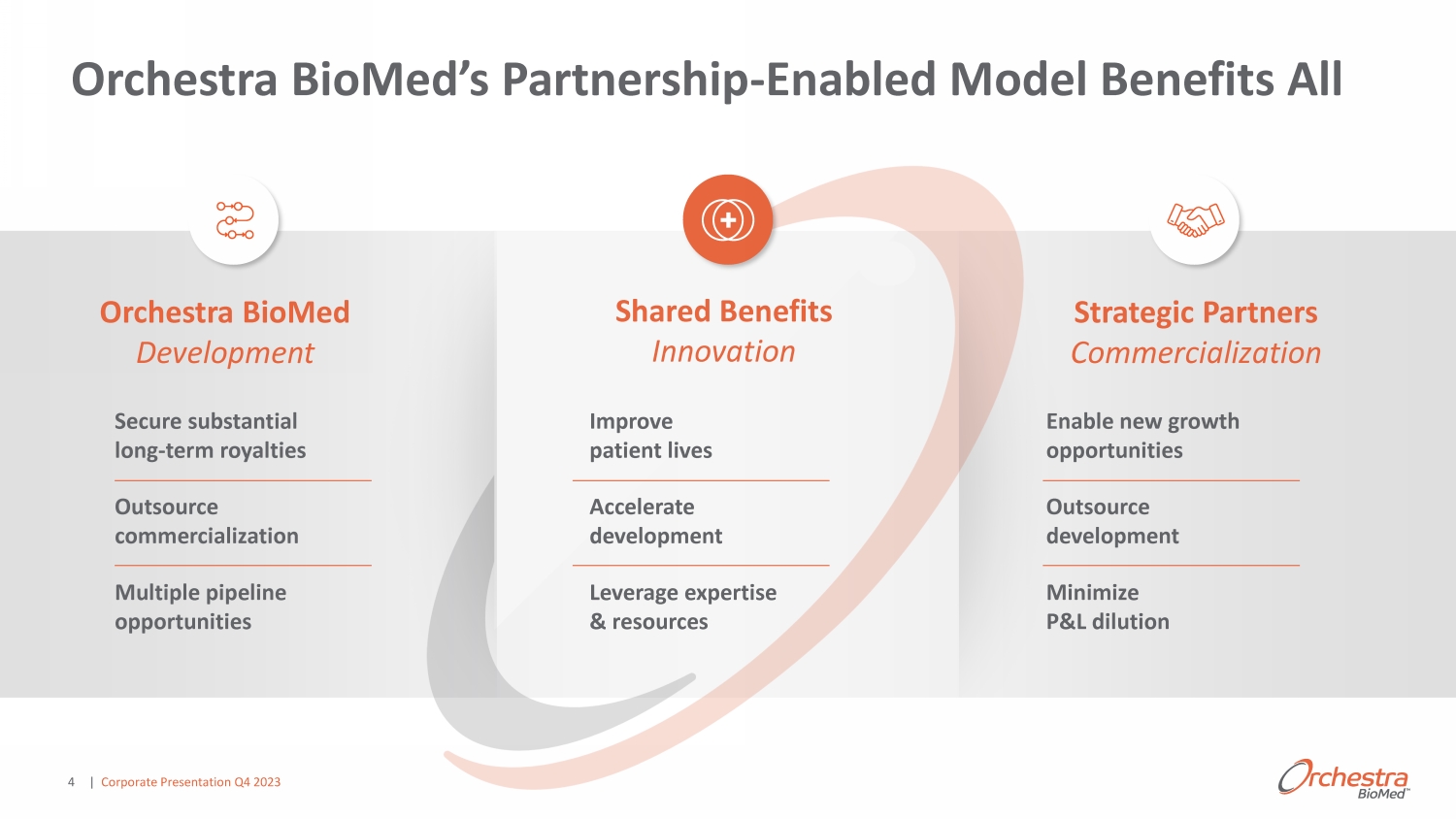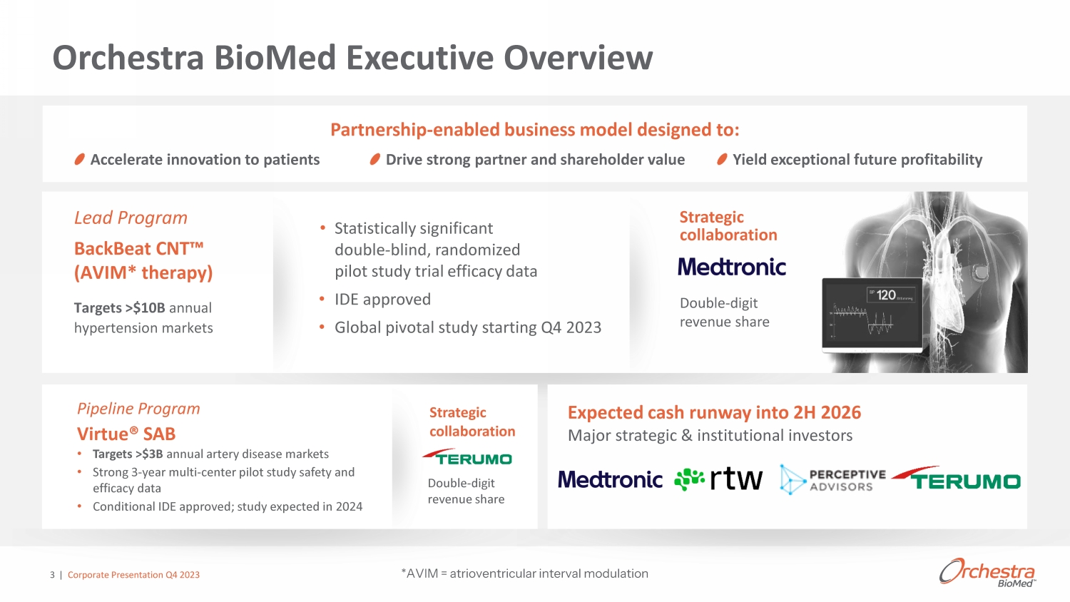 3 Expected c ash runway into 2H 2026 Major strategic & institutional investors • Statistically significant double - blind, randomized pilot study trial efficacy data • IDE approved • Global pivotal study starting Q4 2023 >ĞĂĚWƌŽŐƌĂŵ ĂĐŬĞĂƚEd Ρ ;s/DΎƚŚĞƌĂƉLJͿ dĂƌŐĞƚƐхΨ ϭϬ ĂŶŶƵĂů ŚLJƉĞƌƚĞŶƐŝŽŶŵĂƌŬĞƚƐ Strategic collaboration Orchestra BioMed Executive Overview | Corporate Presentation Q4 2023 Pipeline Program Virtue® SAB • Targets >$3B annual artery disease markets • Strong 3 - year multi - center pilot study safety and efficacy data • Conditional IDE approved ; study expected in 2024 Partnership - enabled business model designed to: Accelerate innovation to patients ƌŝǀĞƐƚƌŽŶŐƉĂƌƚŶĞƌĂŶĚƐŚĂƌĞŚŽůĚĞƌǀĂůƵĞ Yield exceptional future profitability Strategic collaboration Double - digit revenue share Double - digit revenue share *AVIM = atrioventricular interval modulation