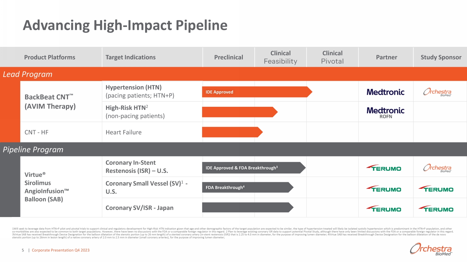 1 Will seek to leverage data from HTN+P pilot and pivotal trials to support clinical and regulatory development for High - Risk HTN indication given that age and other demographic factors of the target population are expected to be similar, the type of hype rte nsion treated will likely be isolated systolic hypertension which is predominant in the HTN+P population, and other co - morbidities are also expected to be common to both target populations. However, there have been no discussions with the FDA o r a comparable foreign regulator in this regard. 2 Plan to leverage existing coronary ISR data to support potential Pivotal Study, although there have only been limited discuss ion s with the FDA or a comparable foreign regulator in this regard. 3Virtue SAB has received Breakthrough Device Designation for the balloon dilatation of the stenotic portion (up to 26 mm leng th) of a stented coronary artery (in - stent restenosis (ISR)) that is 2.25 to 4.0 mm in diameter, for the purpose of improving lumen diameter; 4Virtue SAB has received Breakthrough Device Designation for the balloon dilatation of the de novo stenotic portion (up to 26mm in lesion length) of a native coronary artery of 2.0 mm to 2.5 mm in diameter (small coronary ar ter ies), for the purpose of improving lumen diameter; Product Platforms Target Indications Preclinical Clinical Feasibility Clinical Pivotal Partner Study Sponsor Lead Program BackBeat CNT Ρ (AVIM Therapy) Hypertension (HTN) (pacing patients; HTN+P) High - Risk HTN 2 (non - pacing patients) ROFN CNT - HF Heart Failure WŝƉĞůŝŶĞWƌŽŐƌĂŵ Virtue® Sirolimus AngioInfusion Ρ Balloon (SAB) Coronary In - Stent Restenosis (ISR) – U.S. Coronary Small Vessel (SV) 1 - U.S. Coronary SV/ISR - Japan IDE Approved & FDA Breakthrough 3 FDA Breakthrough 4 IDE Approved 5 Advancing High - Impact Pipeline | Corporate Presentation Q4 2023
