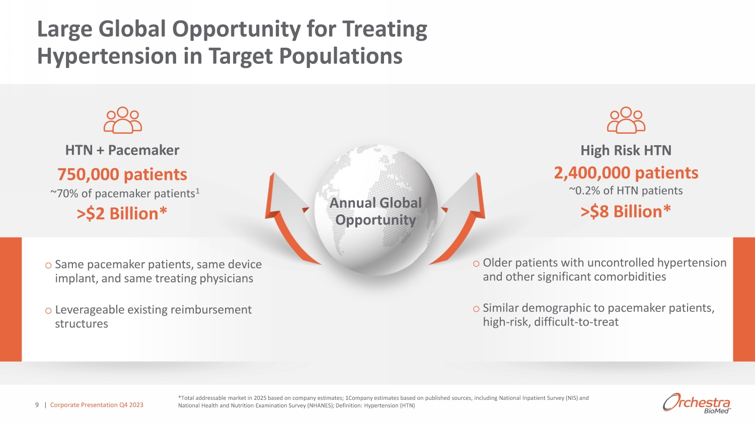 AVIM Therapy Overview 1 Company estimates based on published sources, including National Inpatient Survey (NIS) and National Health and Nutrition Exa min ation Survey (NHANES) Collaboration with 8 Hypertension is the leading global risk factor for death and #1 comorbidity in the pacemaker population (over 70%) 1 Unmet Need Pacemaker - delivered therapy designed to immediately, persistently and substantially lower blood pressure Over 750K patients annually receiving pacemakers also have hypertension Opportunity Innovation | Corporate Presentation Q4 2023