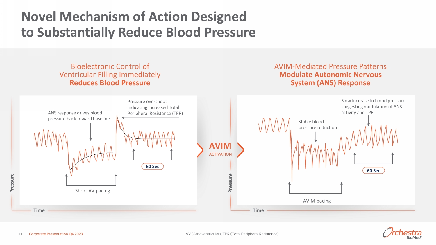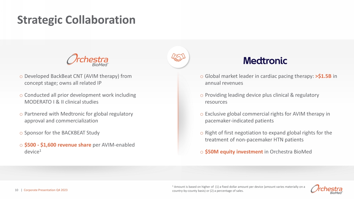 o Developed BackBeat CNT (AVIM therapy) from concept stage; owns all related IP o Conducted all prior development work including MODERATO I & II clinical studies o Partnered with Medtronic for global regulatory approval and commercialization o Sponsor for the BACKBEAT Study o $500 - $1,600 revenue share per AVIM - enabled device 1 10 o Global market leader in cardiac pacing therapy: >$1.5B in annual revenues o Providing leading device plus clinical & regulatory resources o Exclusive global commercial rights for AVIM therapy in pacemaker - indicated patients o Right of first negotiation to expand global rights for the treatment of non - pacemaker HTN patients o $50M equity investment in Orchestra BioMed 1 Amount is based on higher of (1) a fixed dollar amount per device (amount varies materially on a country - by - county basis) or (2) a percentage of sales. Strategic Collaboration | Corporate Presentation Q4 2023