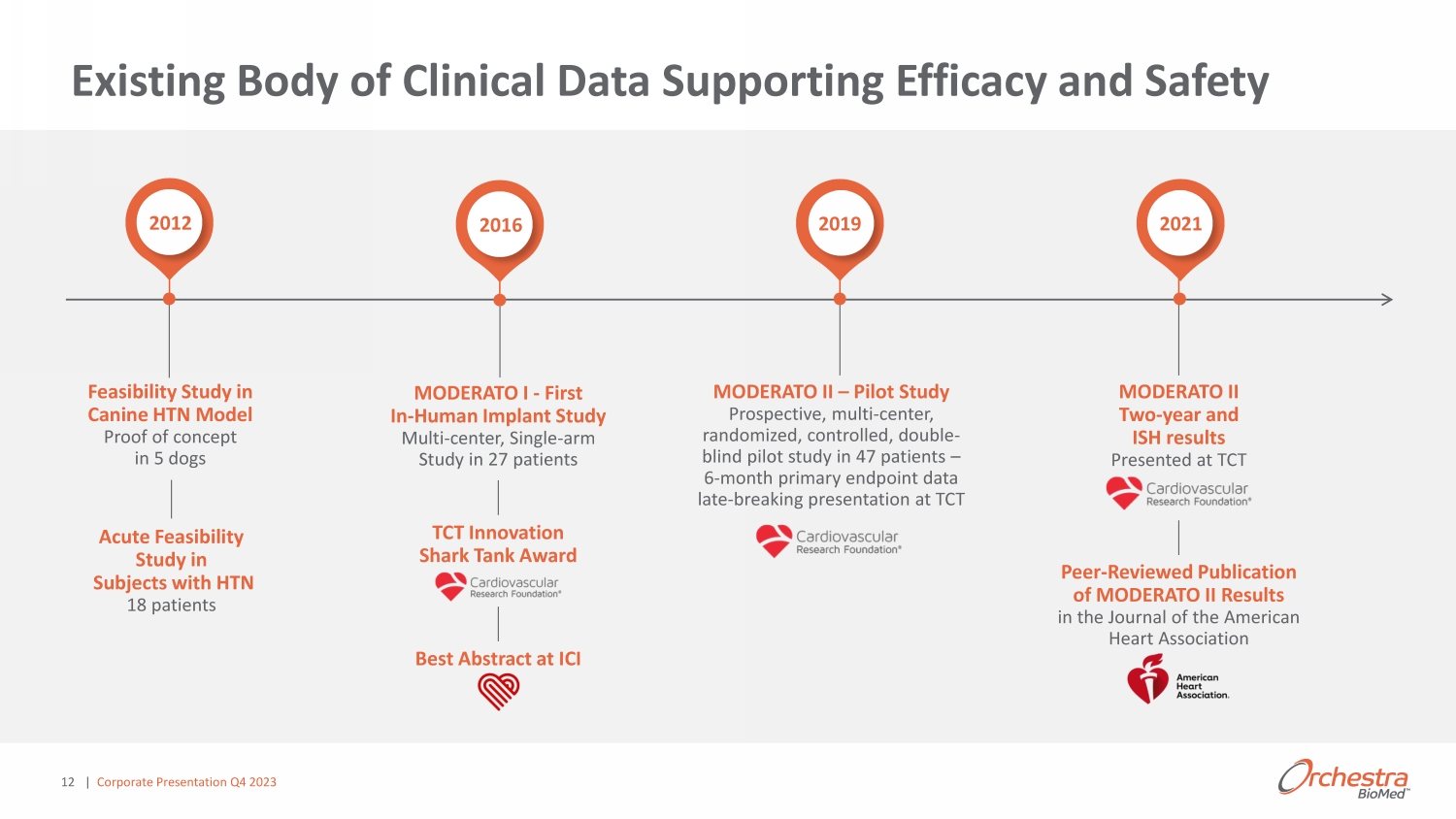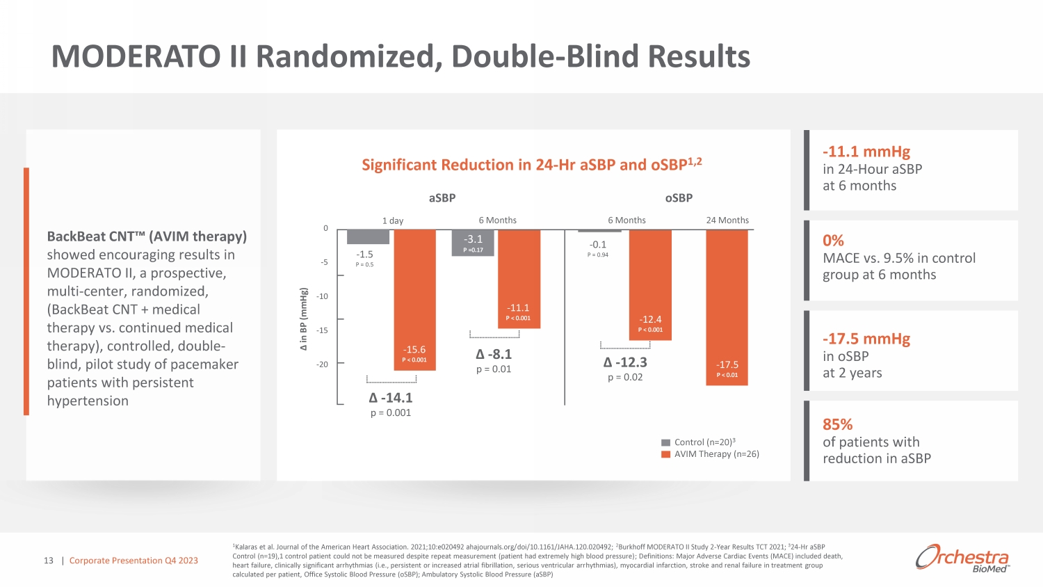 12 Feasibility Study in Canine HTN Model Proof of concept in 5 dogs Acute Feasibility Study in Subjects with HTN 18 patients 2012 ϮϬϭϲ MODERATO II – Pilot Study Prospective, multi - center, randomized, controlled, double - blind pilot study in 47 patients – 6 - month primary endpoint data late - breaking presentation at TCT ϮϬϭϵ MODERATO I - First In - Human Implant Study Multi - center, Single - arm Study in 27 patients TCT Innovation Shark Tank Award Best Abstract at ICI MODERATO II Two - year and ISH results Presented at TCT Peer - Reviewed Publication of MODERATO II Results in the Journal of the American Heart Association Existing Body of Clinical Data Supporting Efficacy and Safety | Corporate Presentation Q 4 2023